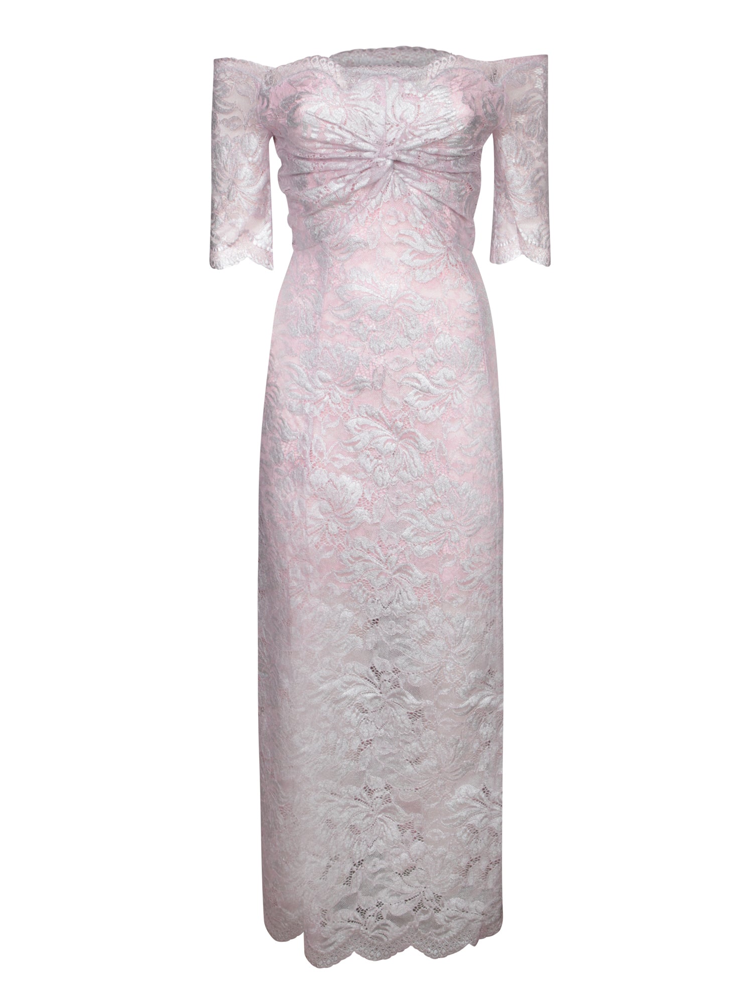 Long lace dress with a central decorative knot and three-quarter sleeves.