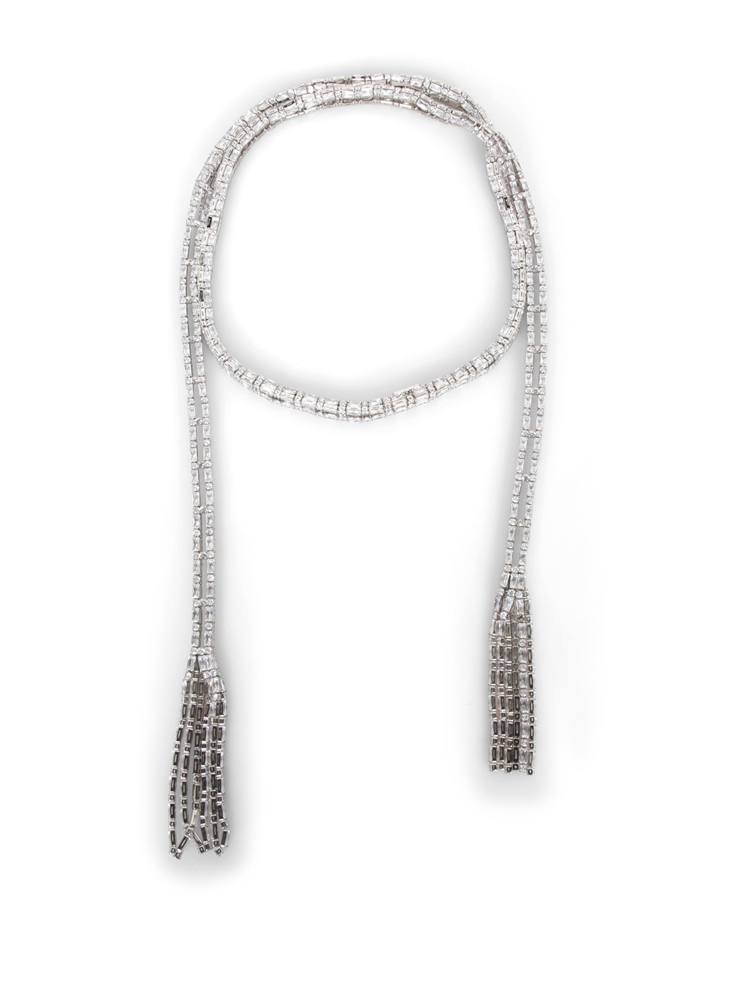 Long rhinestone necklace. Fringed pendant detail.