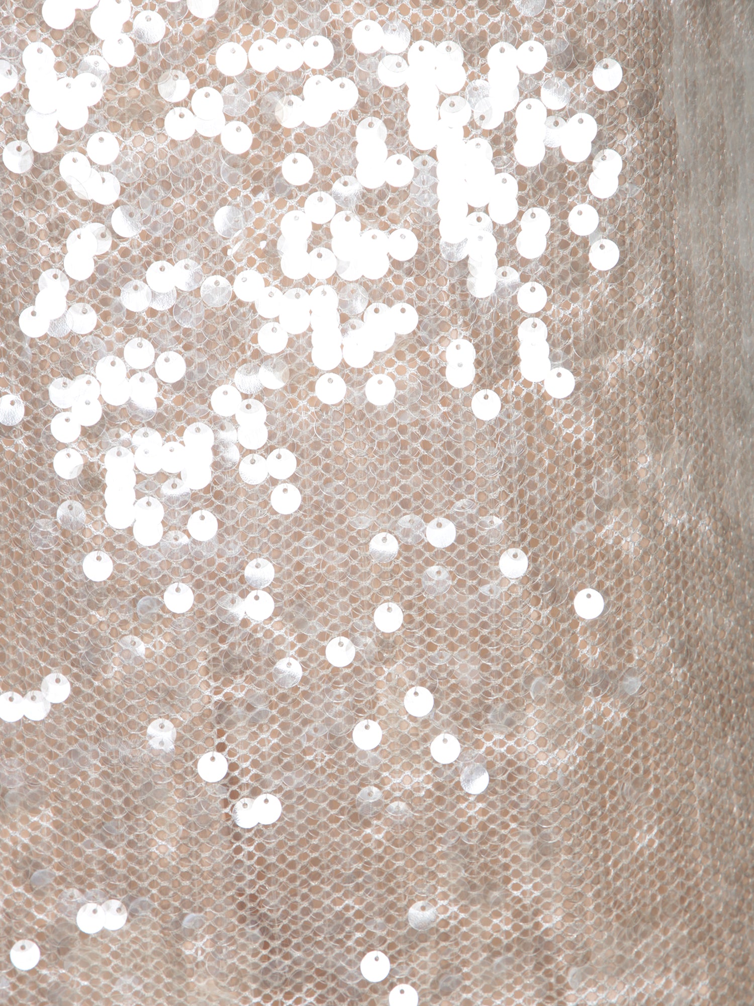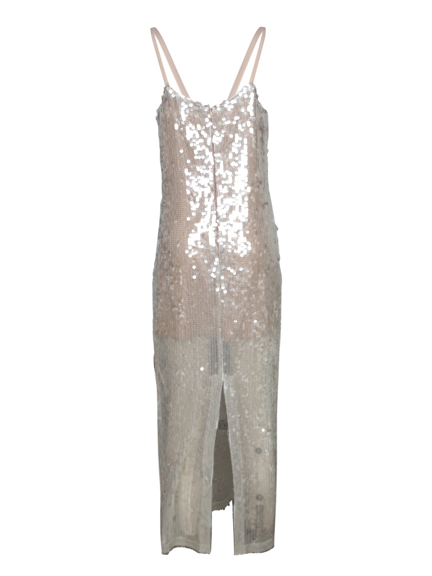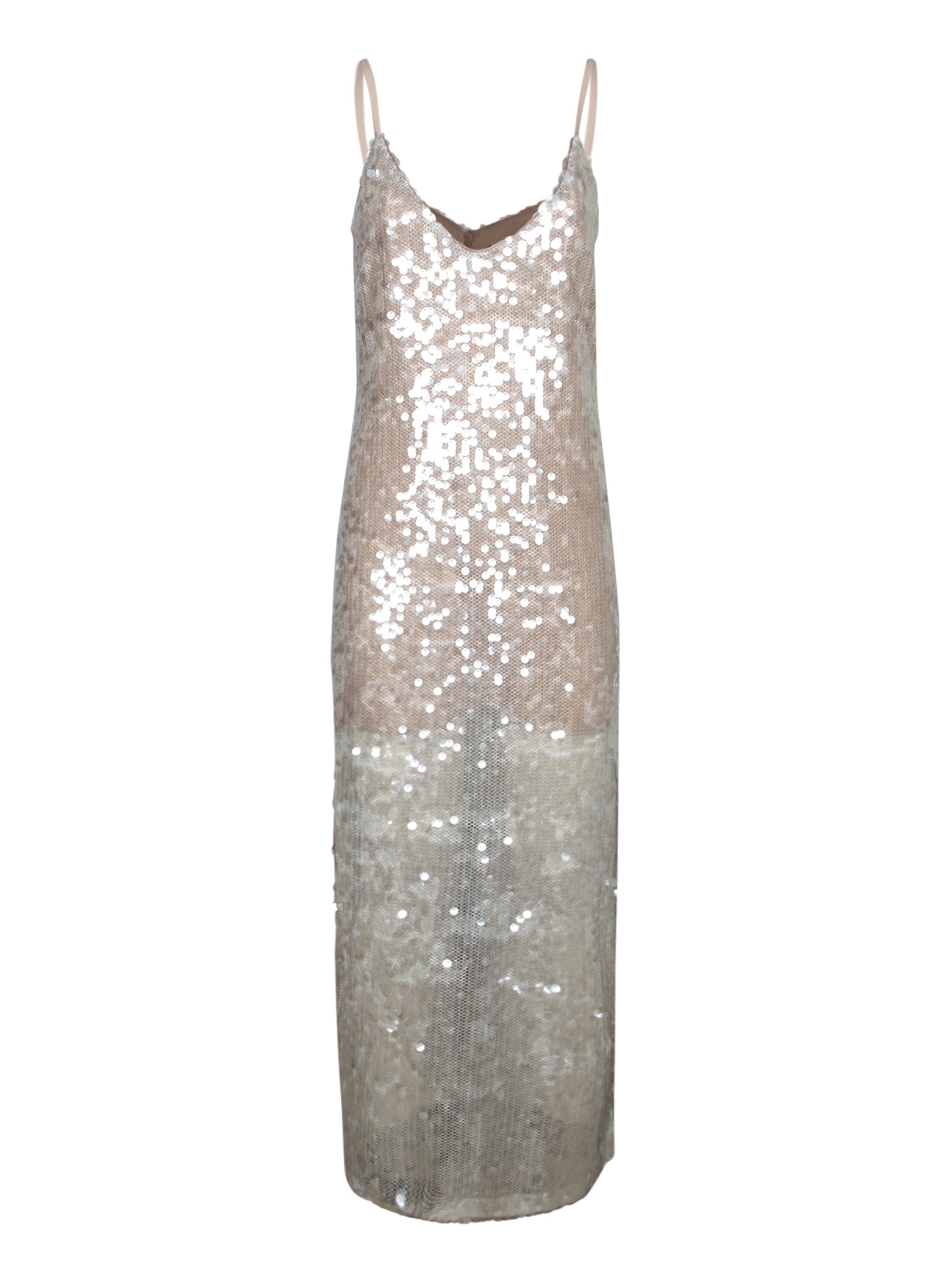 Long mesh dress adorned with silver sequins. Features thin straps and a V-neckline.