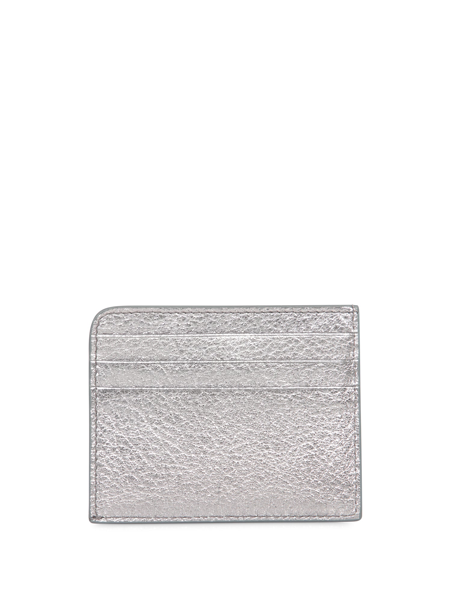 Metallic leather card holder. Silver finish. Card slots and a central compartment.