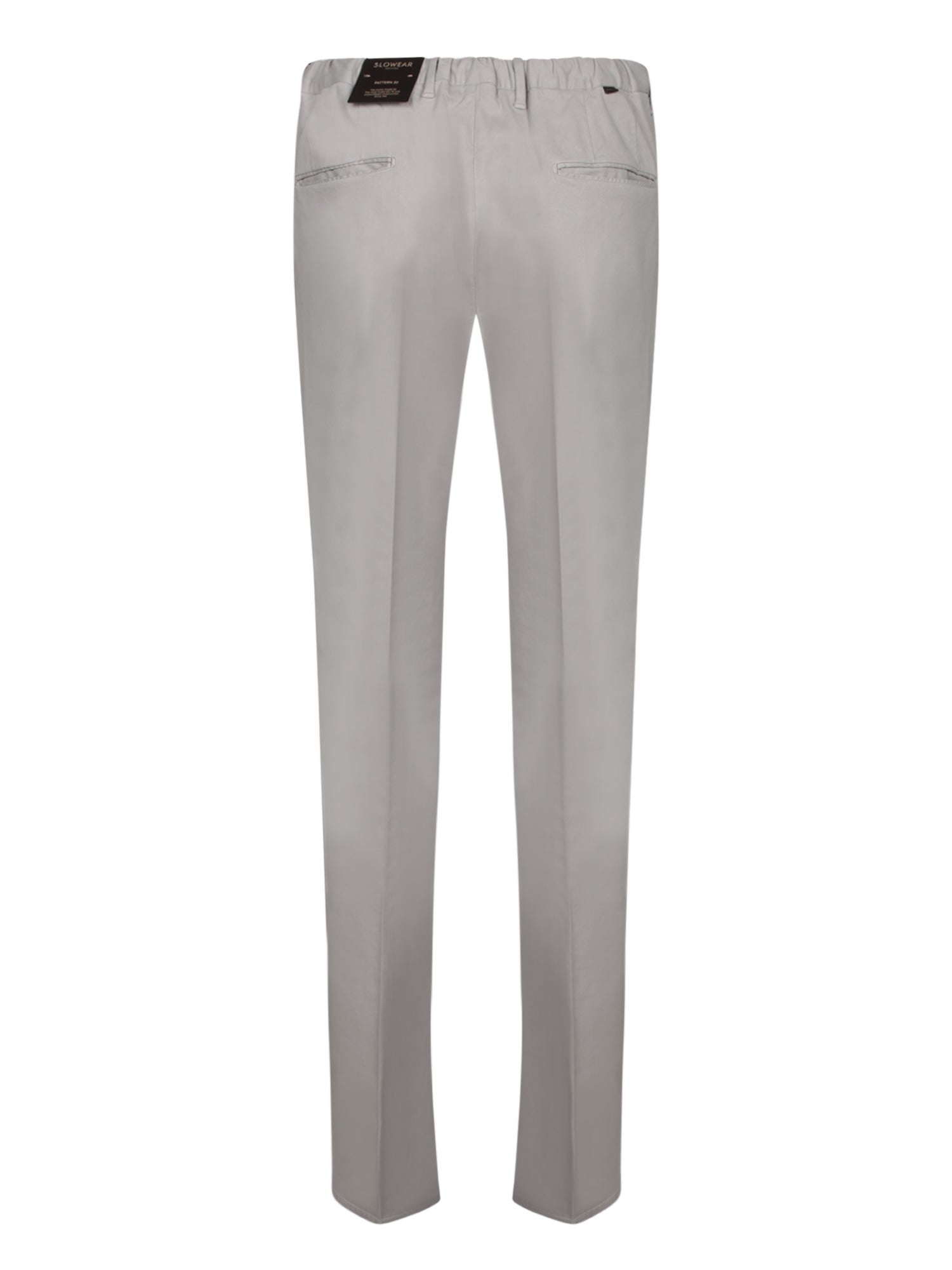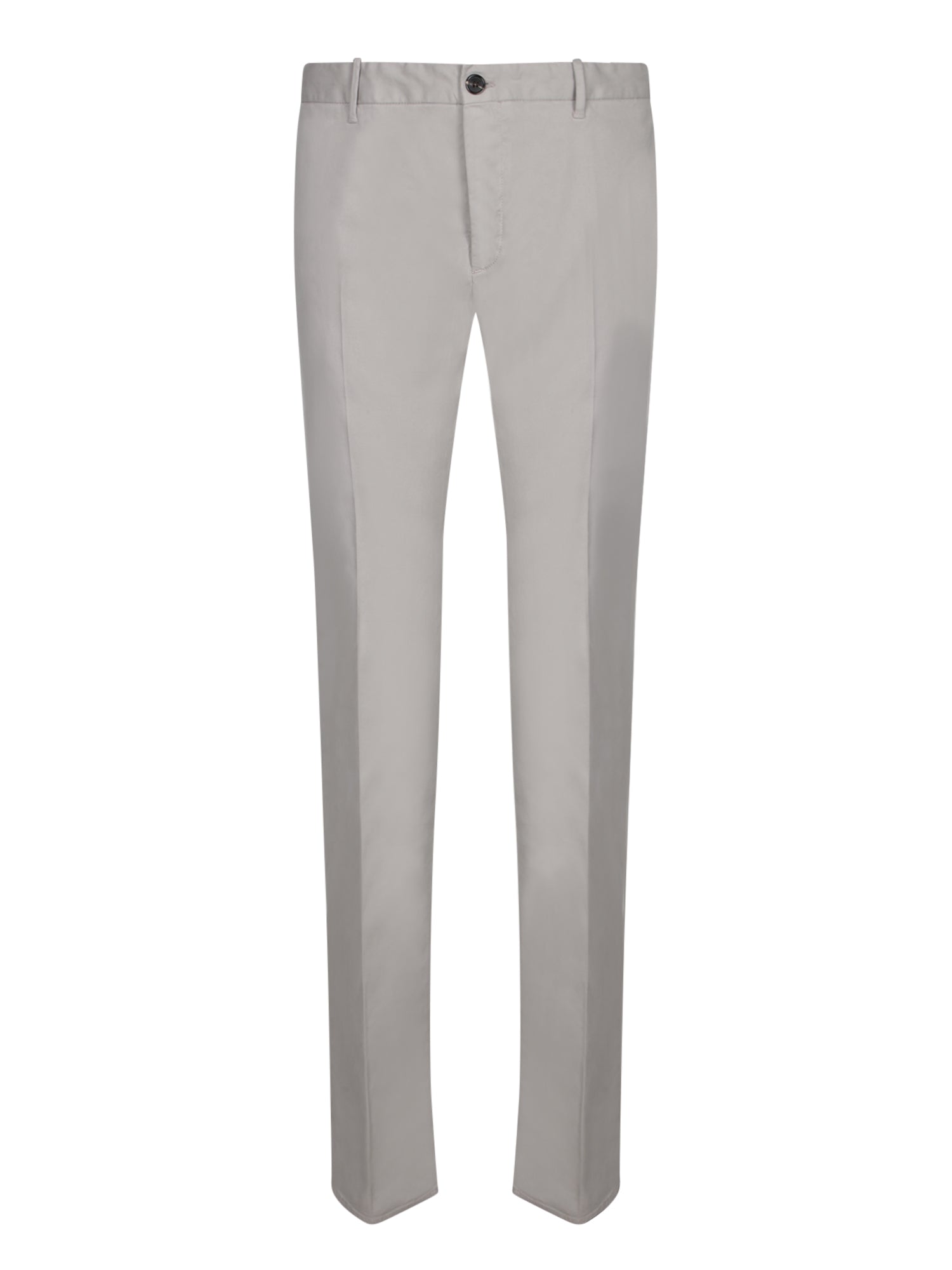 Regular waist with zip and button closure. Side and recessed back pockets. Slim fit cut.