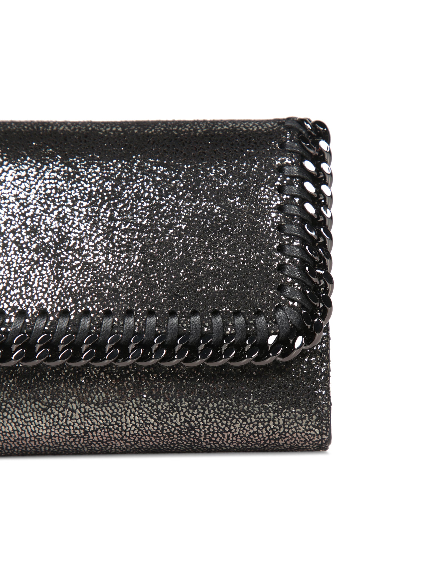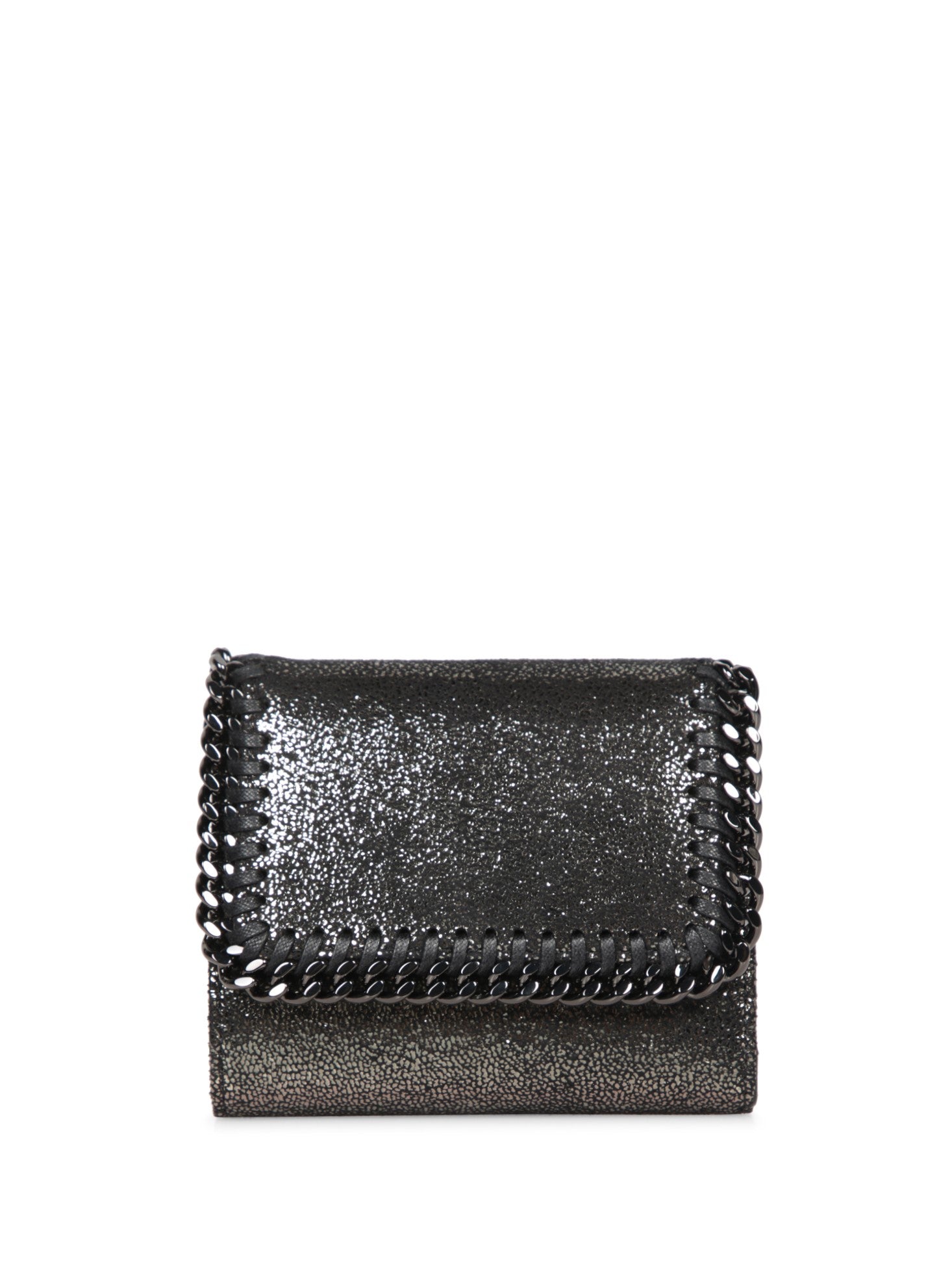 The Stella McCartney Small Flap Wallet blends elegance with practicality. Crafted in black metallic faux leather, it features a glossy finish with iconic chain details, perfect for a sophisticated evening look.