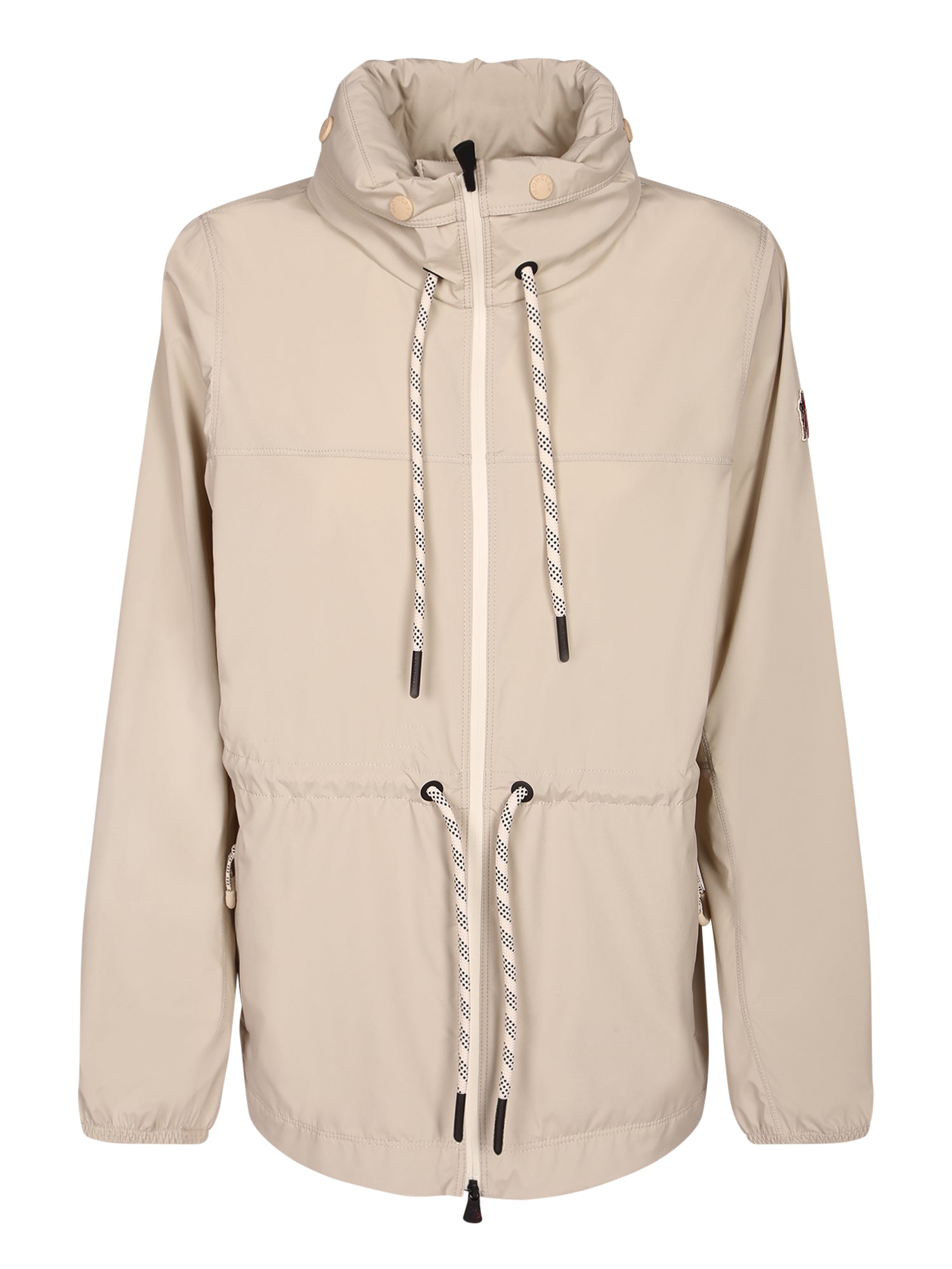 Waterproof technical fabric. Zip and button closure. Adjustable hood.