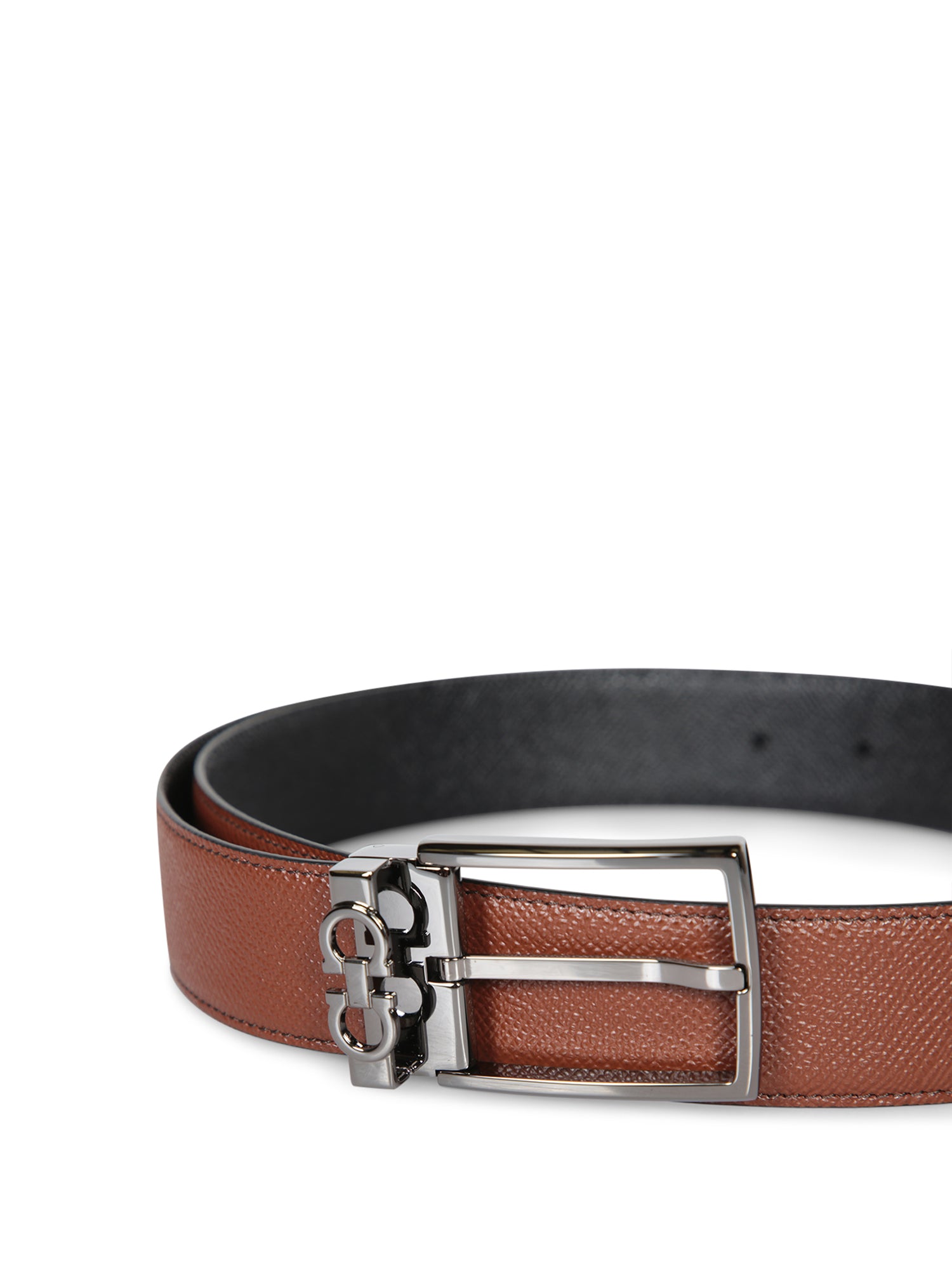 This elegant Ferragamo belt, crafted in fine Radica black leather, is distinguished by a metallic square buckle and single loop, enhanced by the contrasting logo detail.
