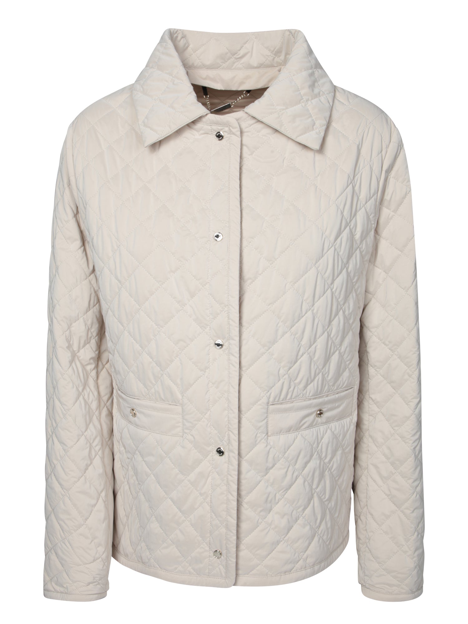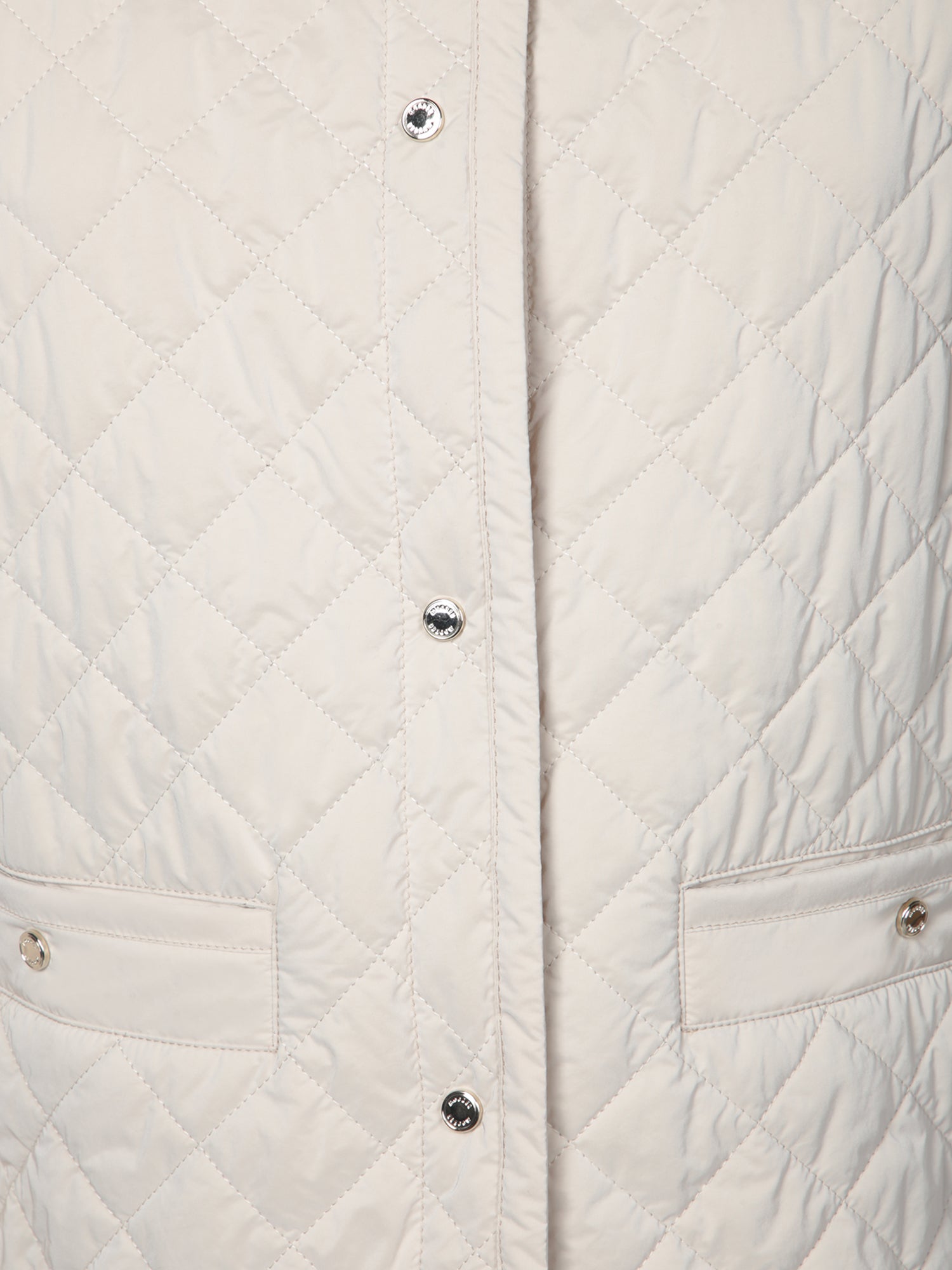 Light quilted jacket. Classic collar and front button closure. Welt pockets with button.