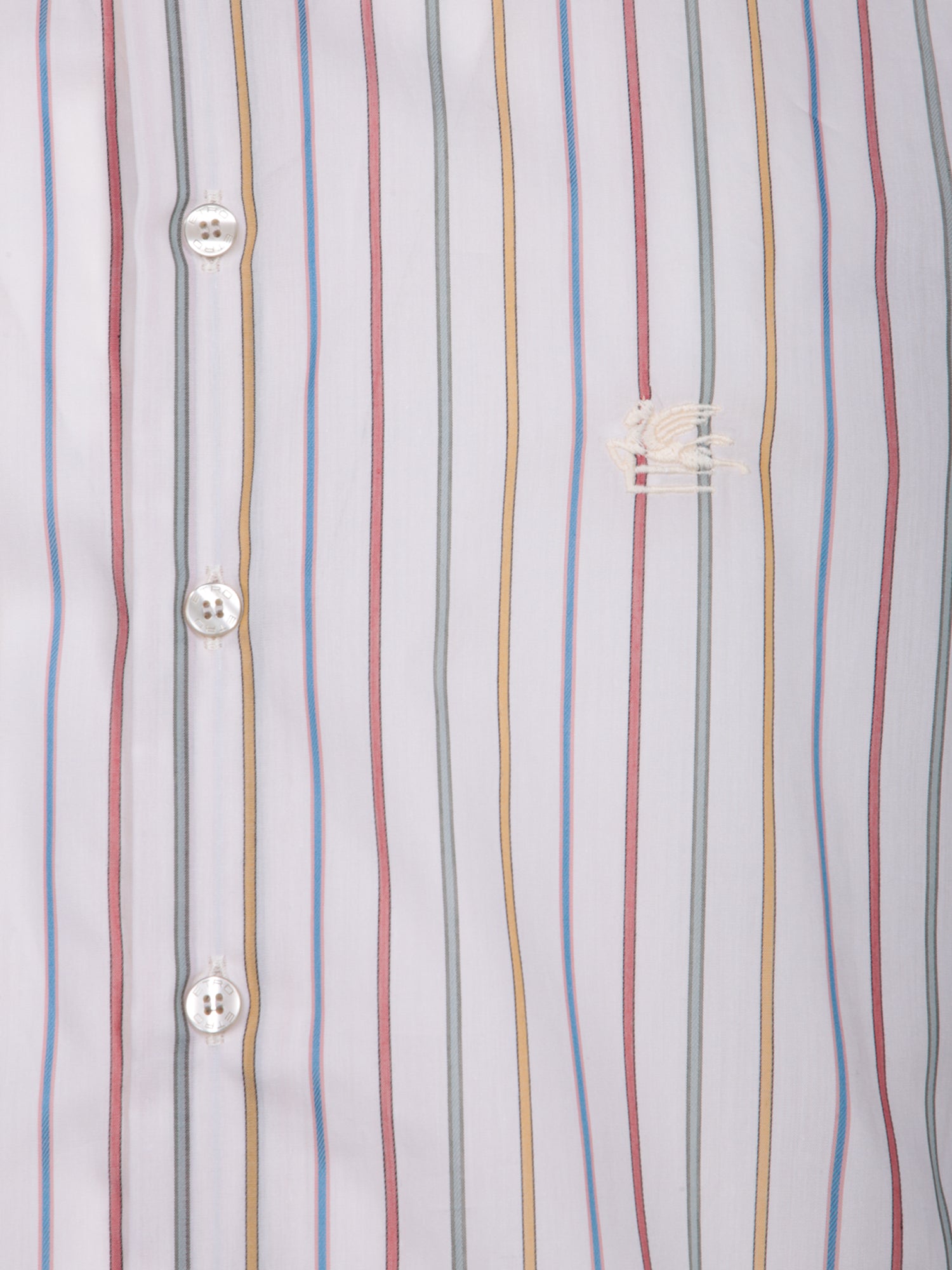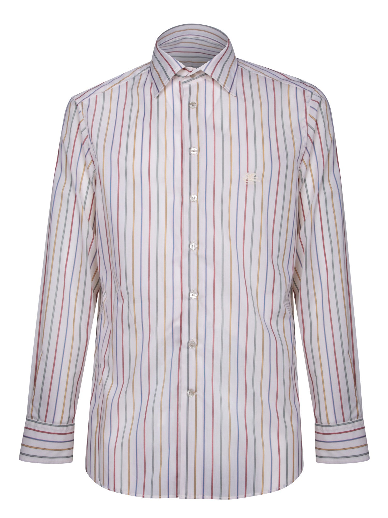 Long sleeves. Shirt neck. Front button fastening. All-over multicolor striped.