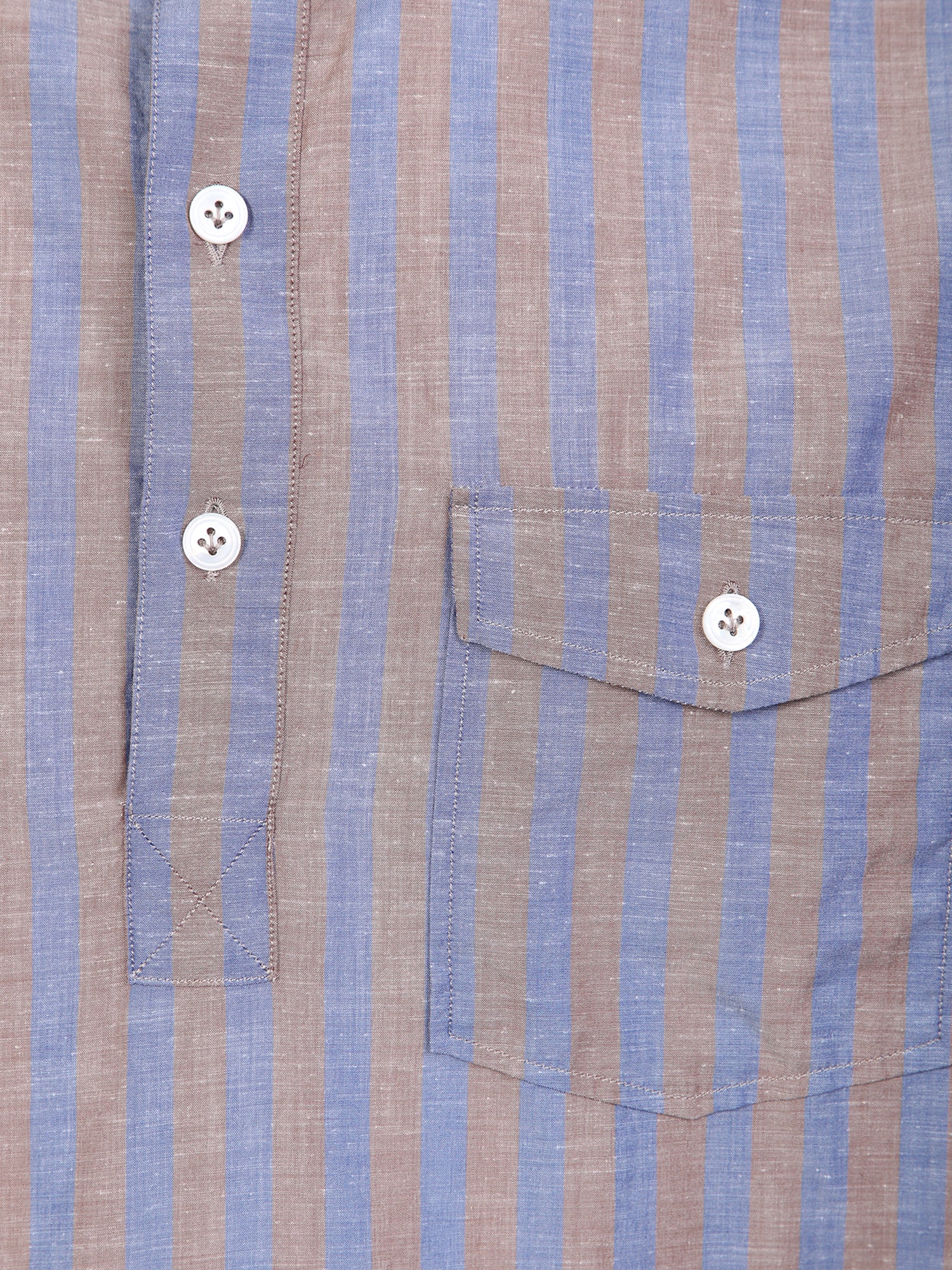 Classic collar. Long sleeves. Front button placket. Chest flap pocket. Vertical stripe pattern. Color: Blue/ chamoisee