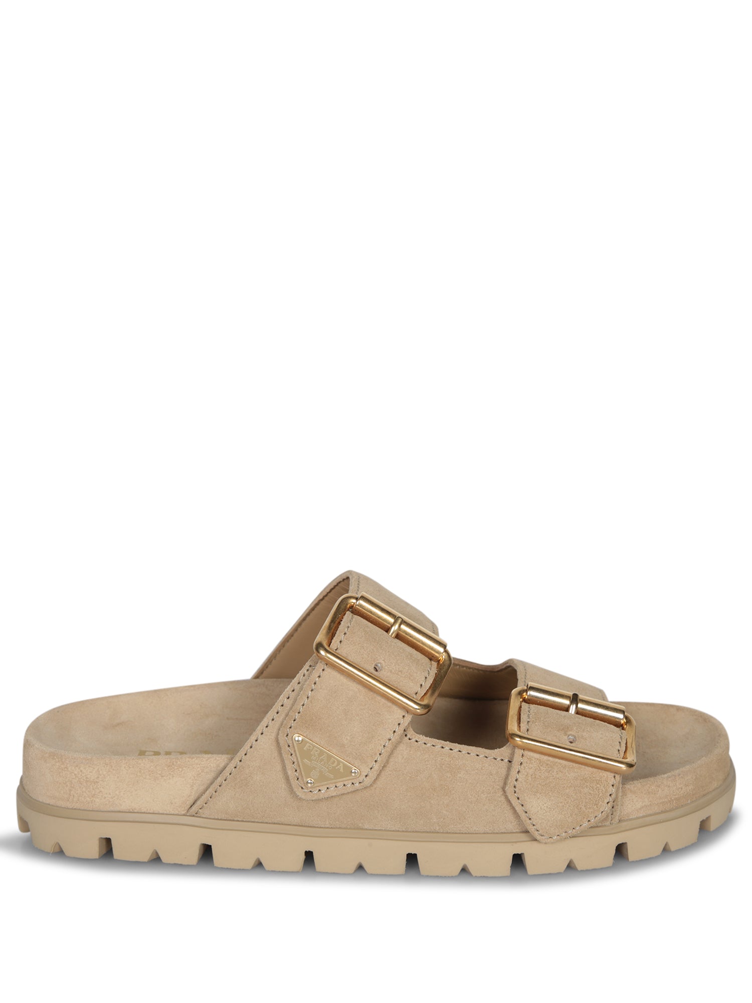 Suede sandals with double golden buckle. Prada logo engraved on triangular plaque. Molded rubber sole.