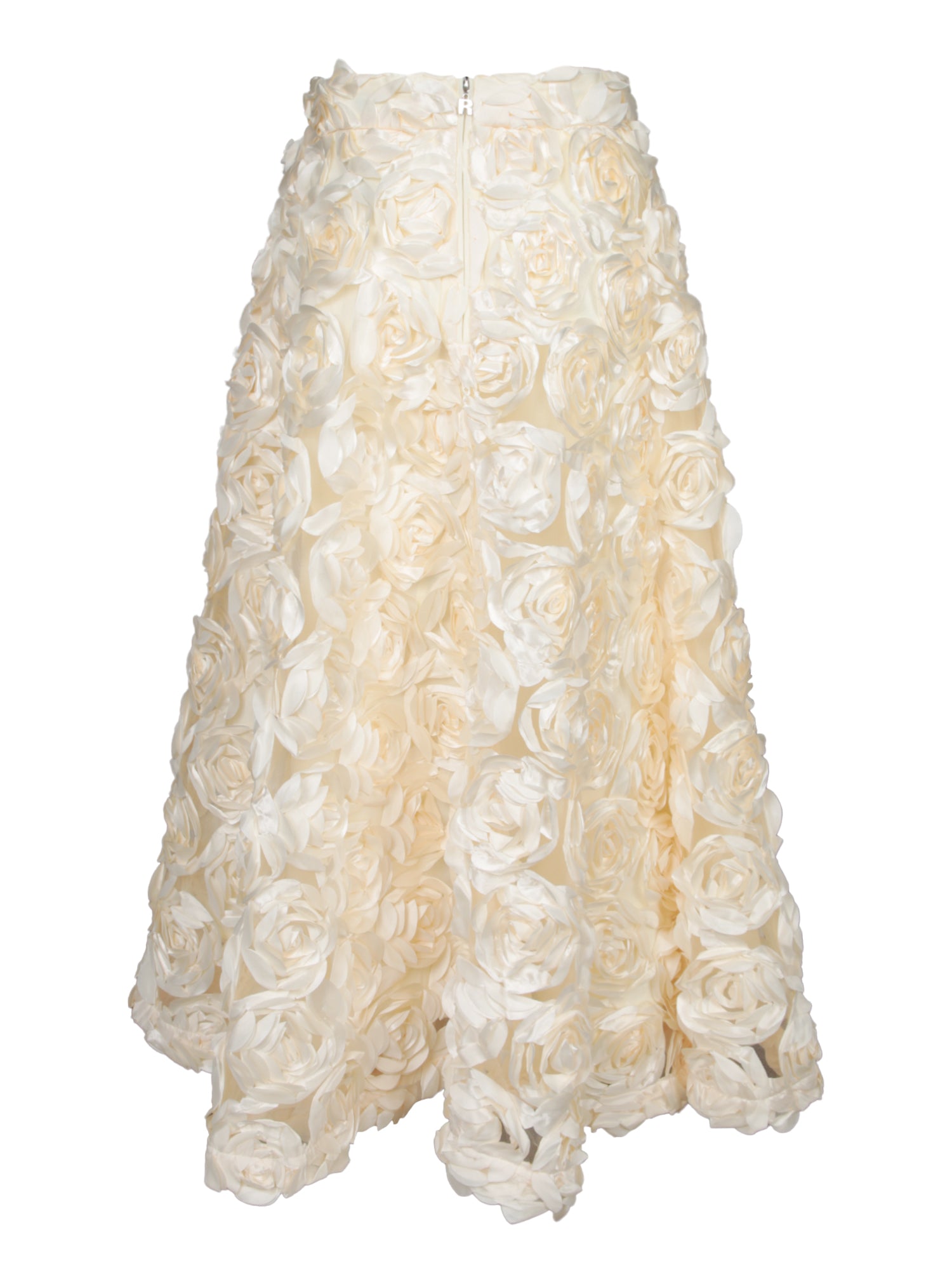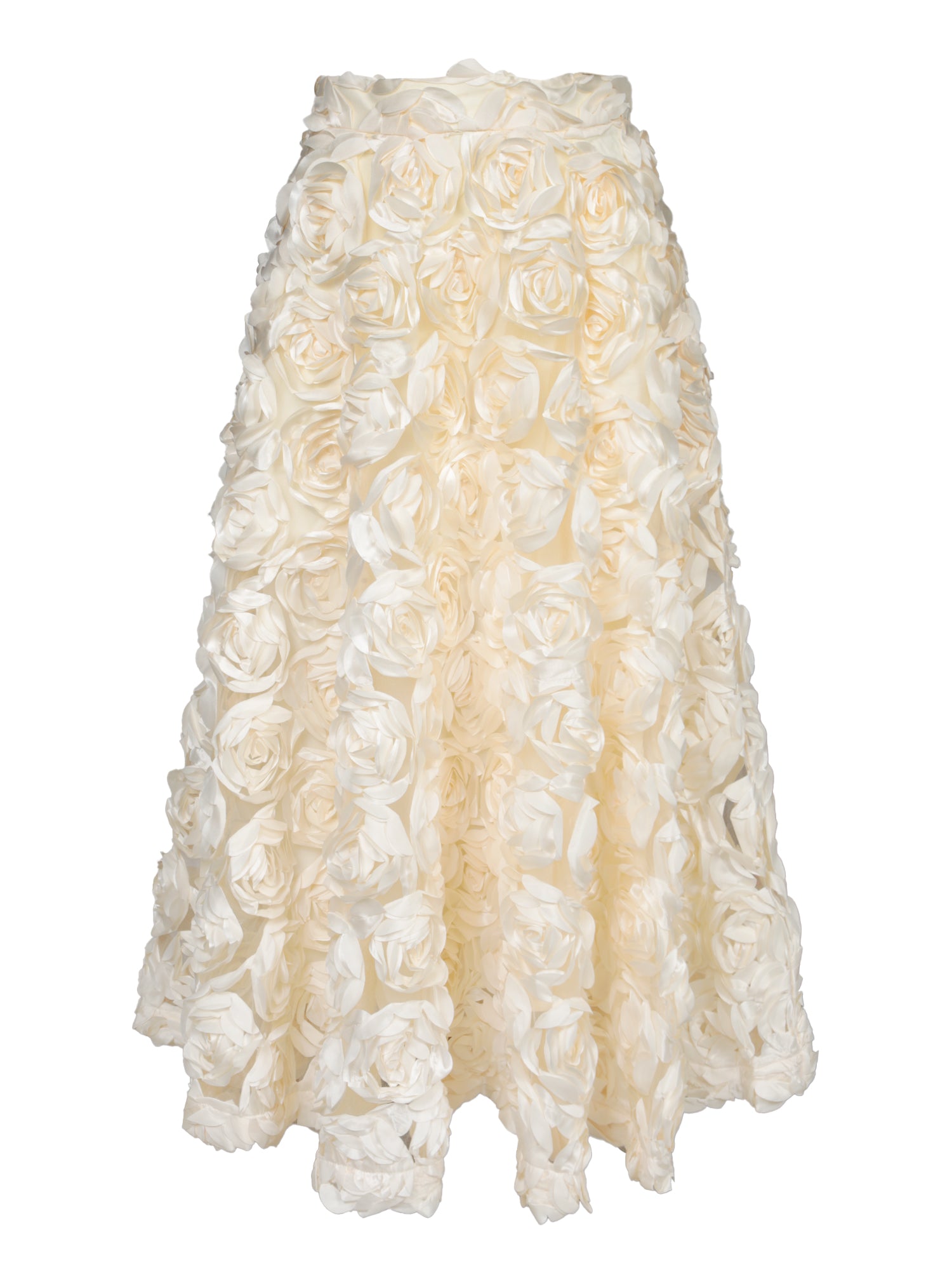 Long skirt crafted with fabric featuring three-dimensional floral appliqués. Perfect for special occasions.