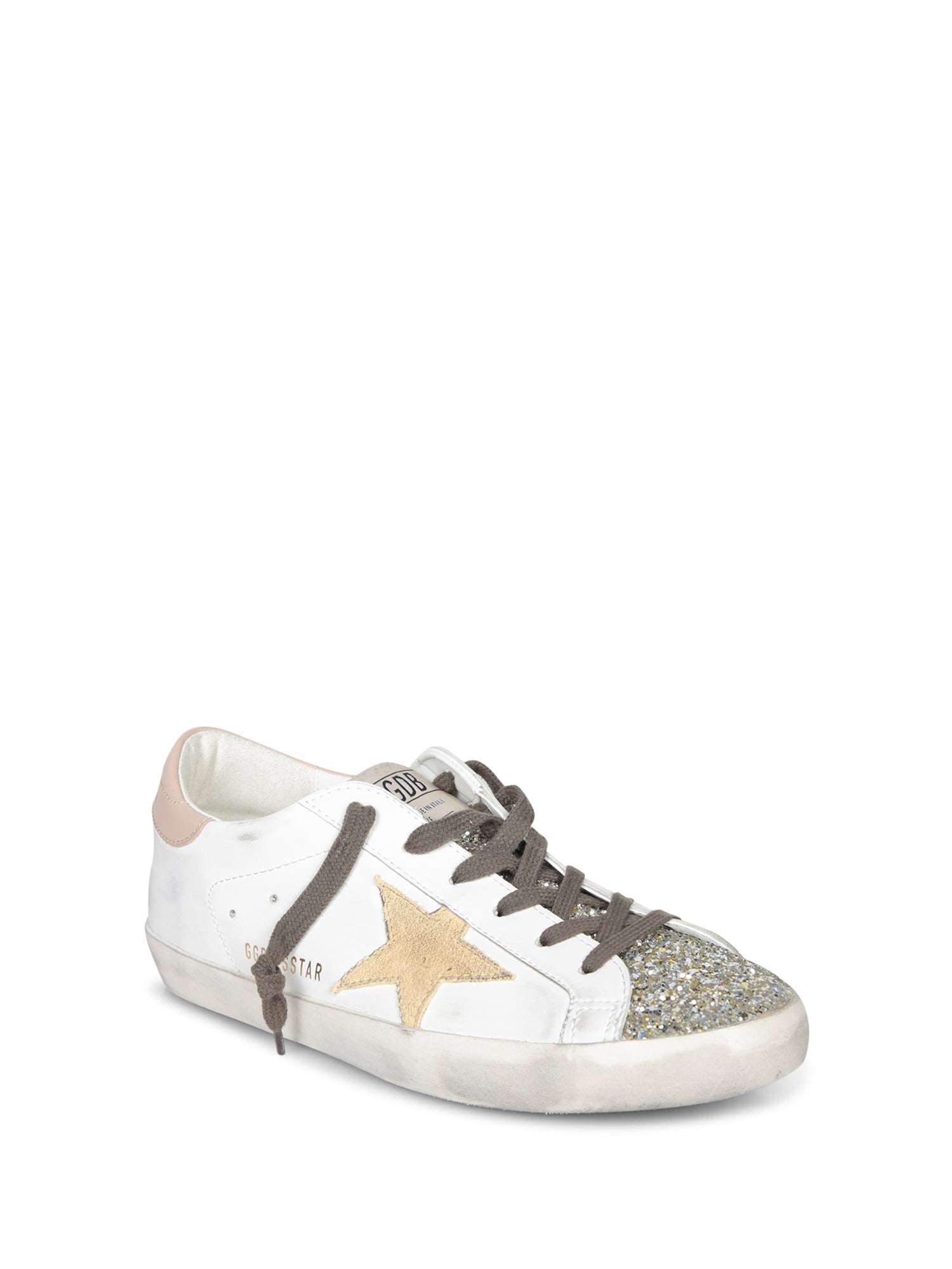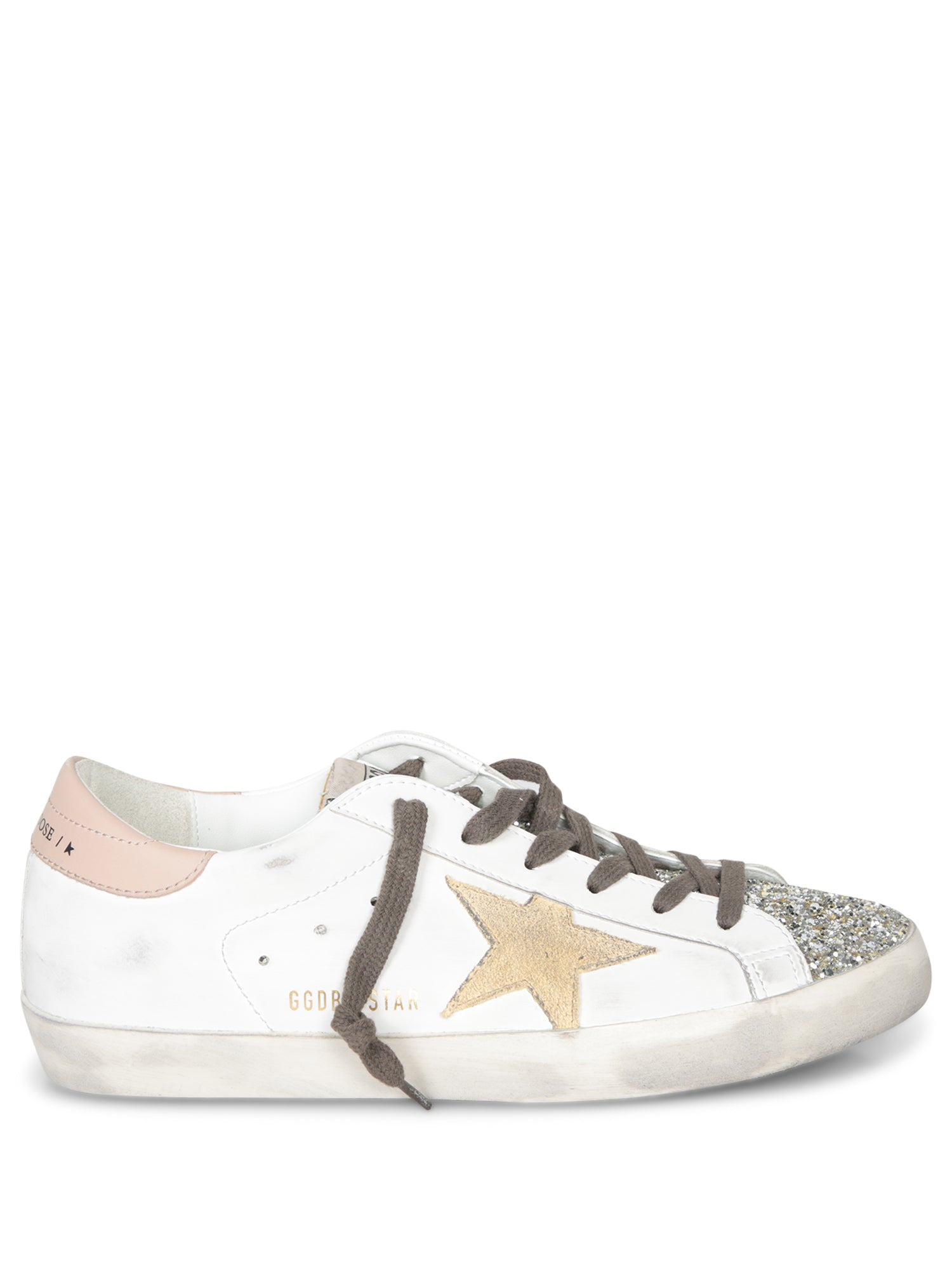 Golden Goose's exclusive Super Star sneaker comes in an irresistible mix of glitter and leather with pink details. Perfect for adding a touch of sparkle to your everyday look.