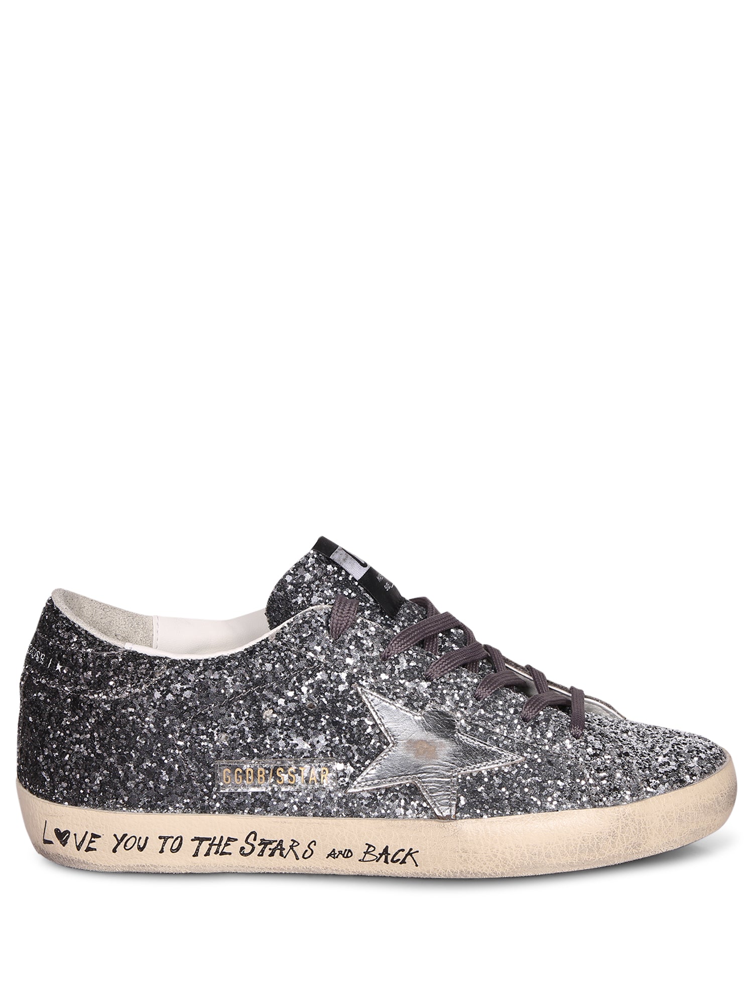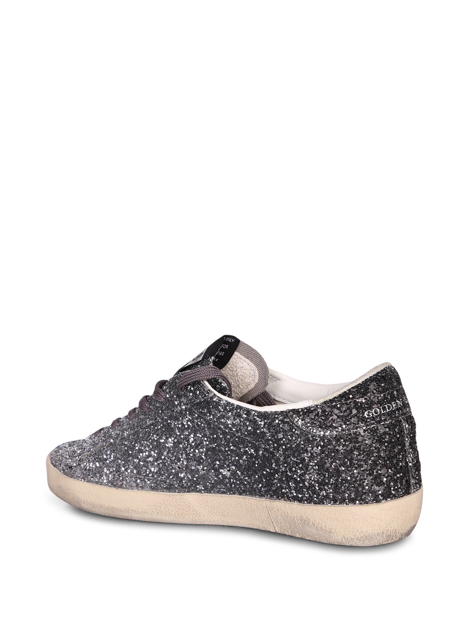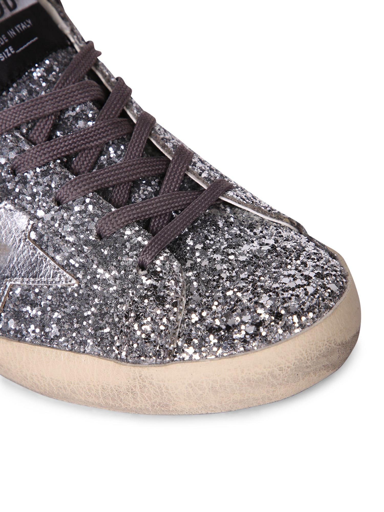 Silver glitter upper with black leather details. Pre-aged rubber sole. Black fabric laces.