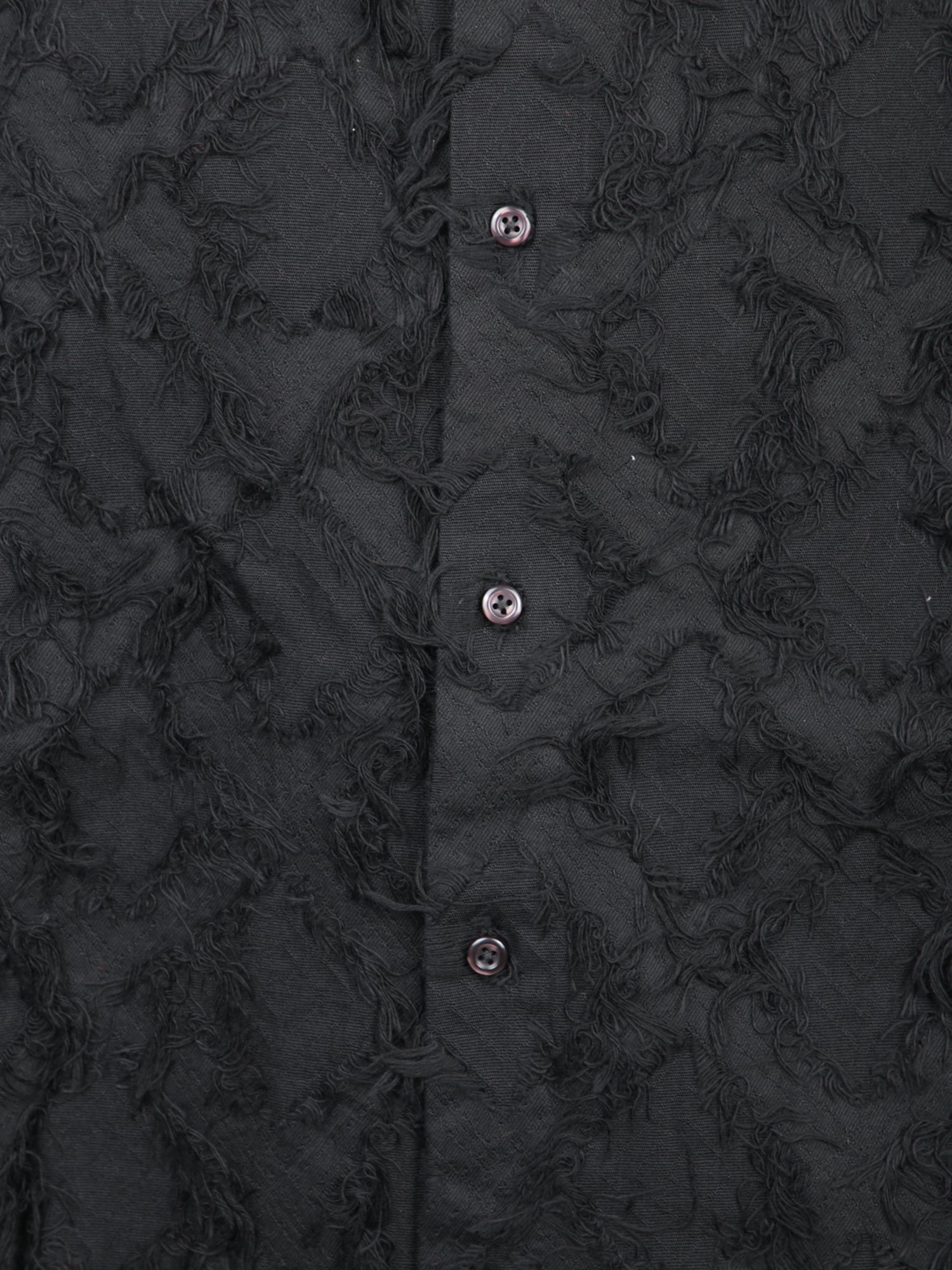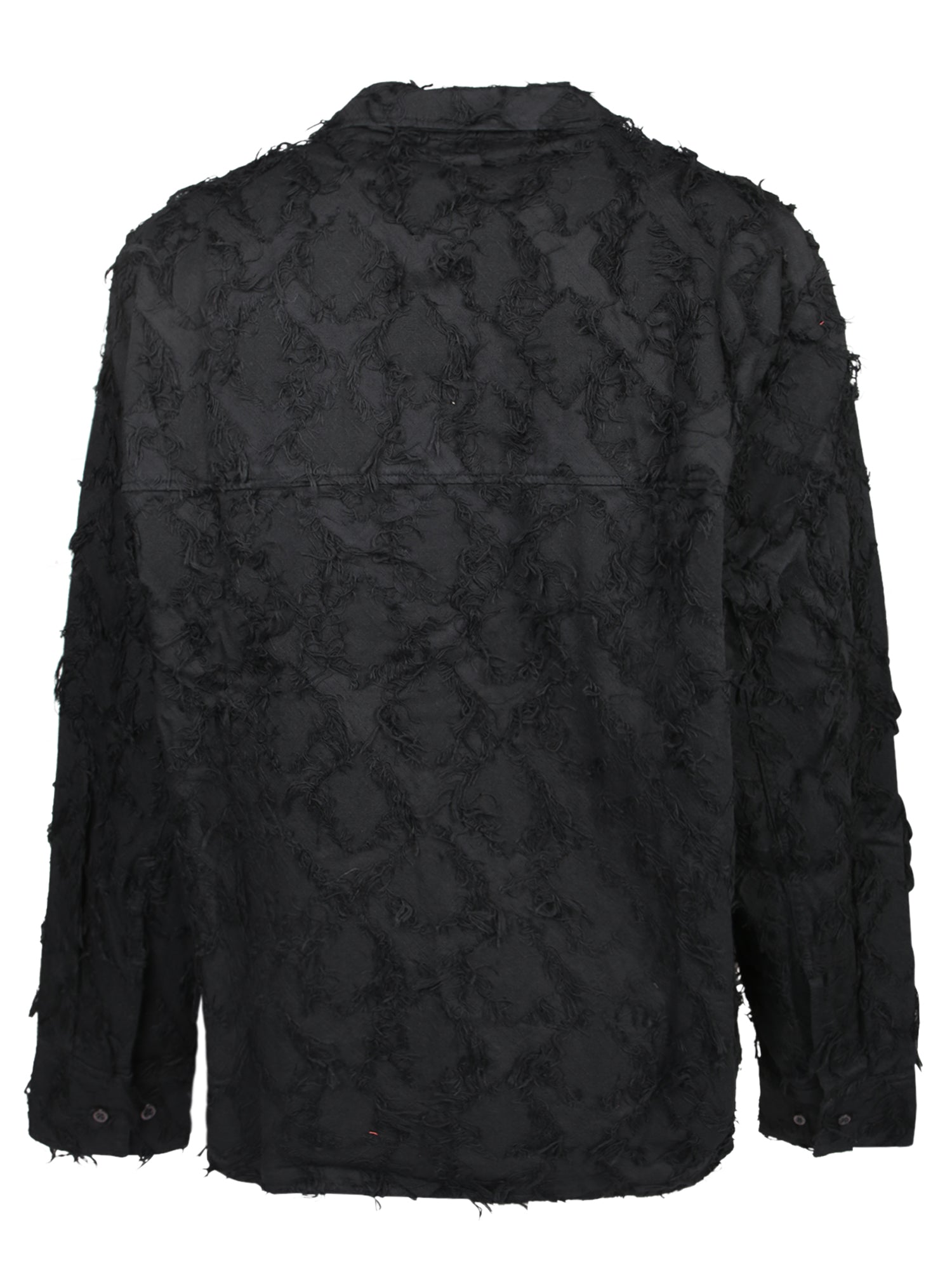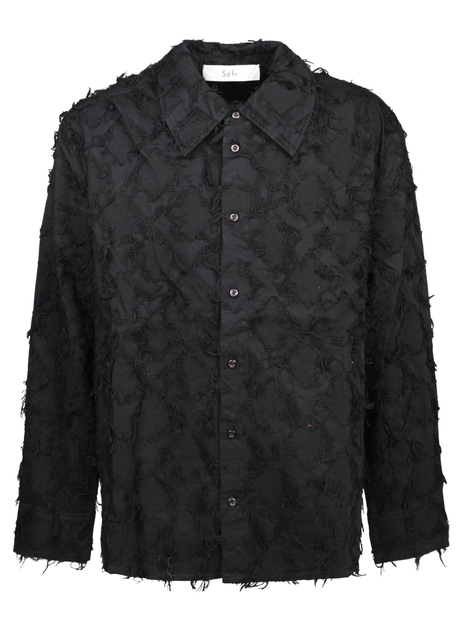 Long sleeves. Classic collar. Button closure. Frayed hem.