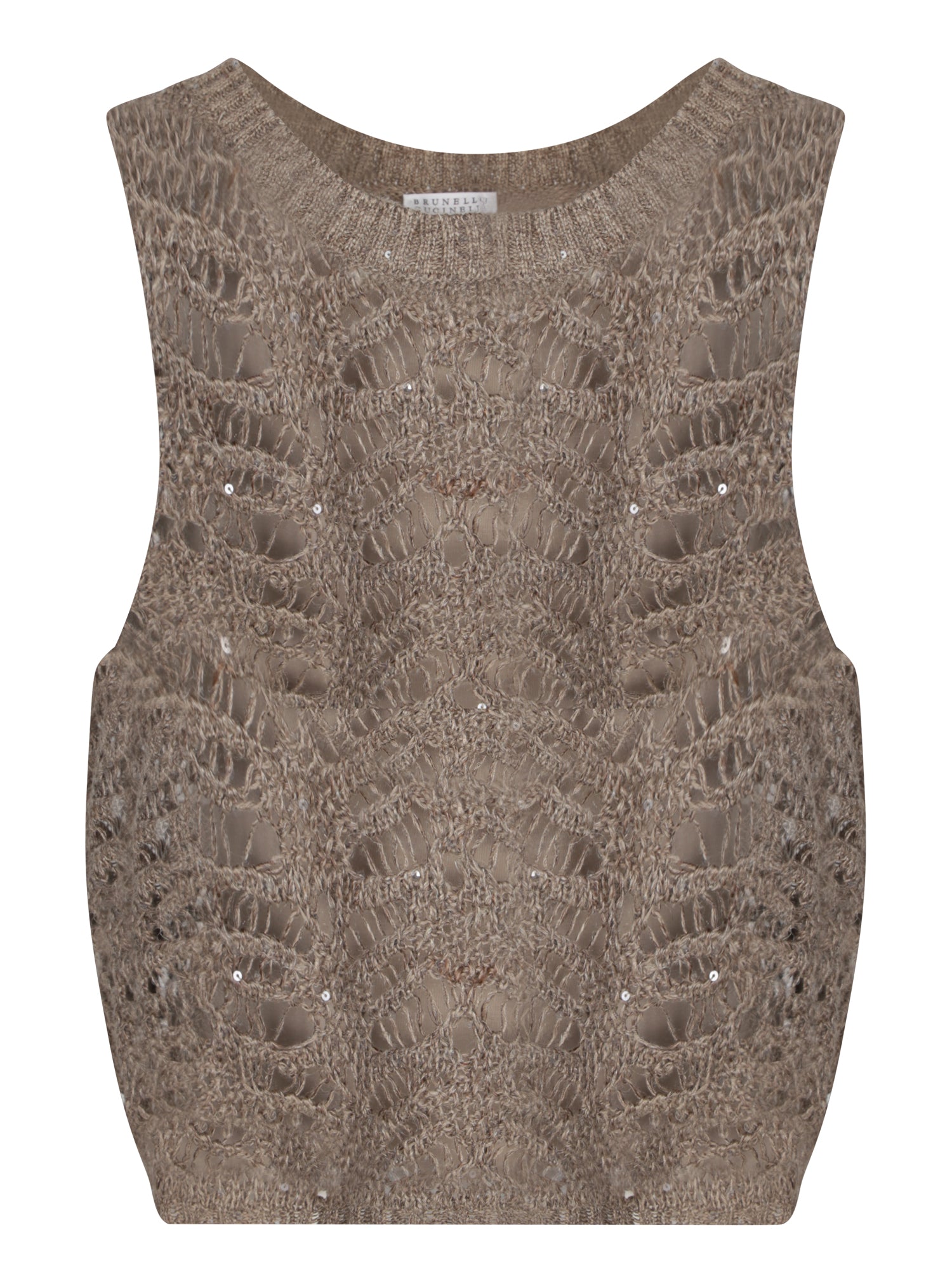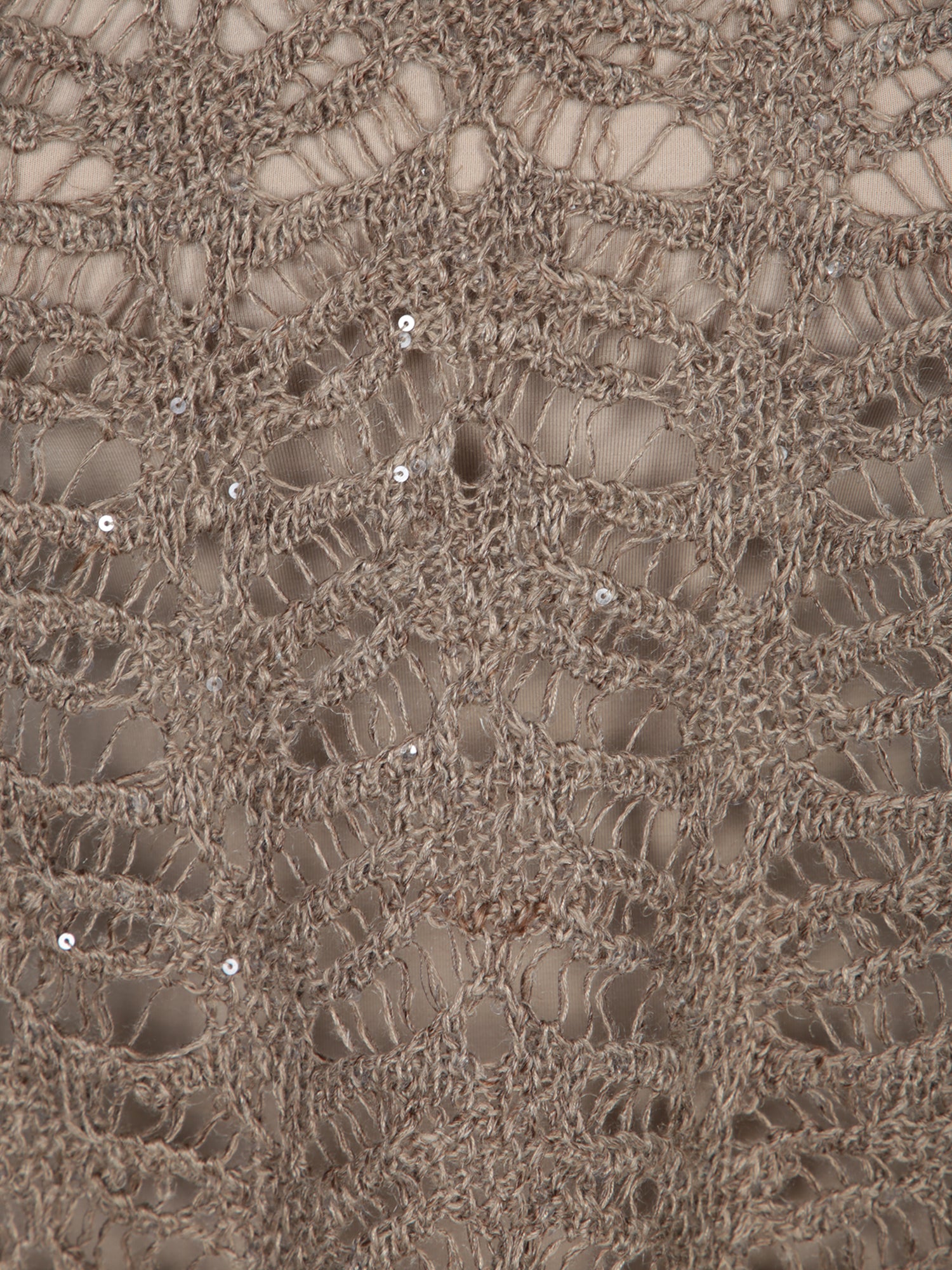 This exclusive Brunello Cucinelli top features a sophisticated bohemian style, crafted in tortora crochet work, embellished with sequins adding a unique luminous touch.