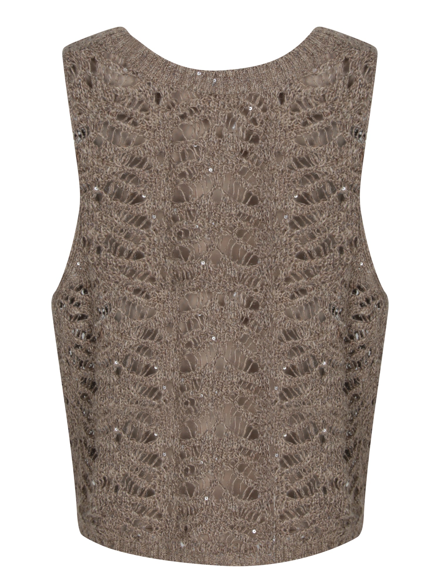 Sleeveless crochet top. Shimmering details with sequins appliques. Tortora color.