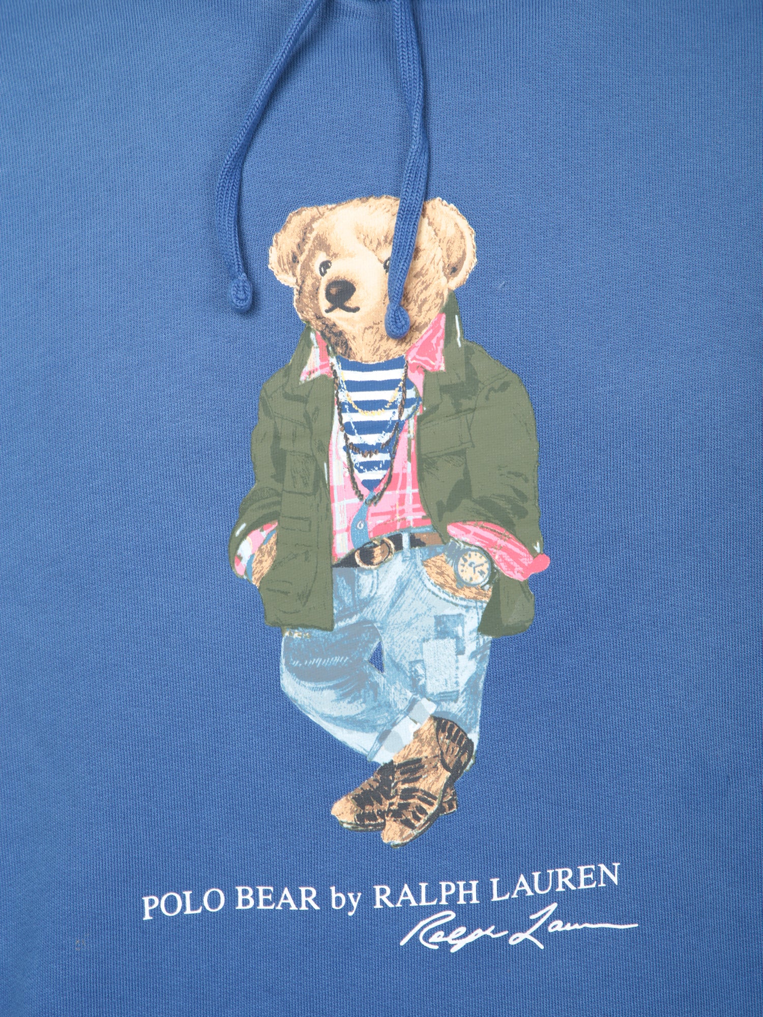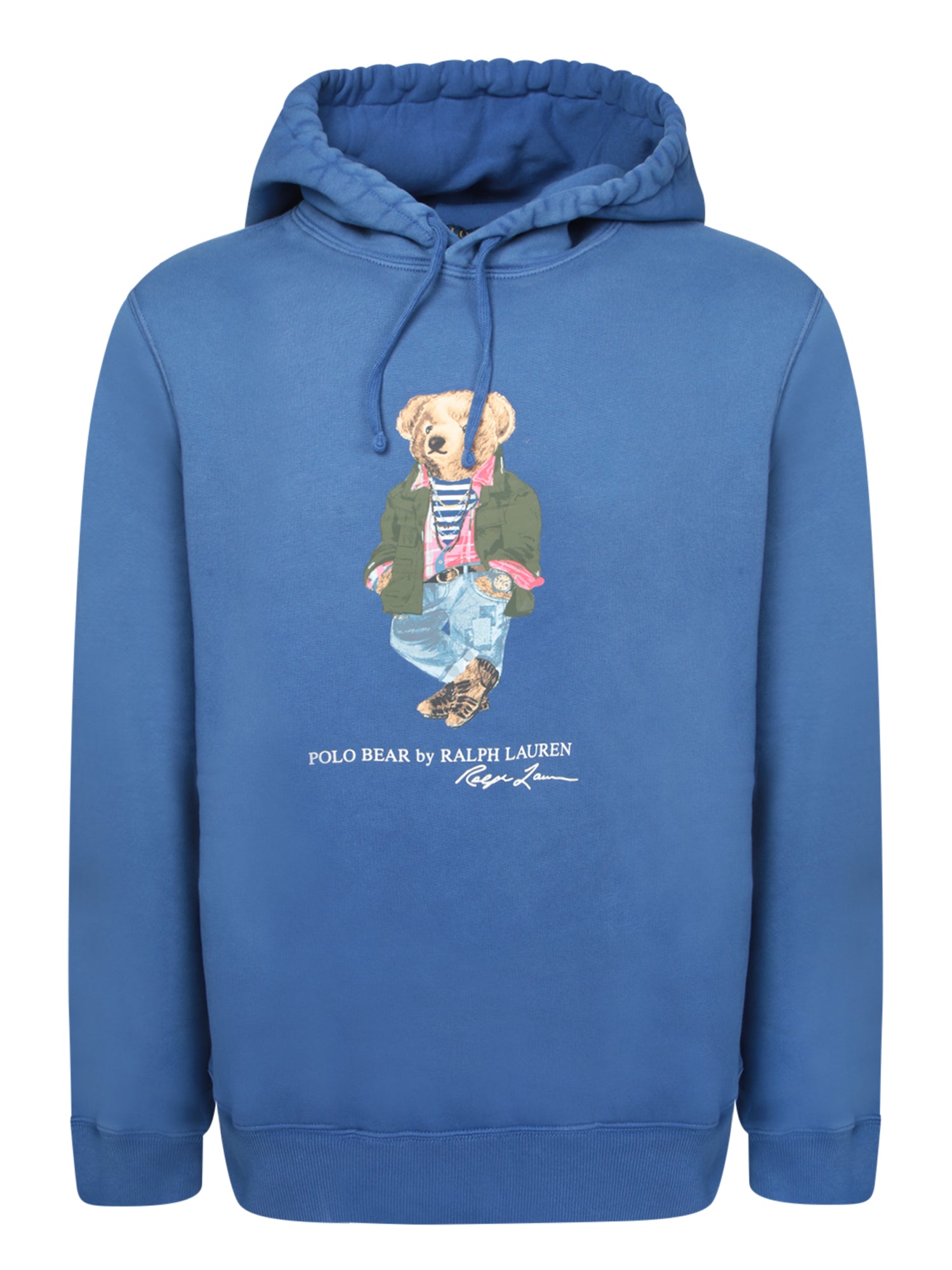 Blue hooded sweatshirt. Central graphic of dressed bear and Ralph Lauren logo. Long sleeves, kangaroo pocket.