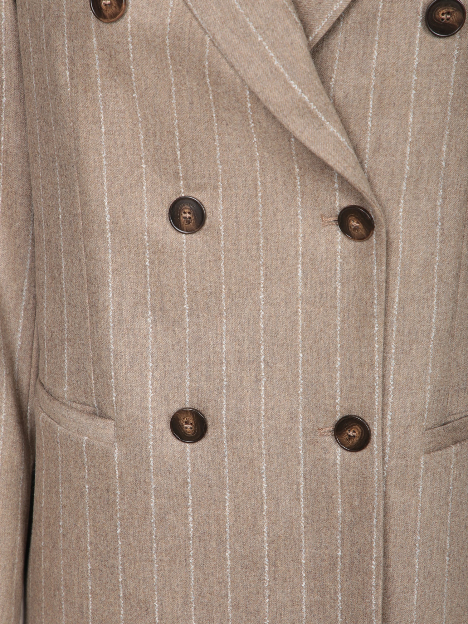 Double-breasted jacket with stripe pattern. Made from premium fabric. Features classic lapels and dark brown buttons.