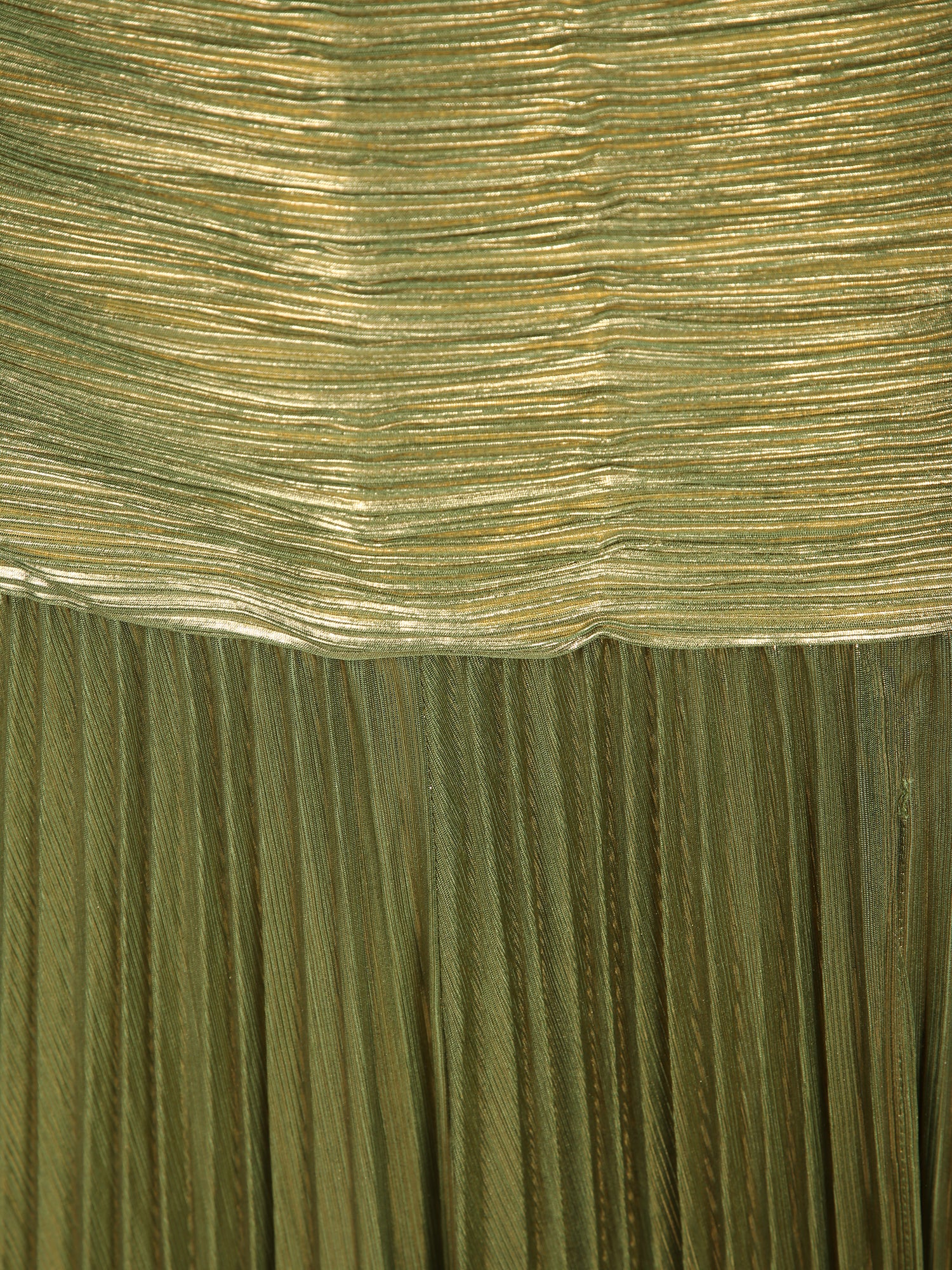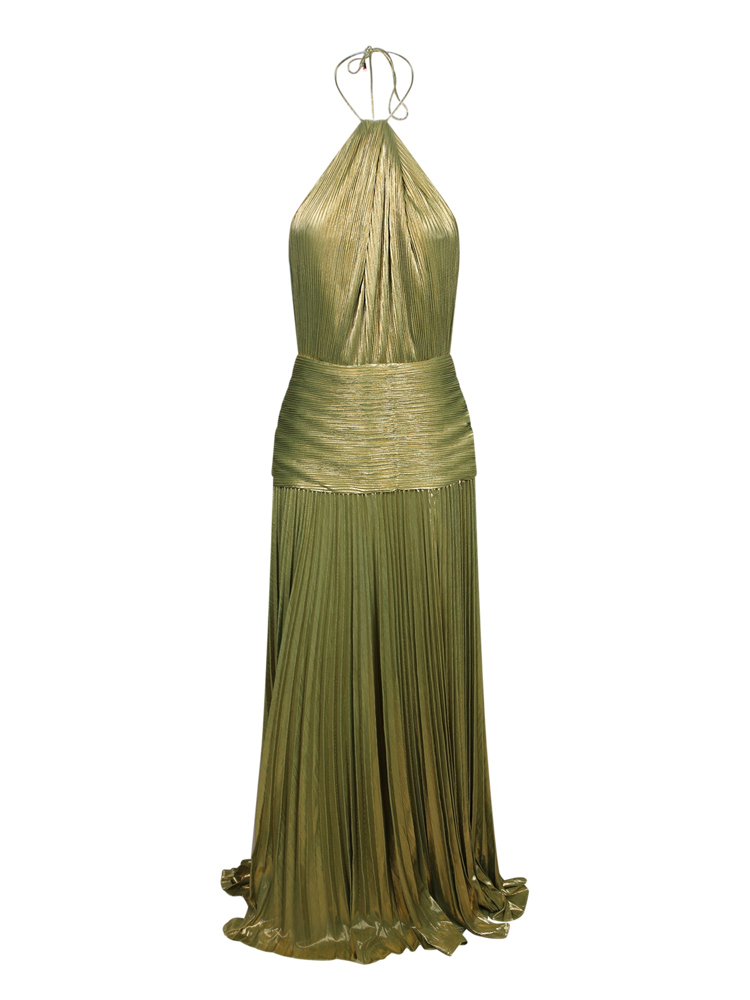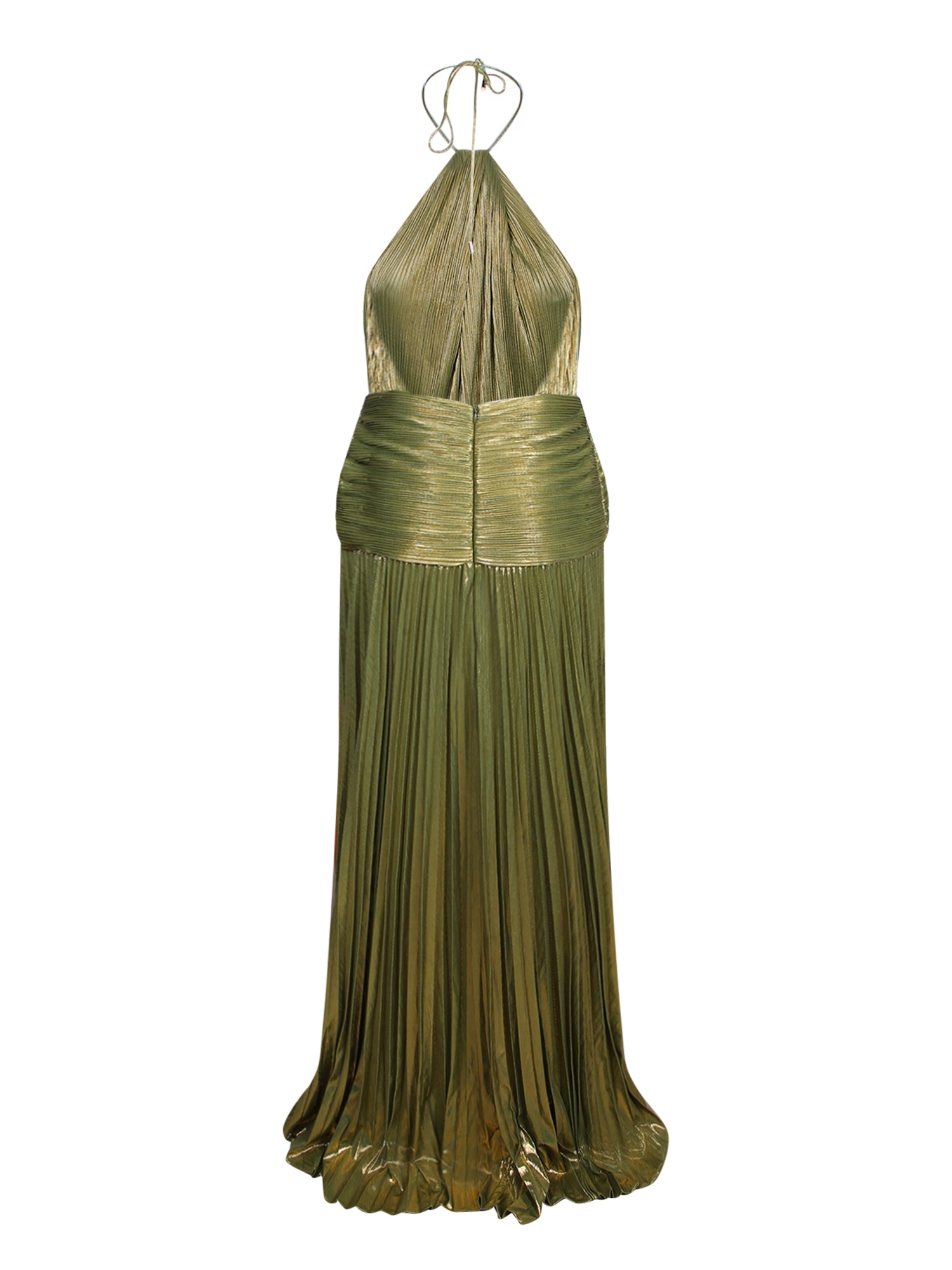 Pleated long dress with halter neck. Accentuated waistband. Tie closure at the back.