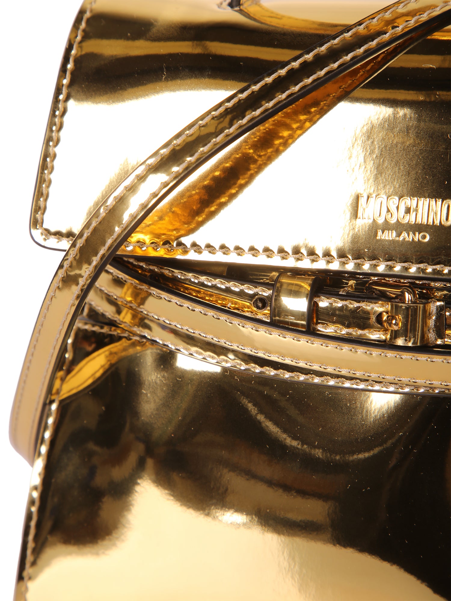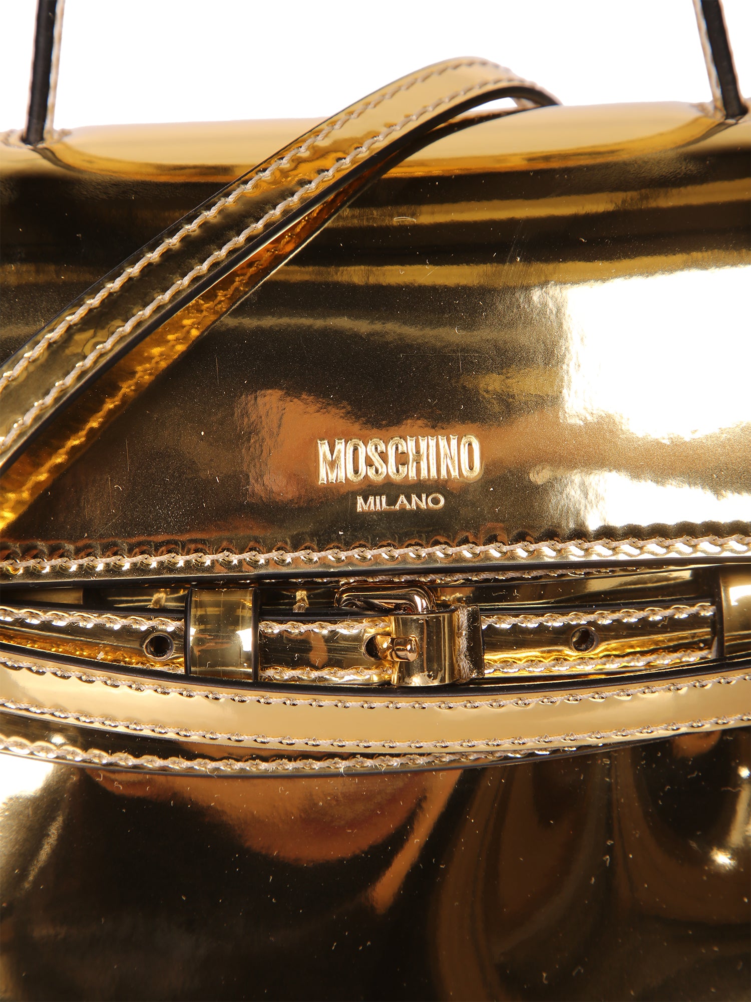 Made of metallic gold leather. Structured design with top handle. Lock closure and adjustable shoulder strap.