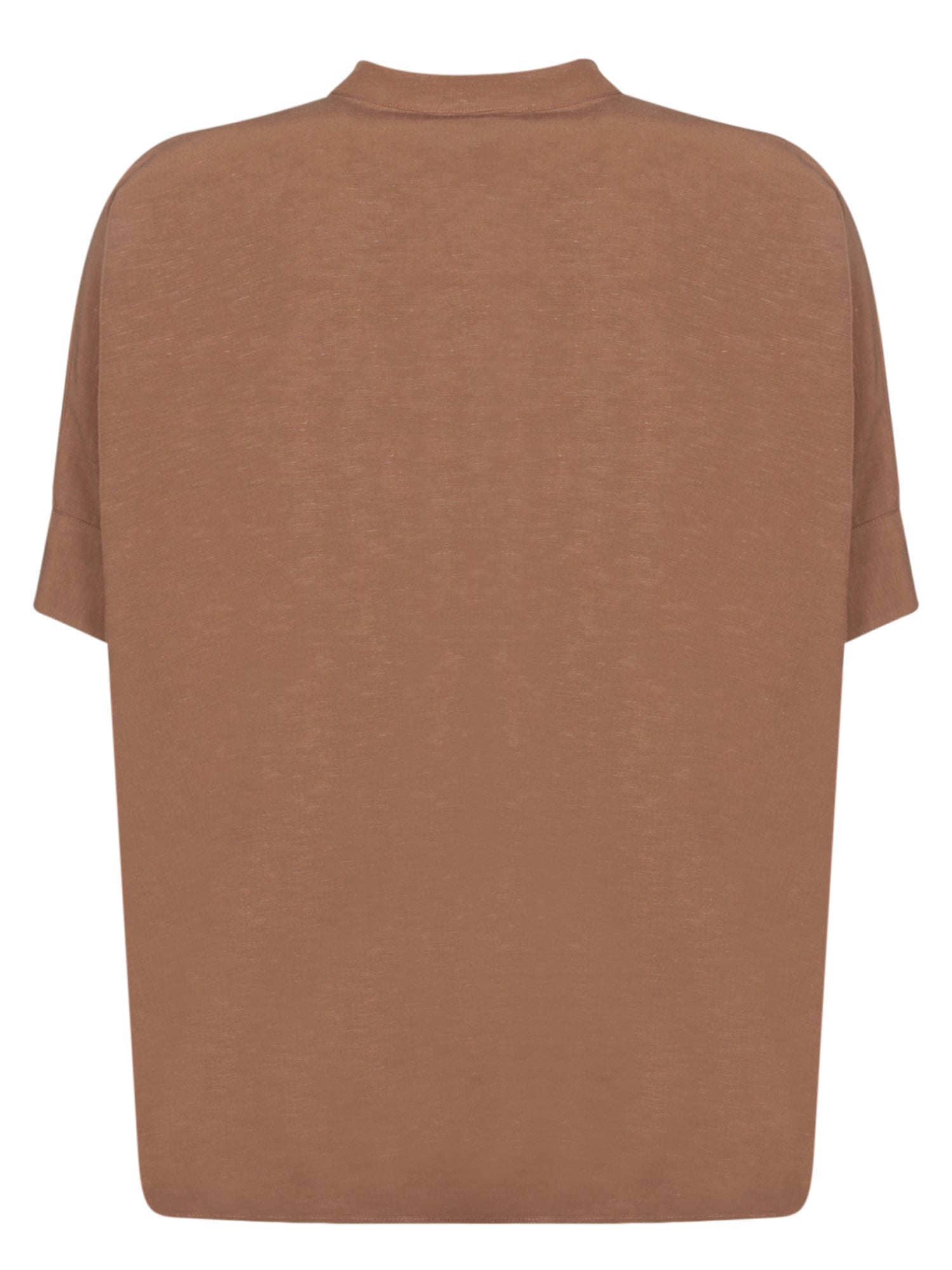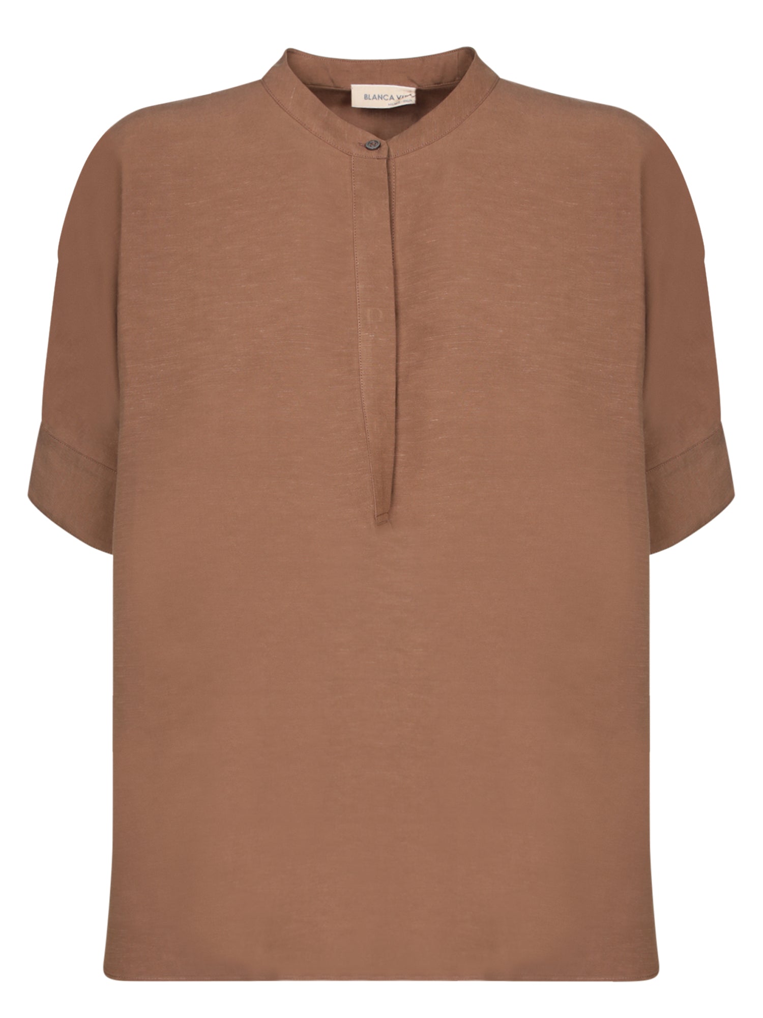 This elegant blouse from Blanca Vita blends the comfort of linen with the lightness of viscose. Its minimalist design, enhanced by a mandarin collar and two-button closure, makes it perfect for both casual and formal looks.