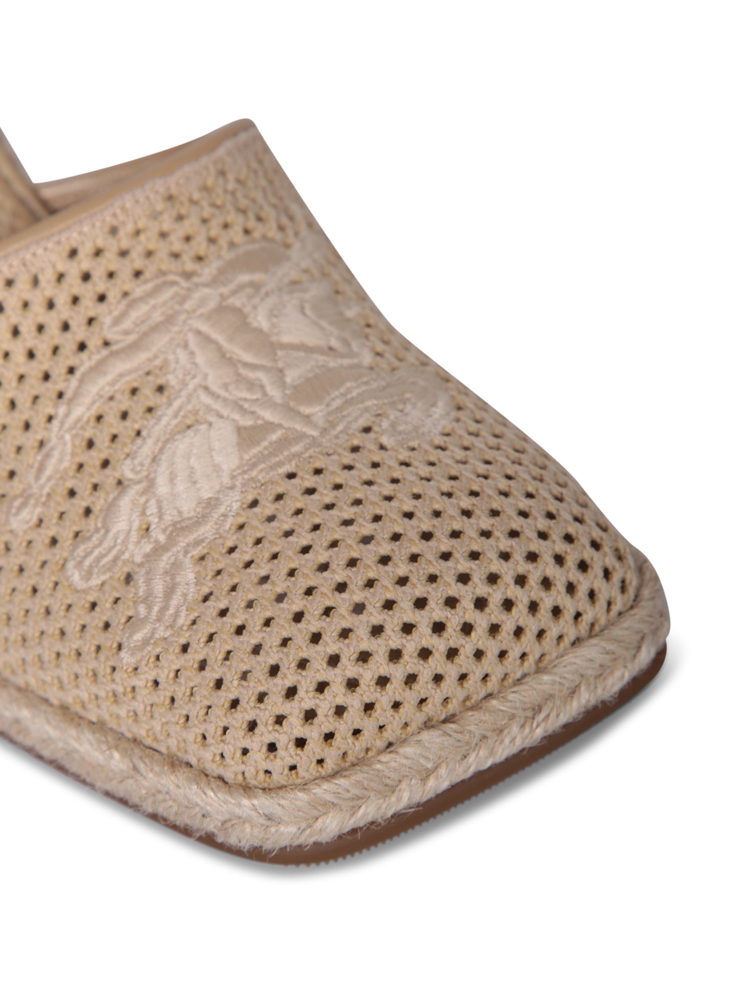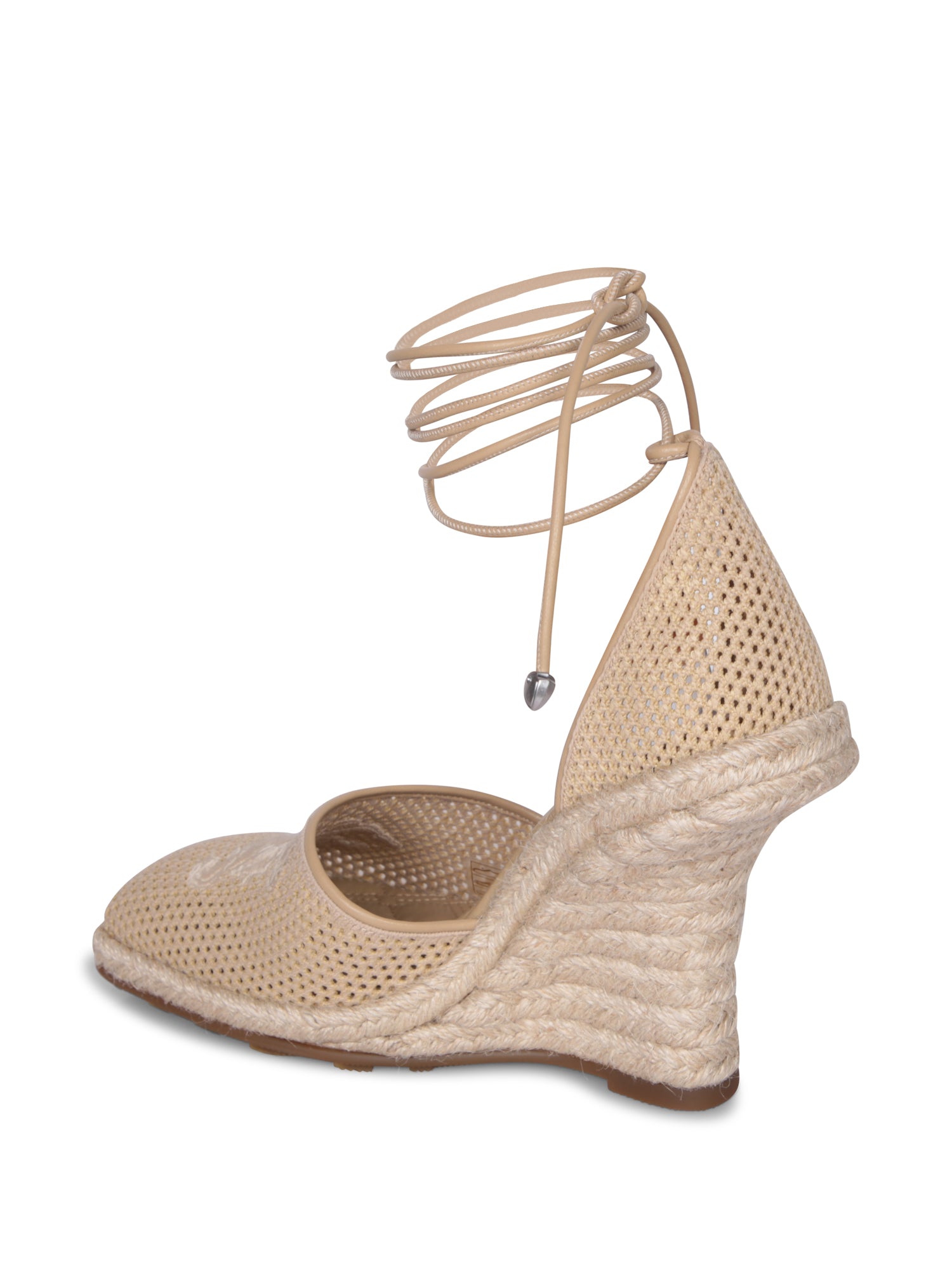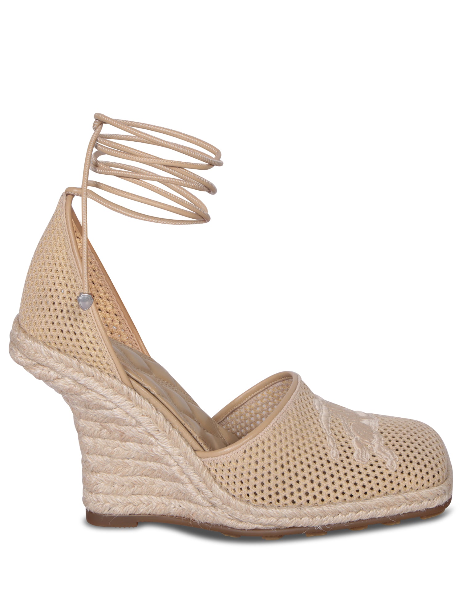 Wedge espadrilles with rope heel, crochet upper, and lace-up closure.