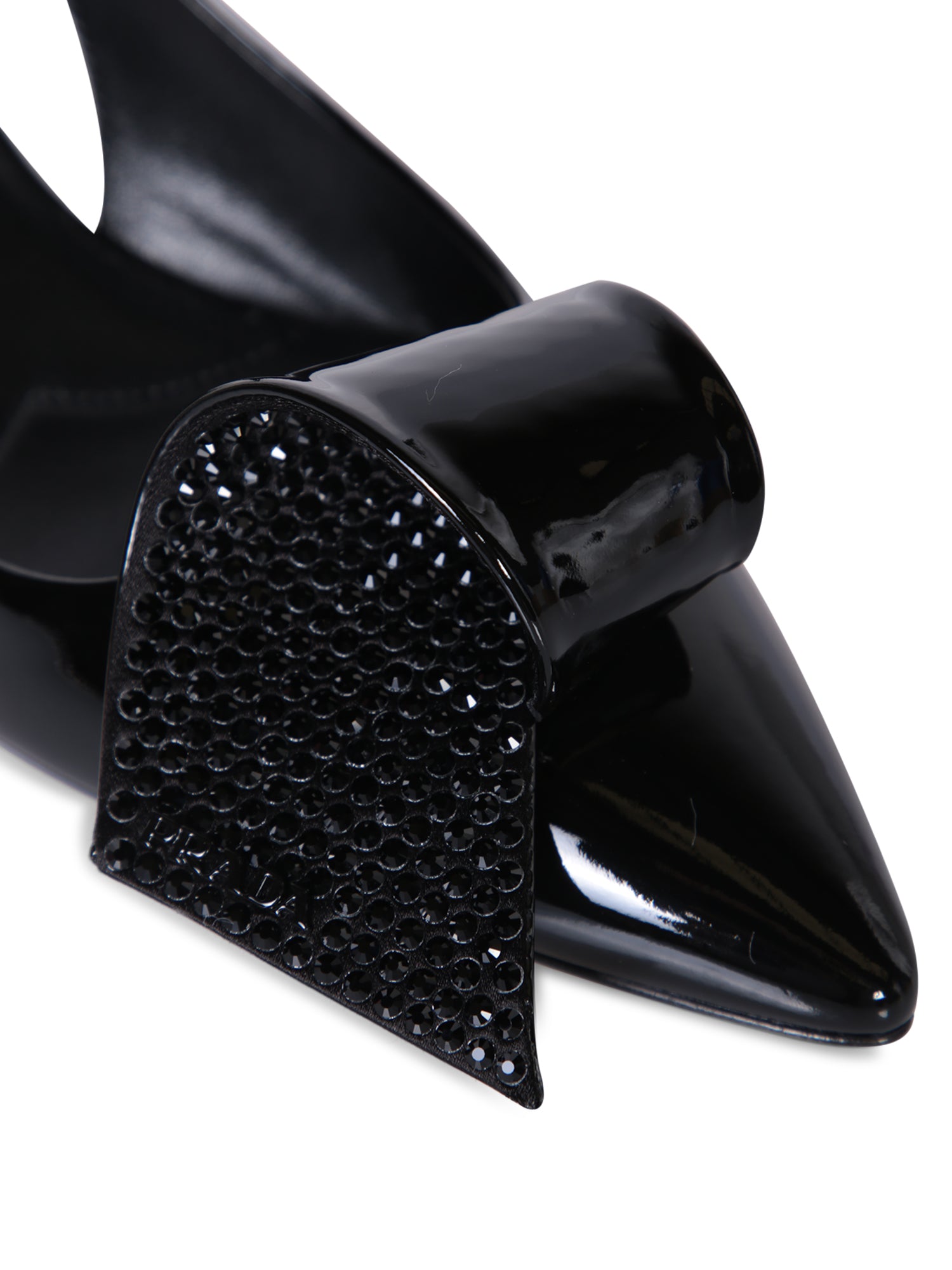 Leather sole. Patent leather and satin crystals patch. Heel height: 5.5 cm