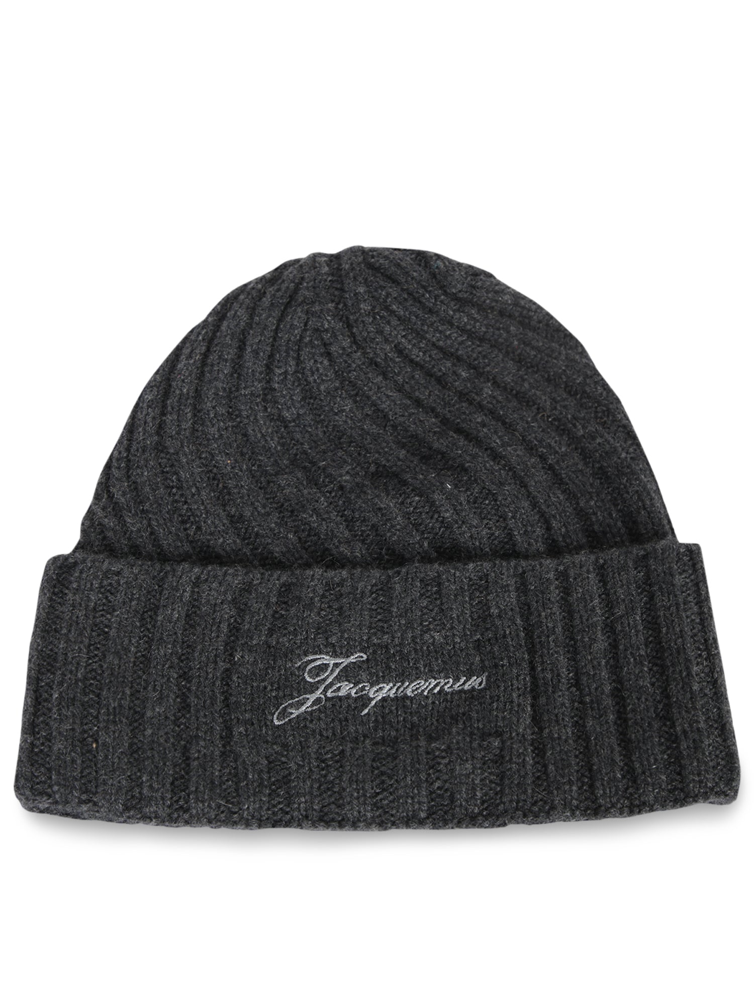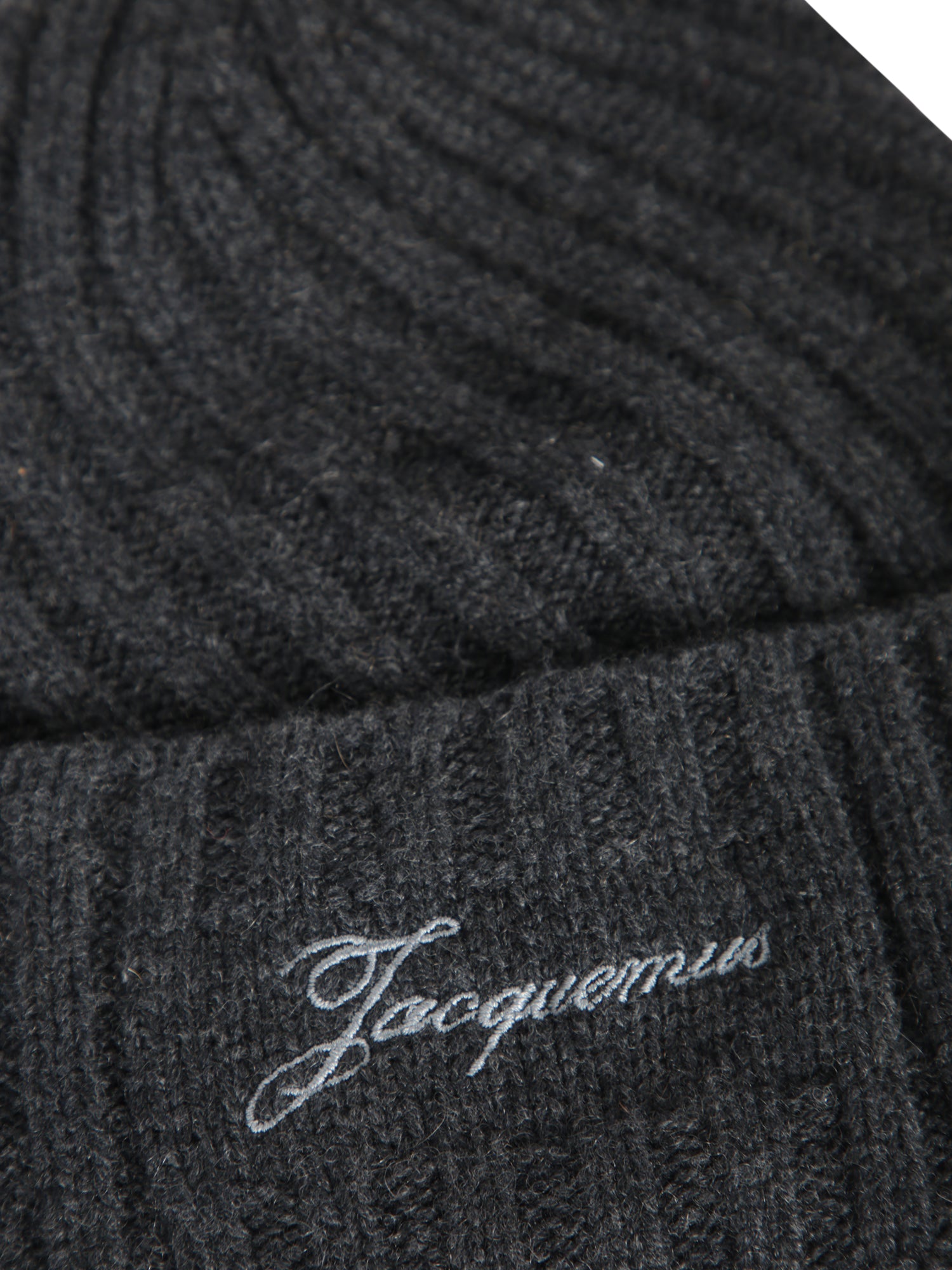 Grey knitted hat featuring a ribbed design. Finished with an embroidered Jacquemus logo on the fold-over.
