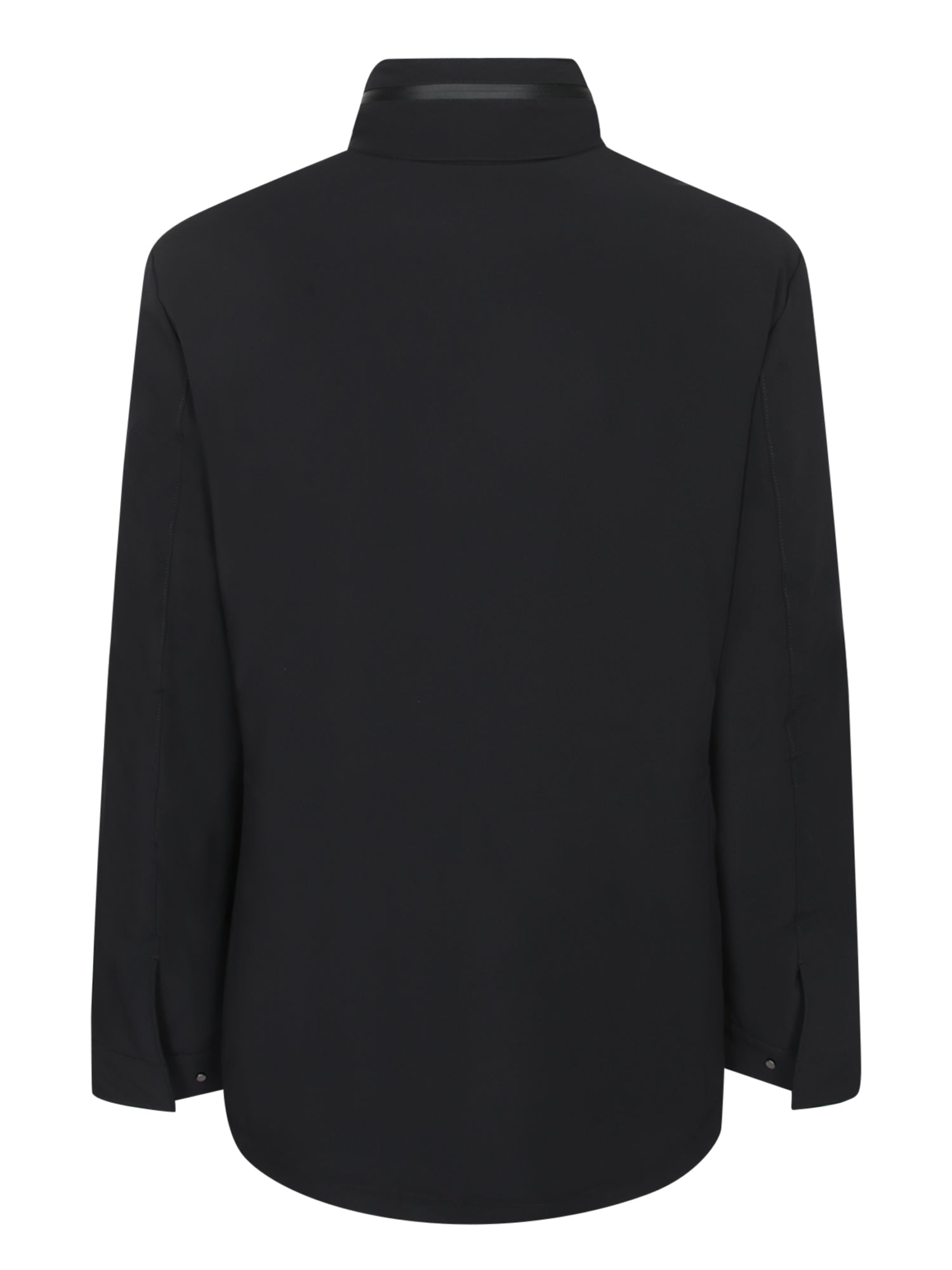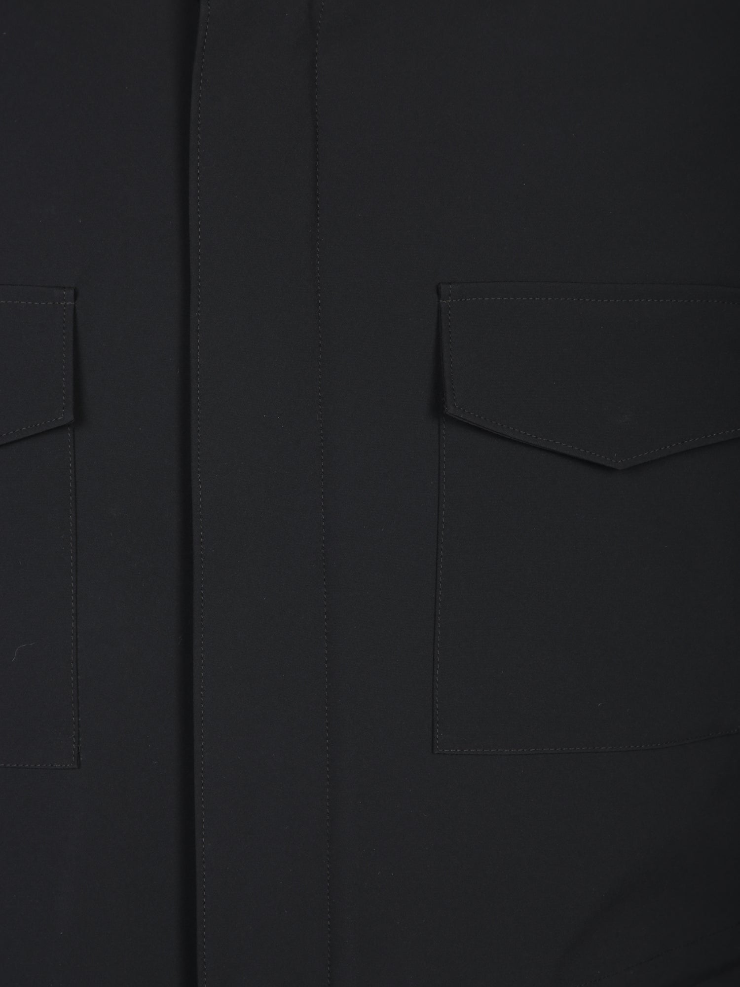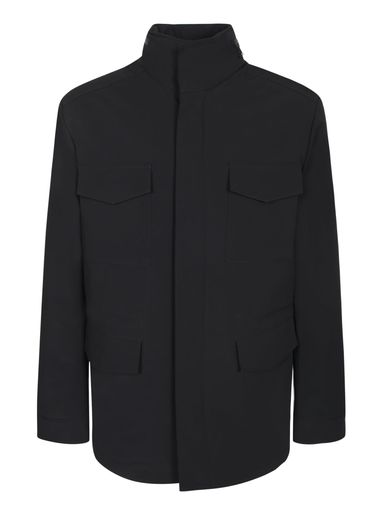 Jacket with raised collar, front zip and button closure, flap pockets.