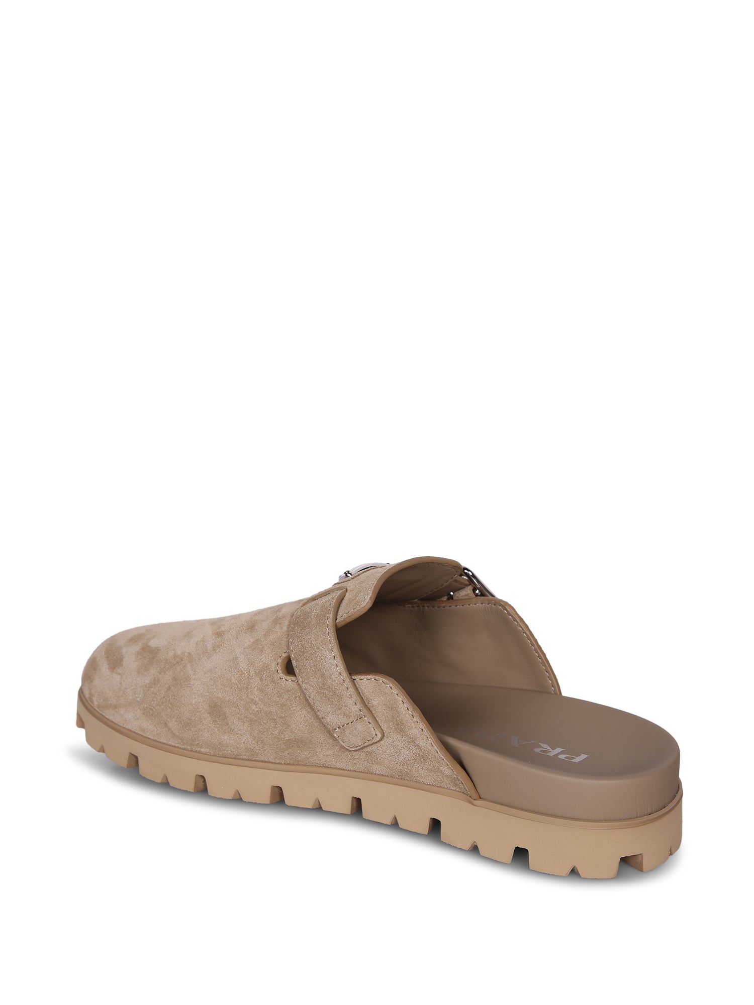 Suede sandal with buckle, brand logo, and toothed rubber sole.