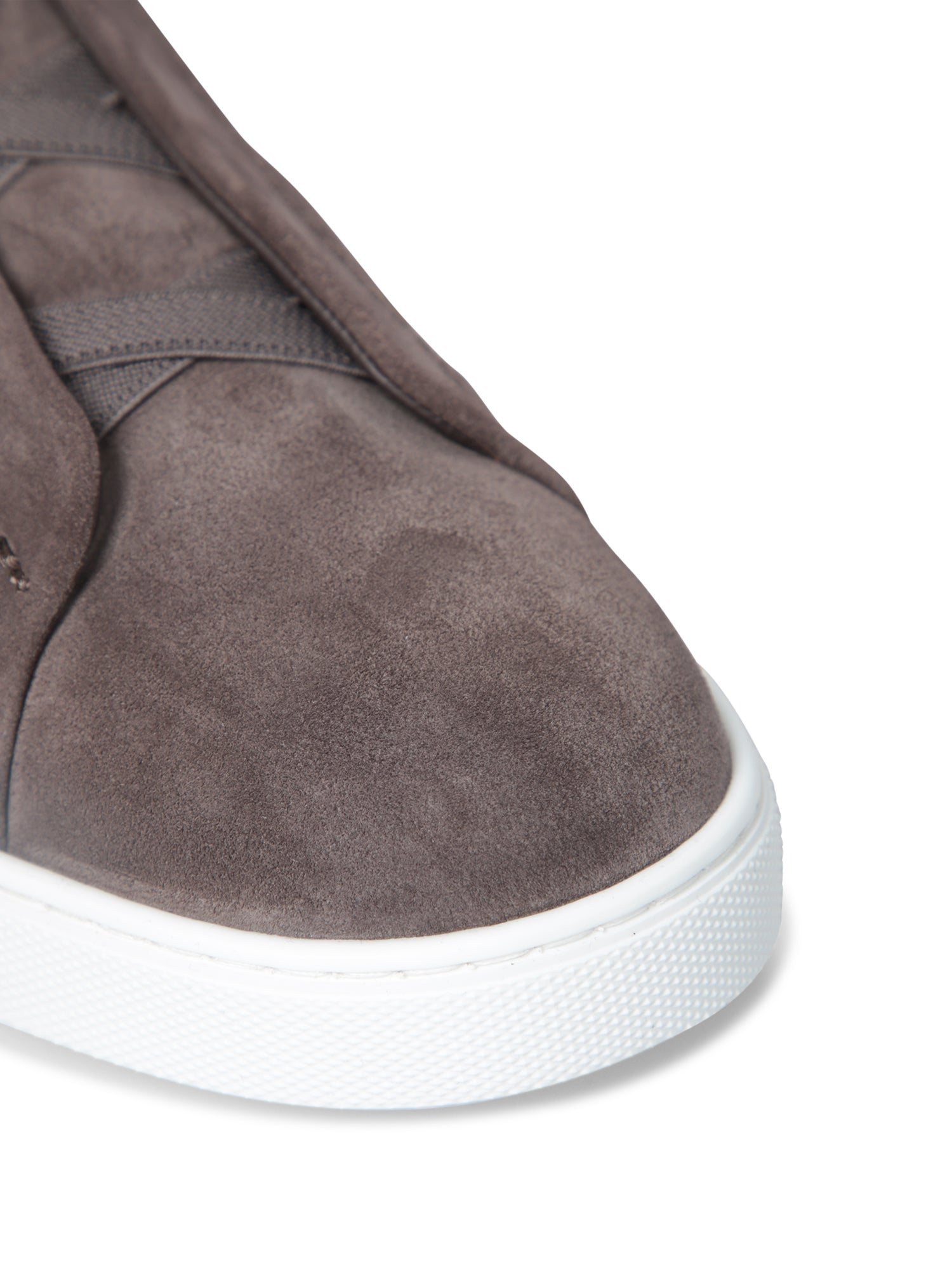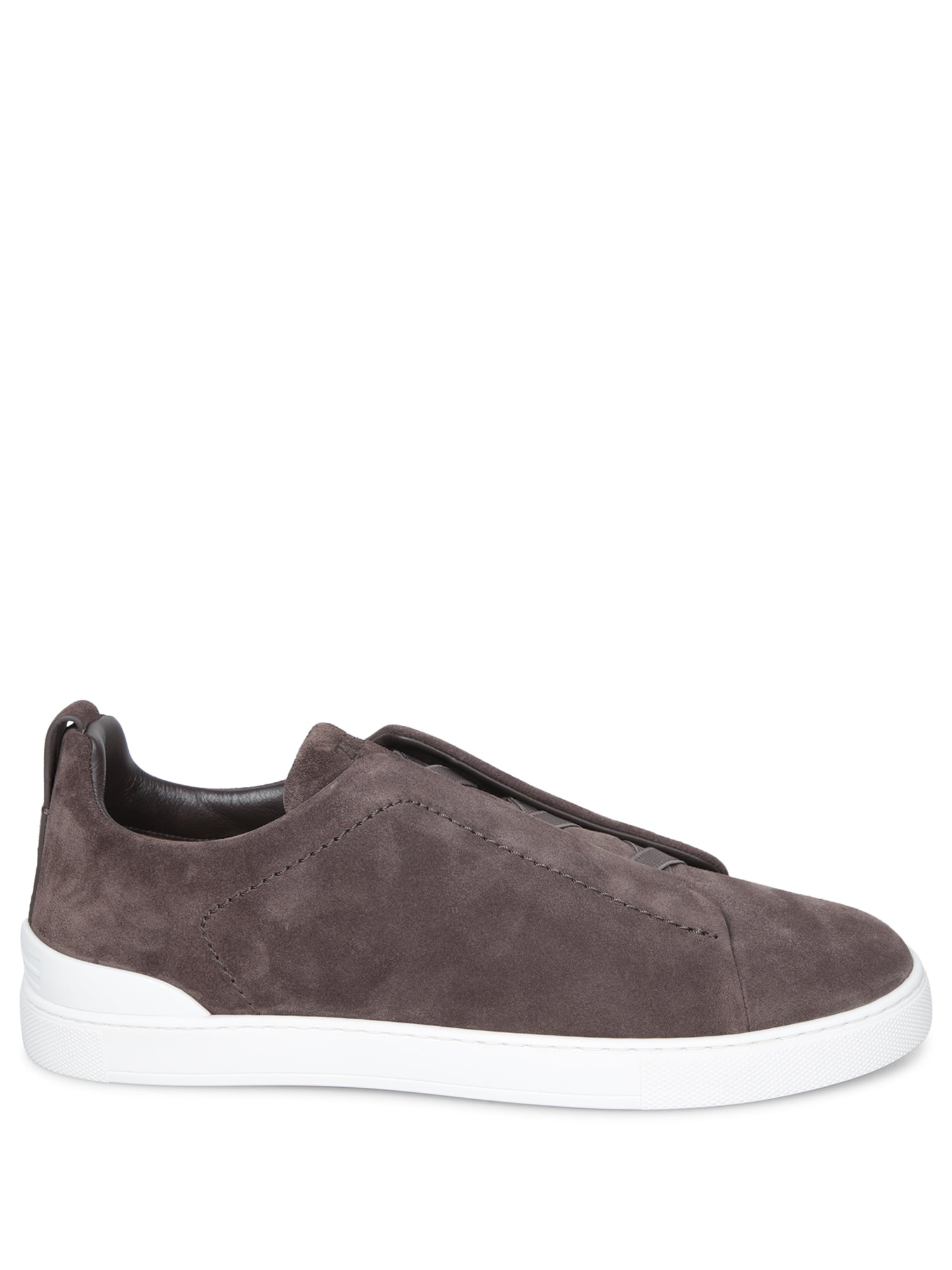 These stylish Zegna Triple Stitch sneakers in taupe suede blend luxury and comfort with a durable sole and a practical lace-free design.
