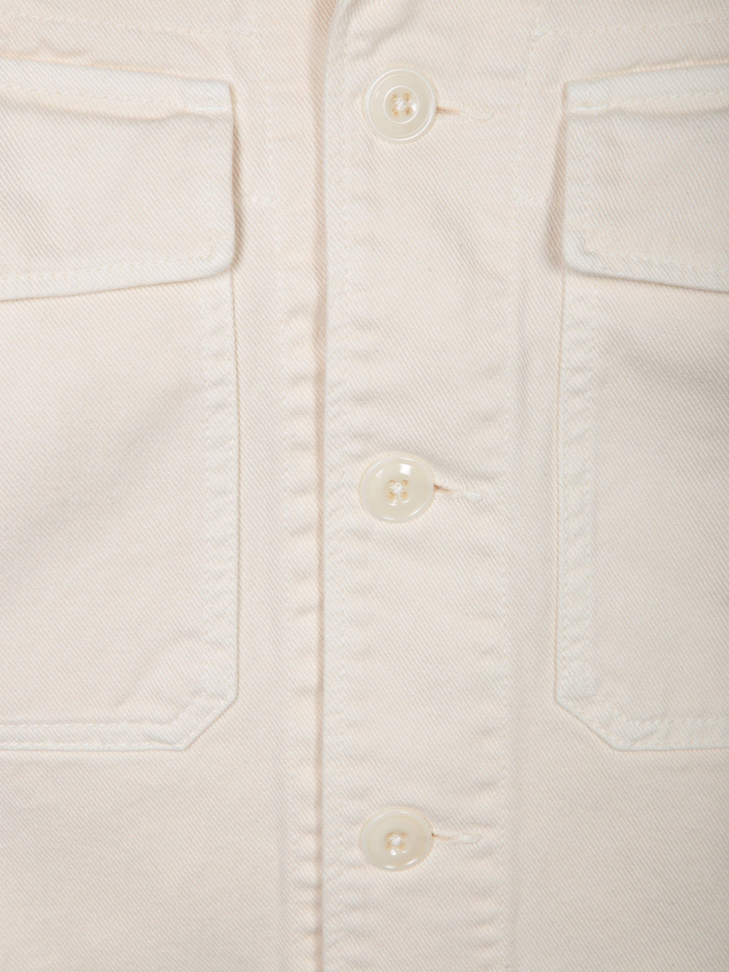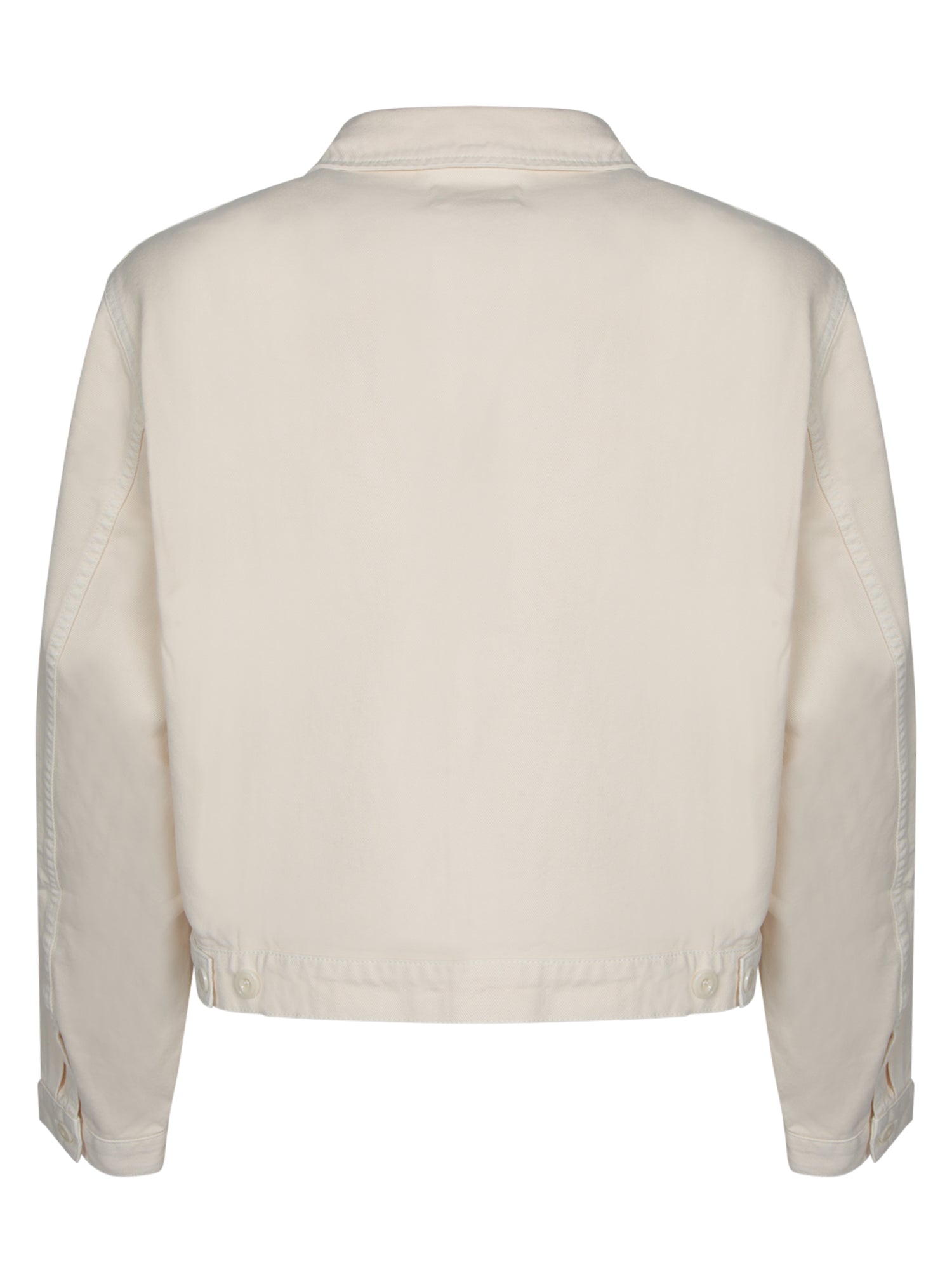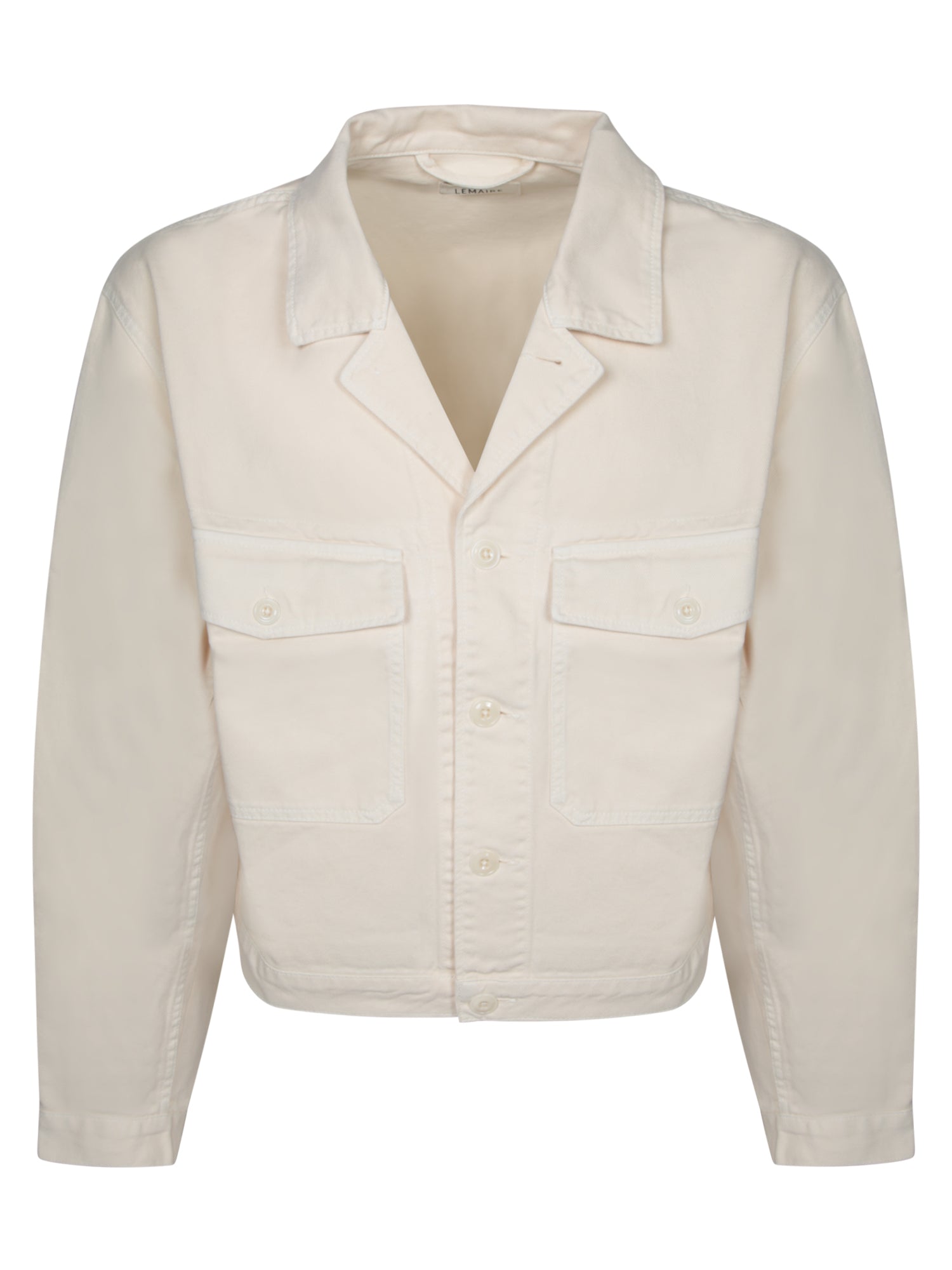This Lemaire trucker jacket features a versatile and contemporary silhouette, coming in a sophisticated ecru shade with subtle stitch detailing. Its structured cut and exceptional attention to details lend a touch of casual elegance.