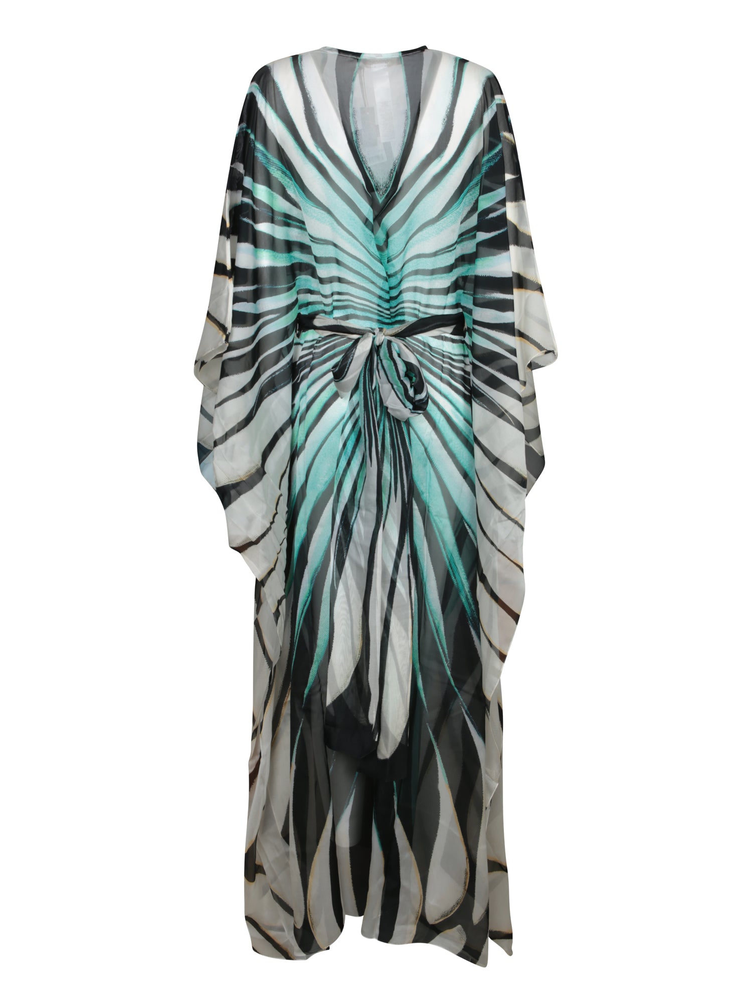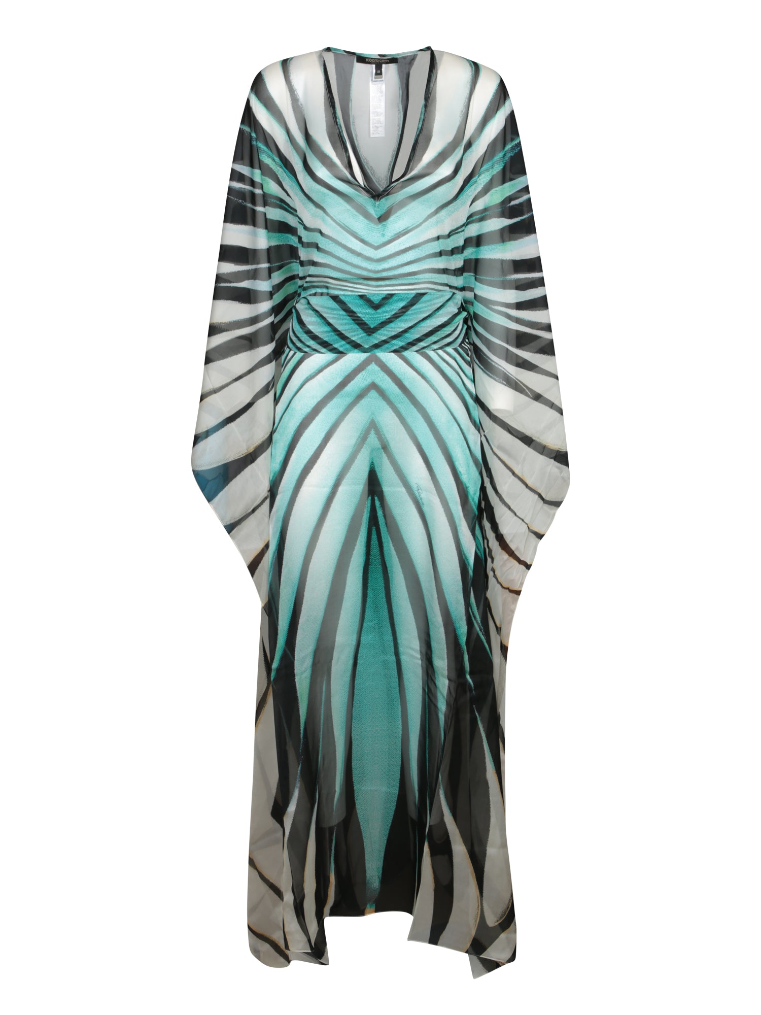 Striped design in turquoise and black shades. Includes a matching belt. Wide and fluid cut.