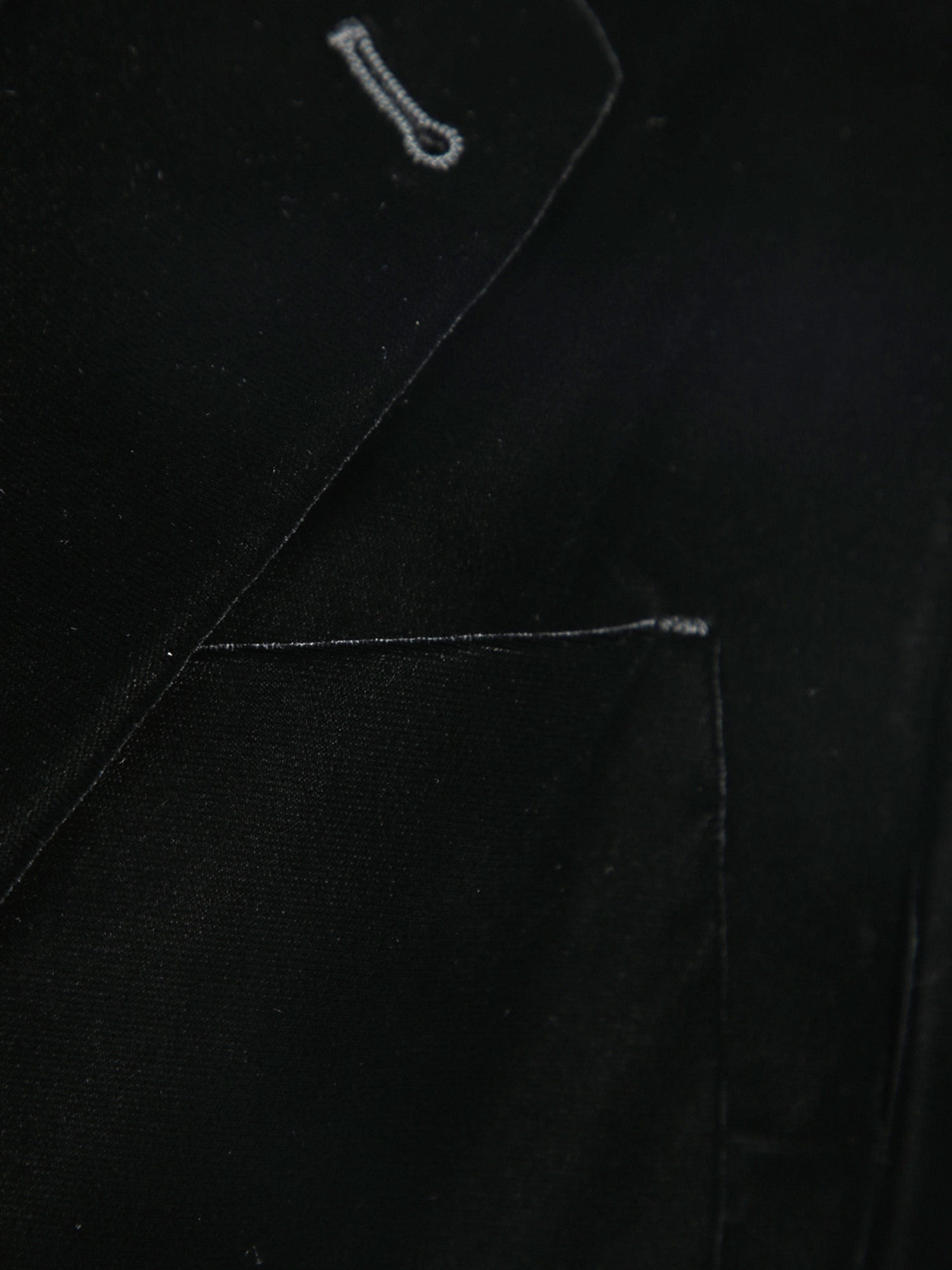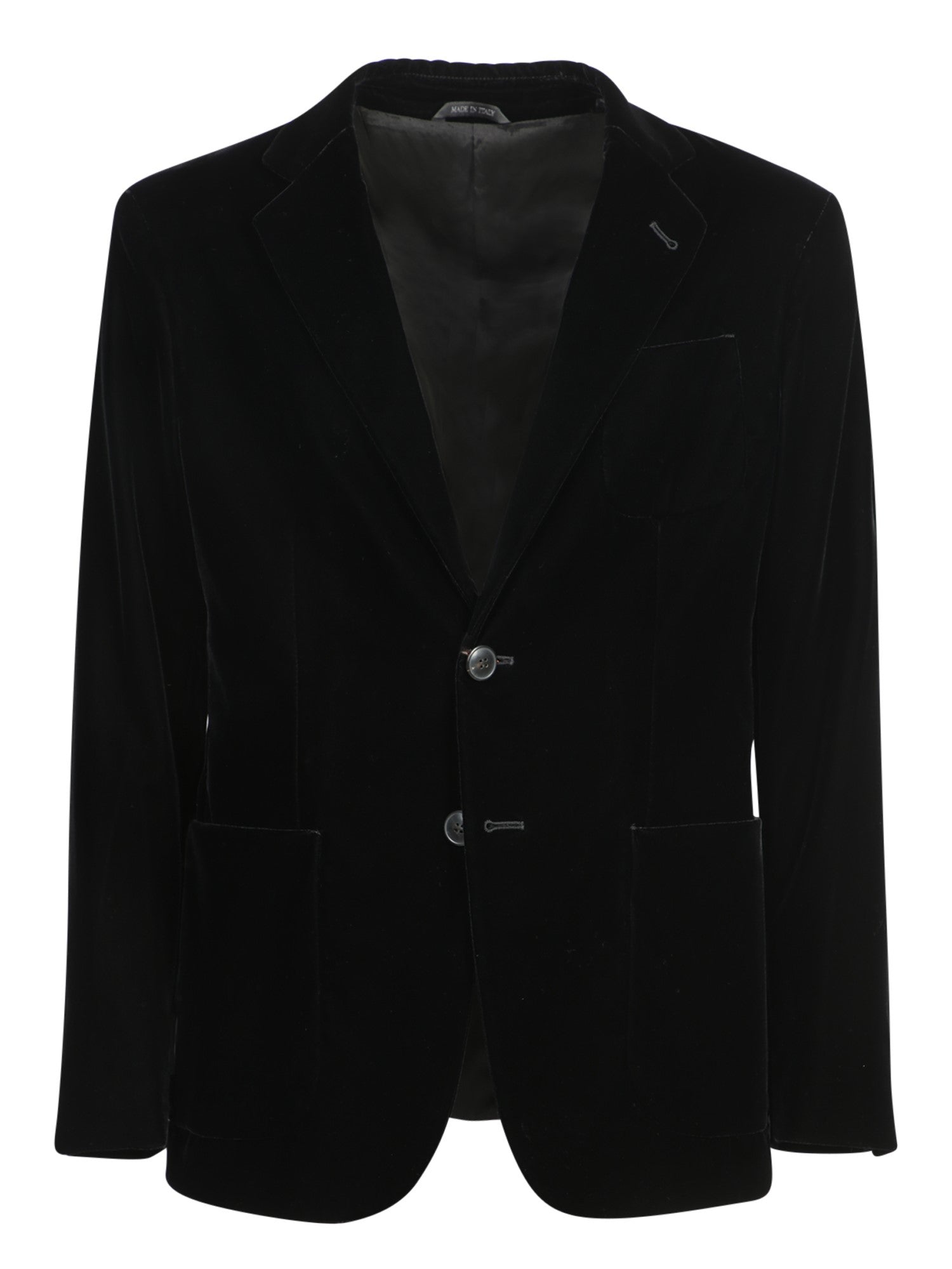 Velvet jacket with classic lapels, two-button closure, and flap pockets.