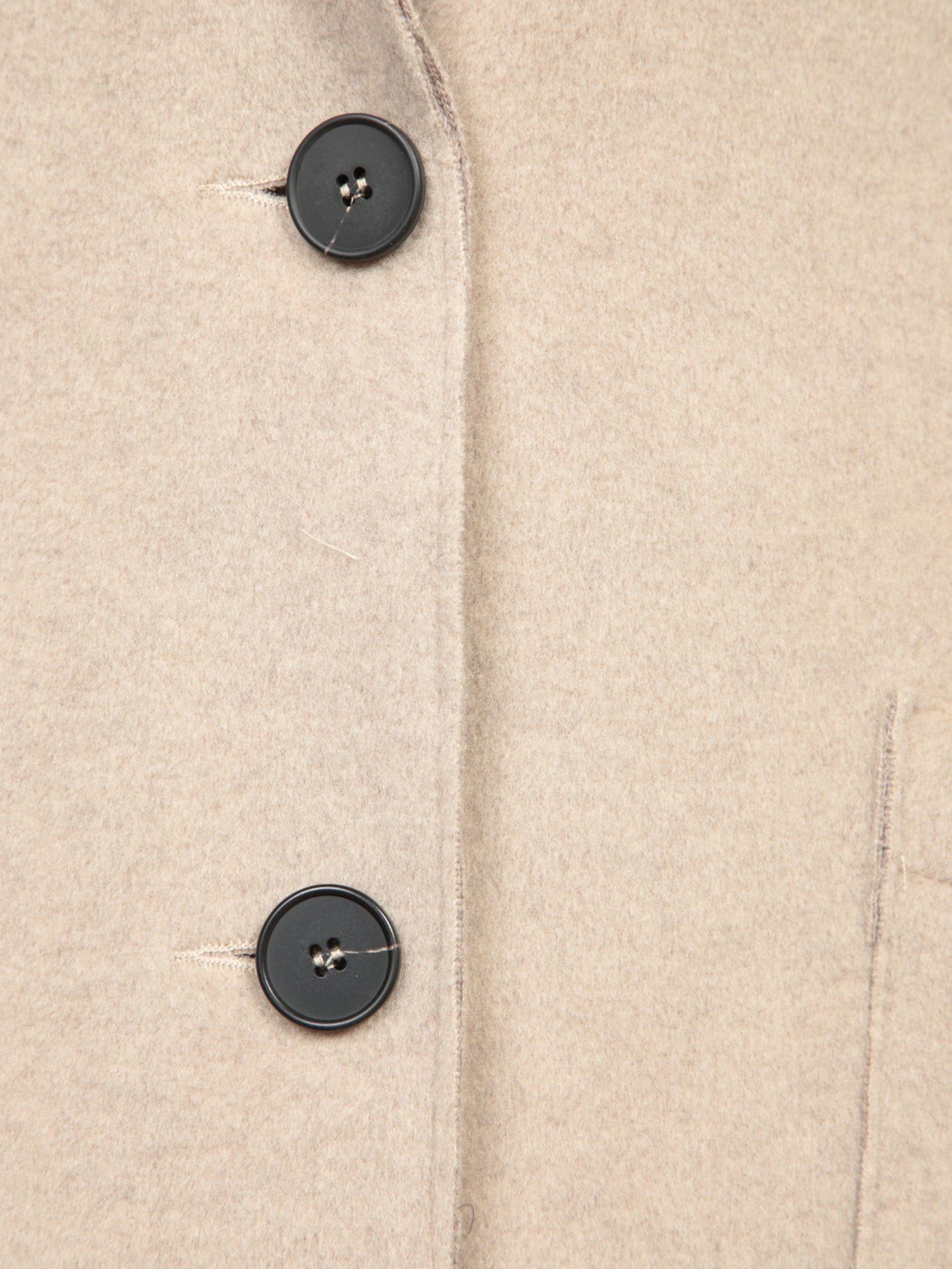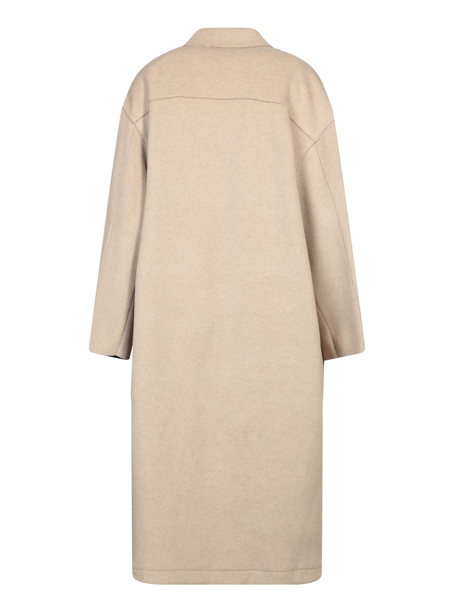 Soft velour fabric coat with a long cut. Features a classic collar, front button closure, and flap pockets.
