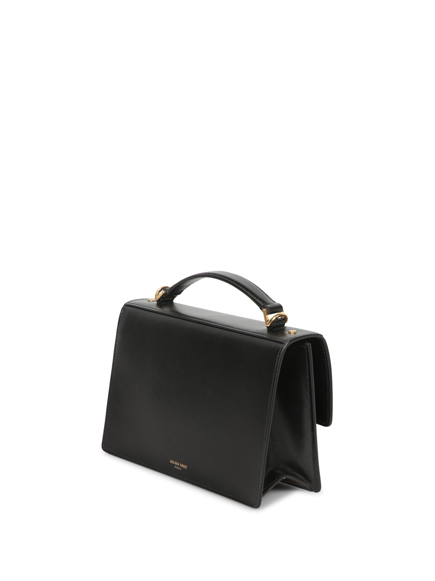 Removable and adjustable shoulder strap. Black leather finish with golden metal details. Snap closure.