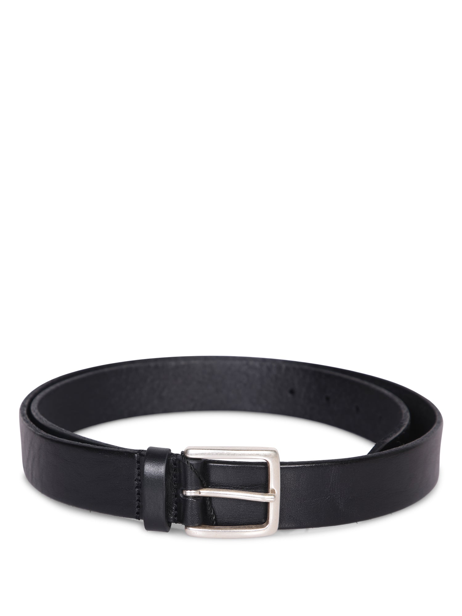 Black leather belt with a rectangular metallic buckle. Slim and classic design.