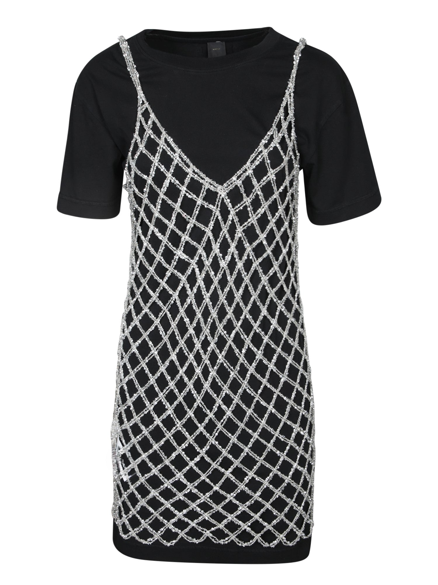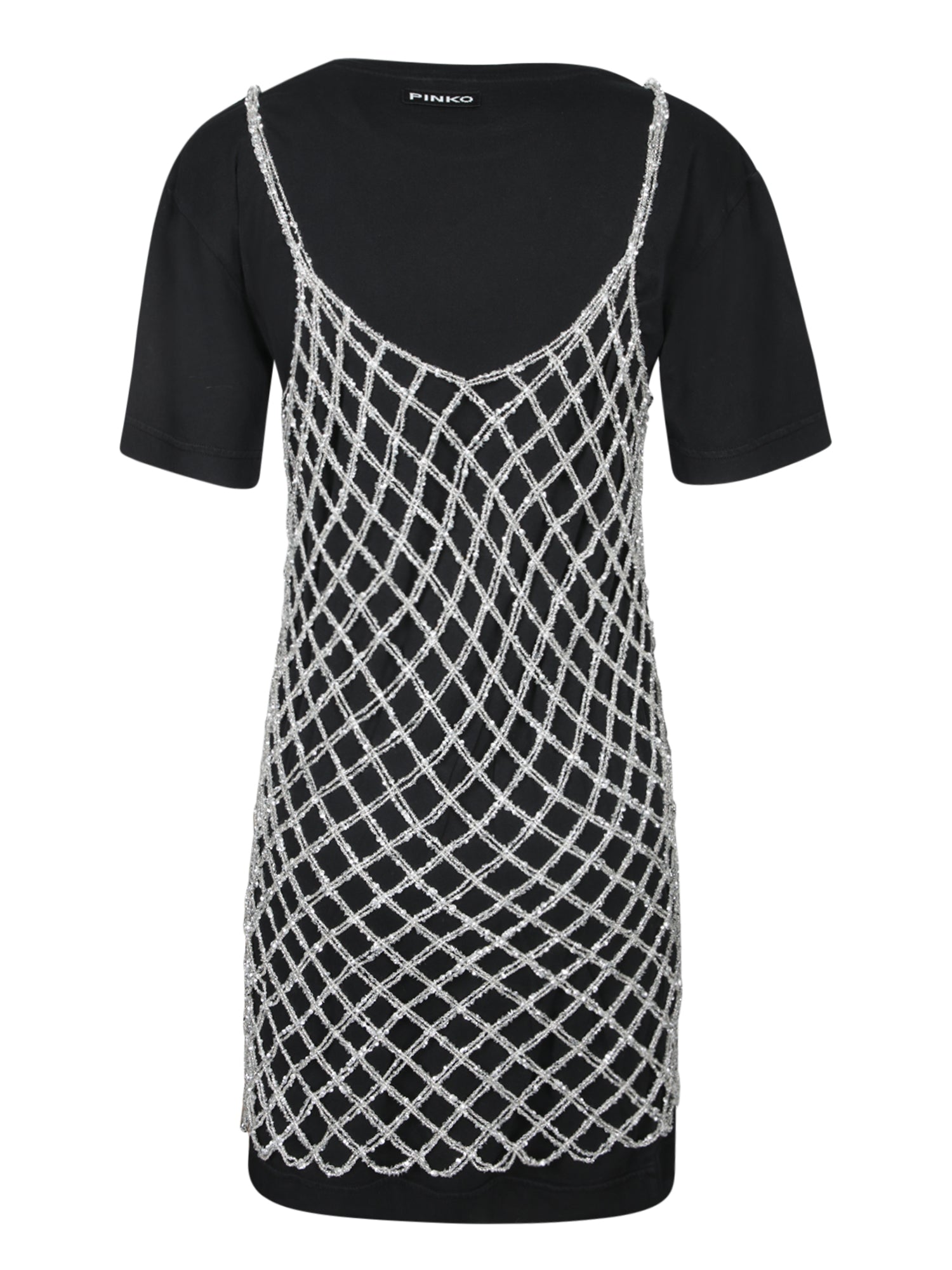 This elegant Pinko dress blends classic black with the originality of silver crochet net inserts, creating a subtle play of transparency that enhances the figure.