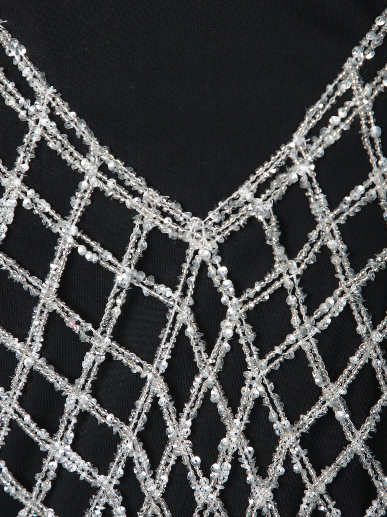 Short sleeve dress. Silver crochet net detailing. V-neckline.