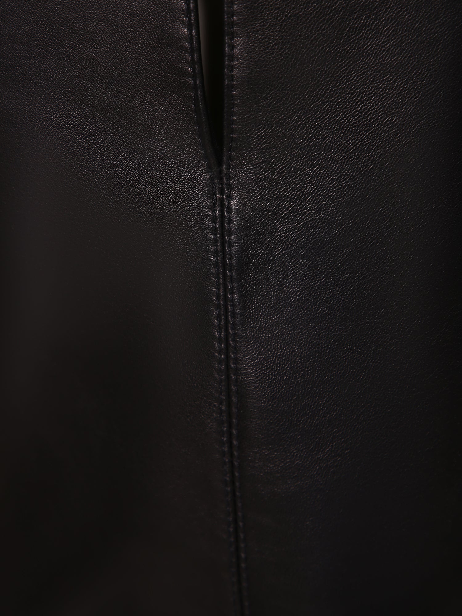 Sleeveless leather top. Back zipper closure. Round neckline.