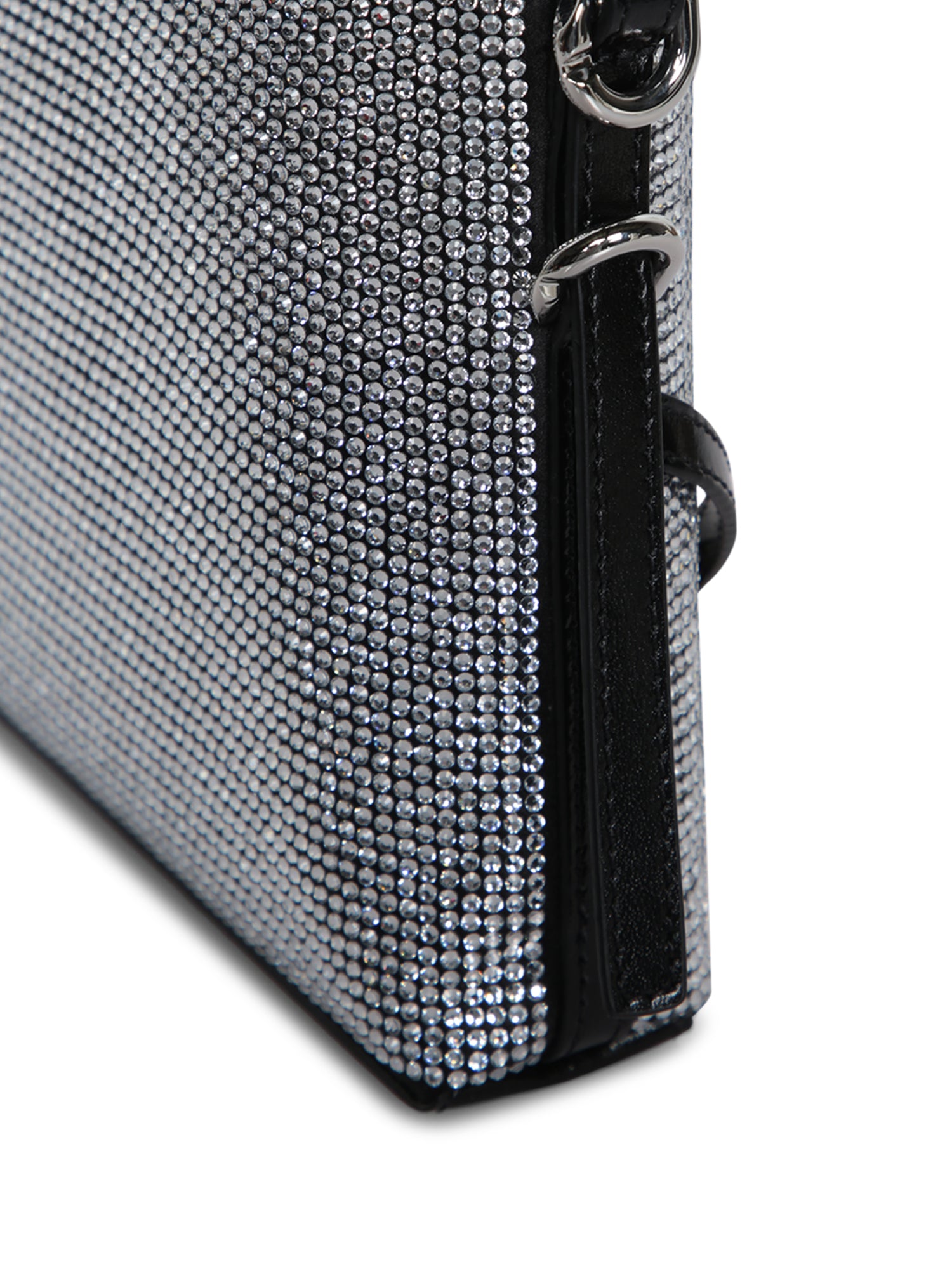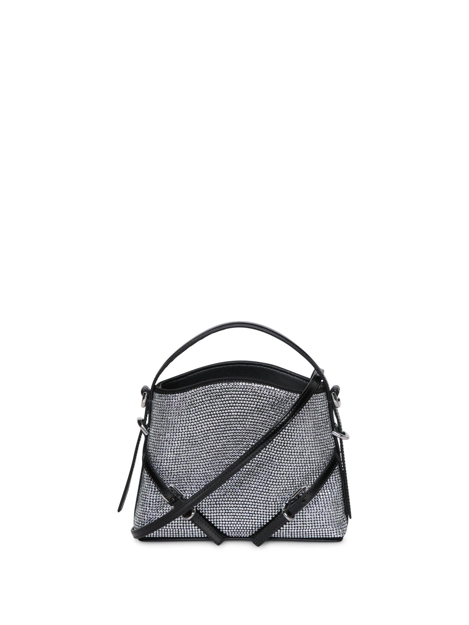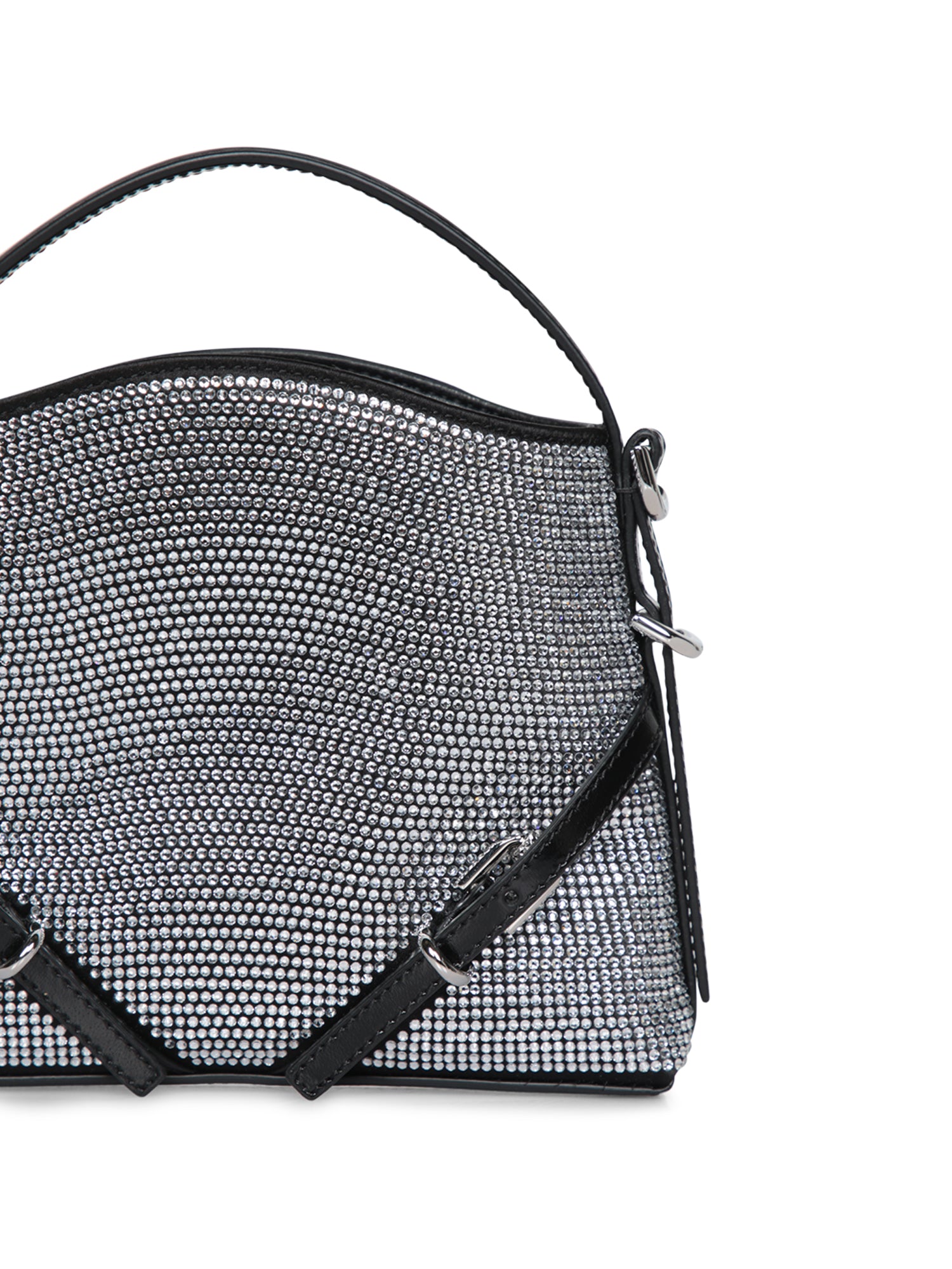 Silver crystal shoulder bag. Geometric design with black leather details. Flap and buckle closure.