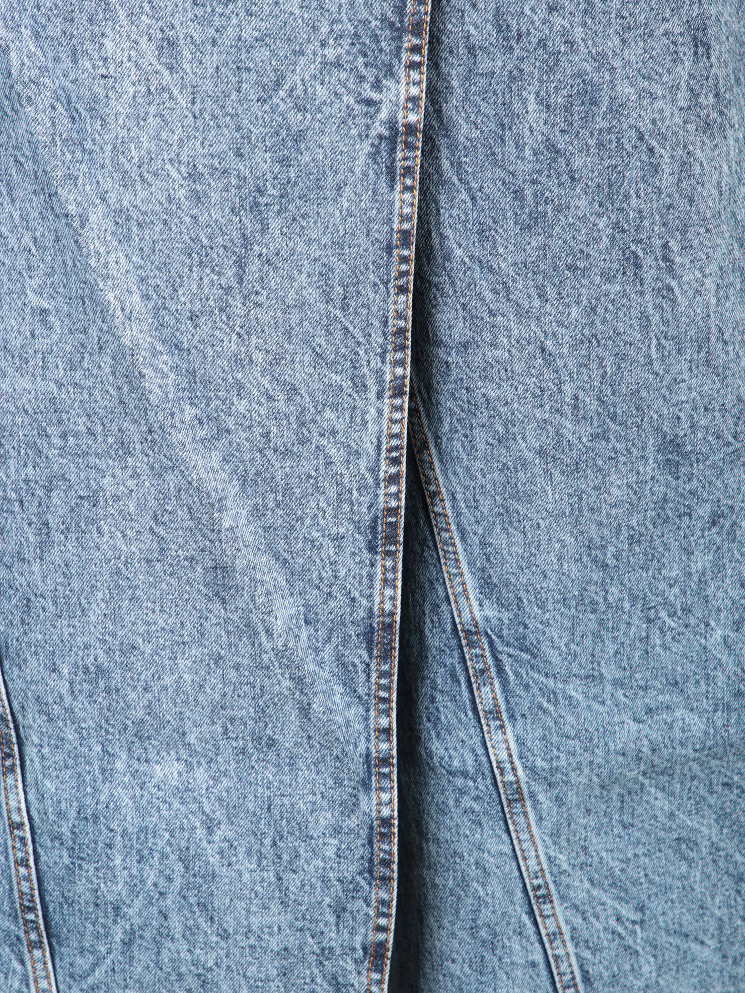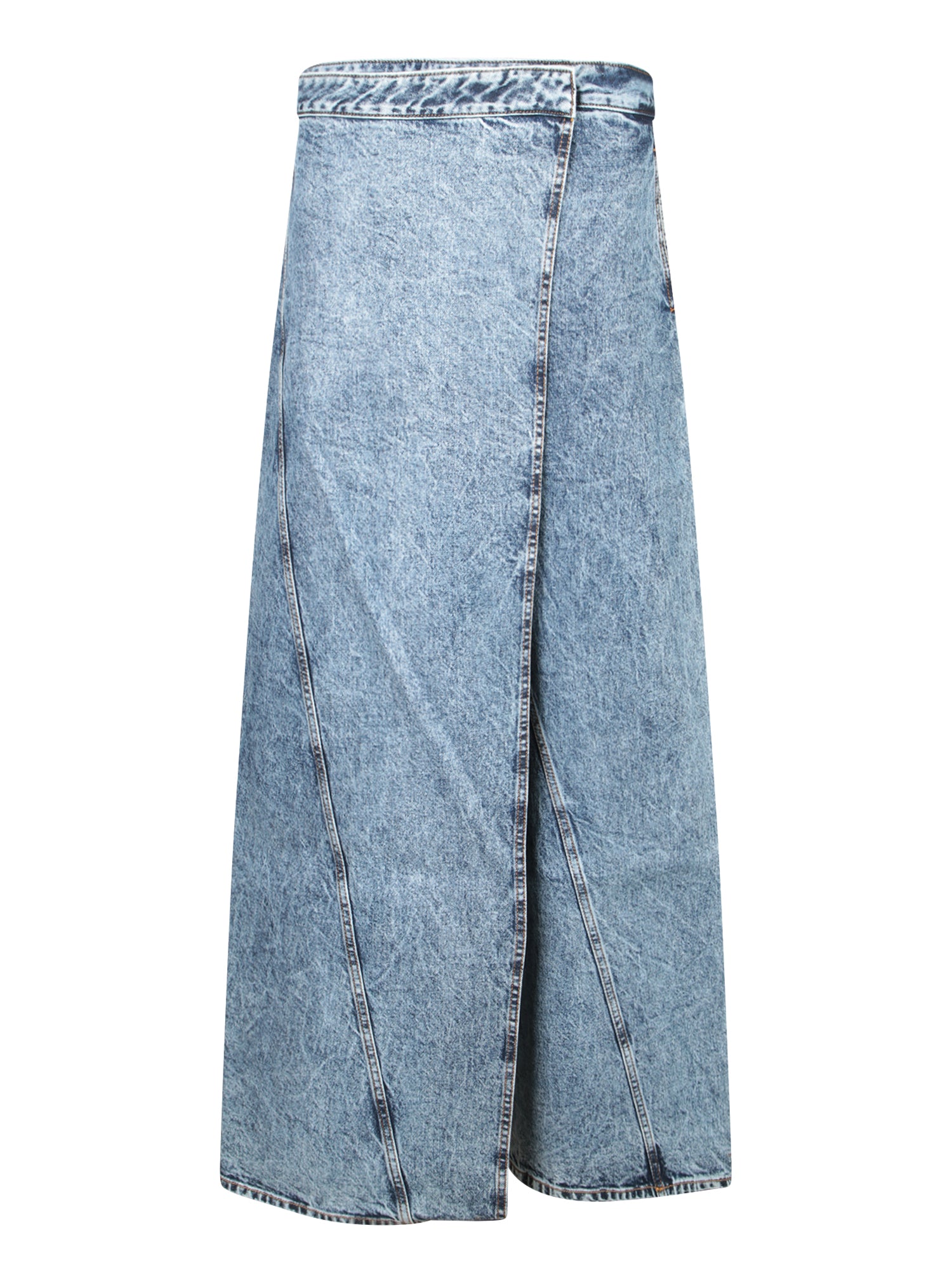 Wrap-around denim skirt. High waist with zebra detail. Button closure.