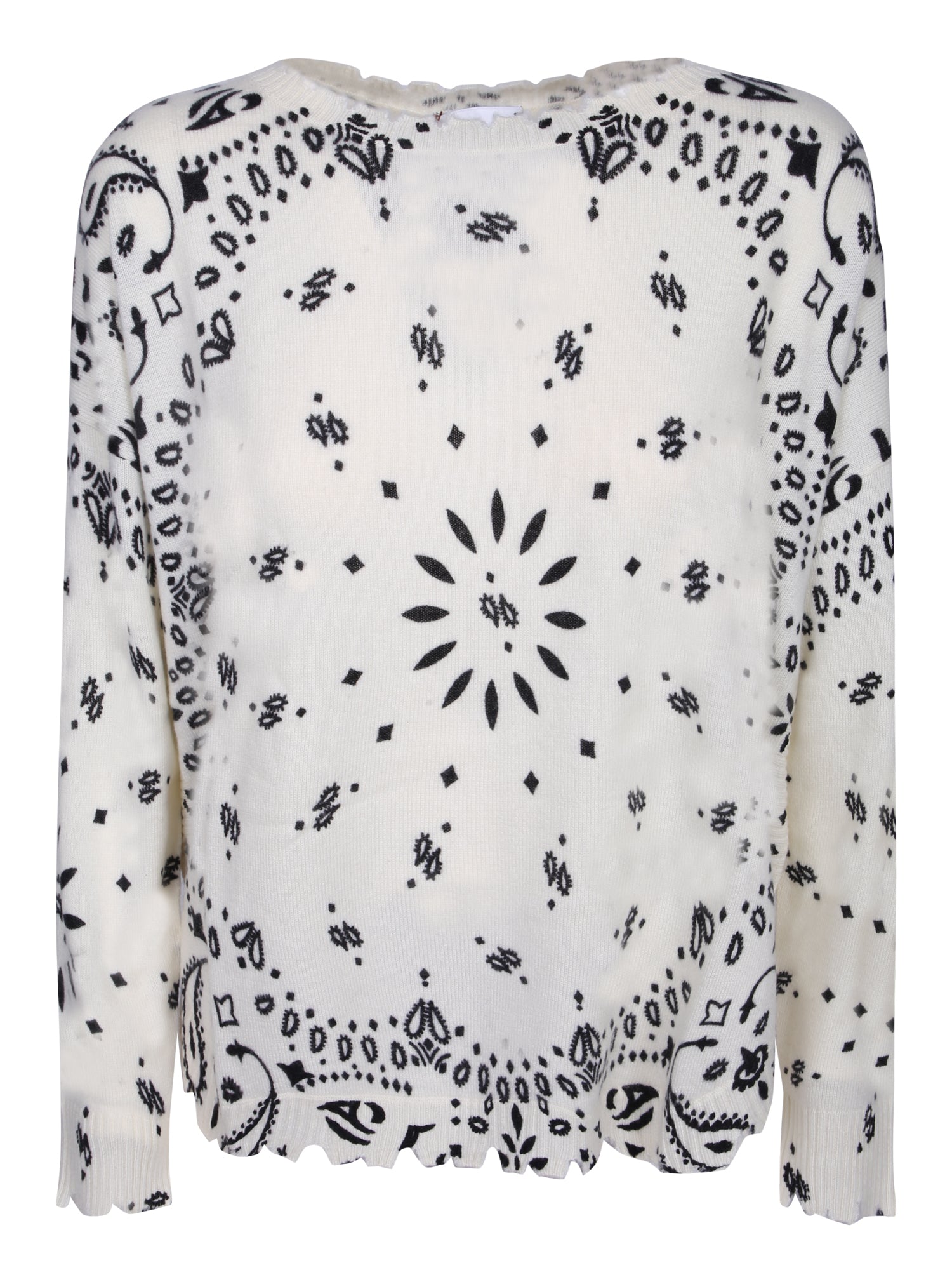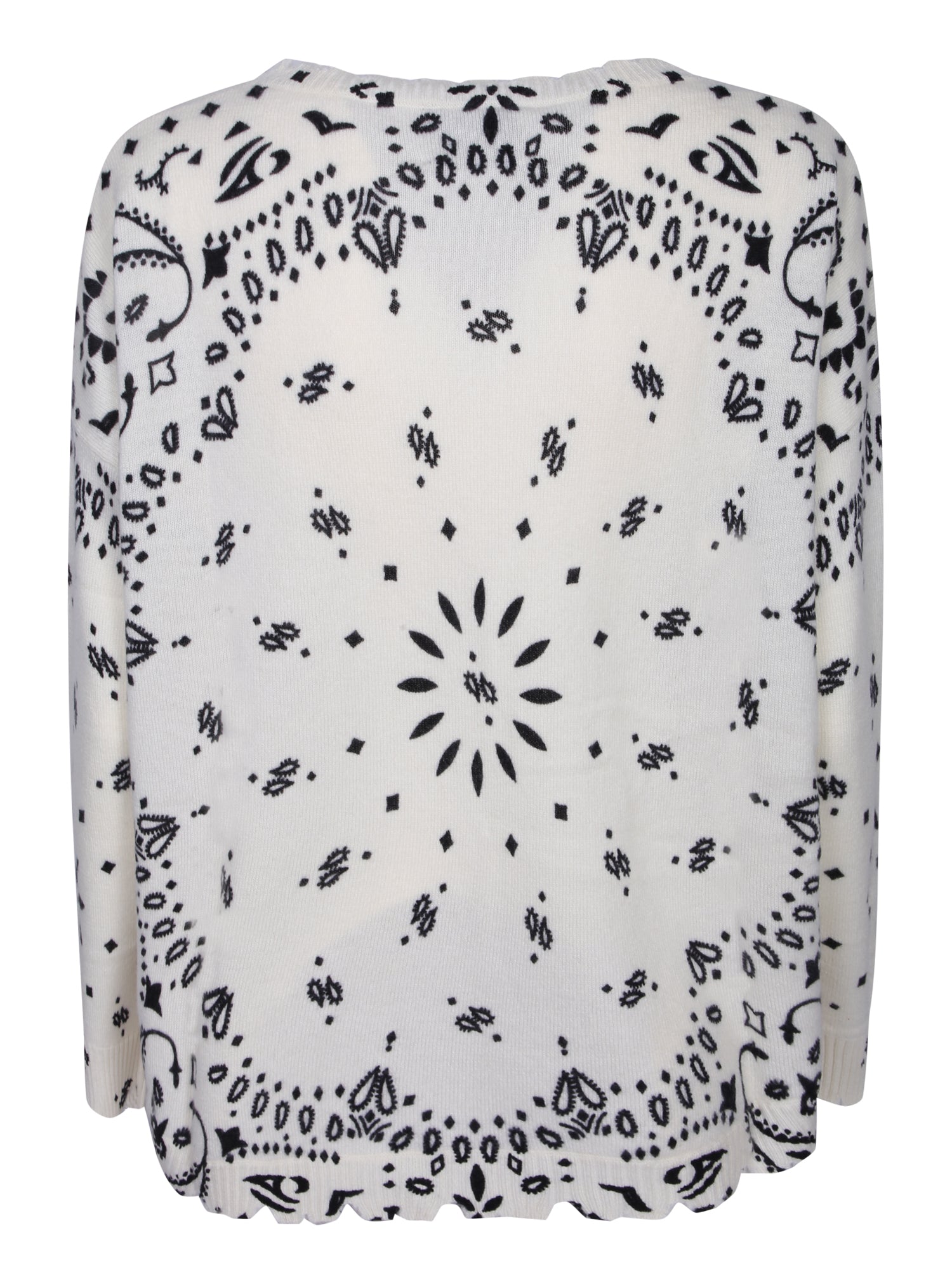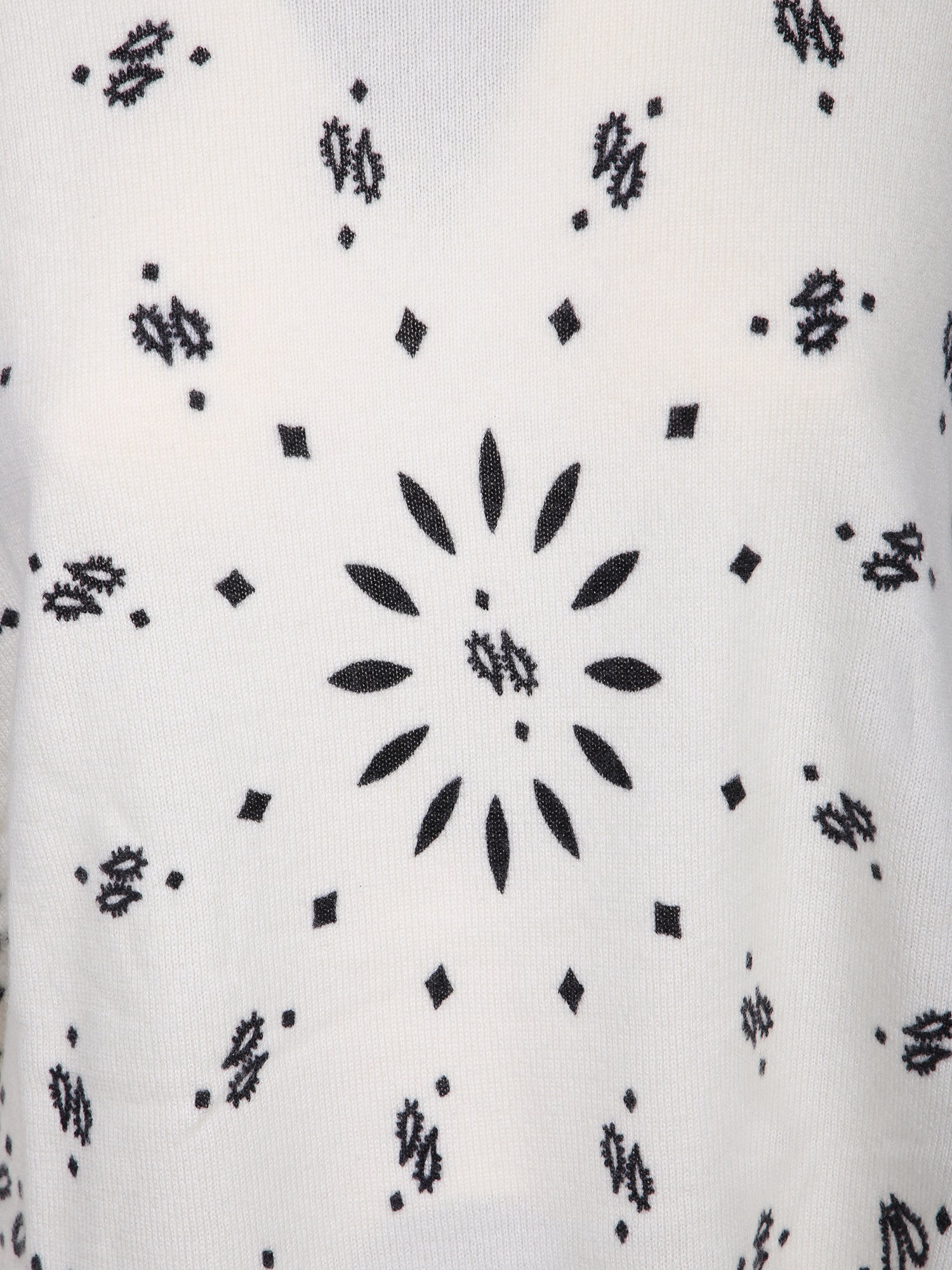 Fine knit crewneck sweater. Black bandana print on a white base. Ribbed trimmings.