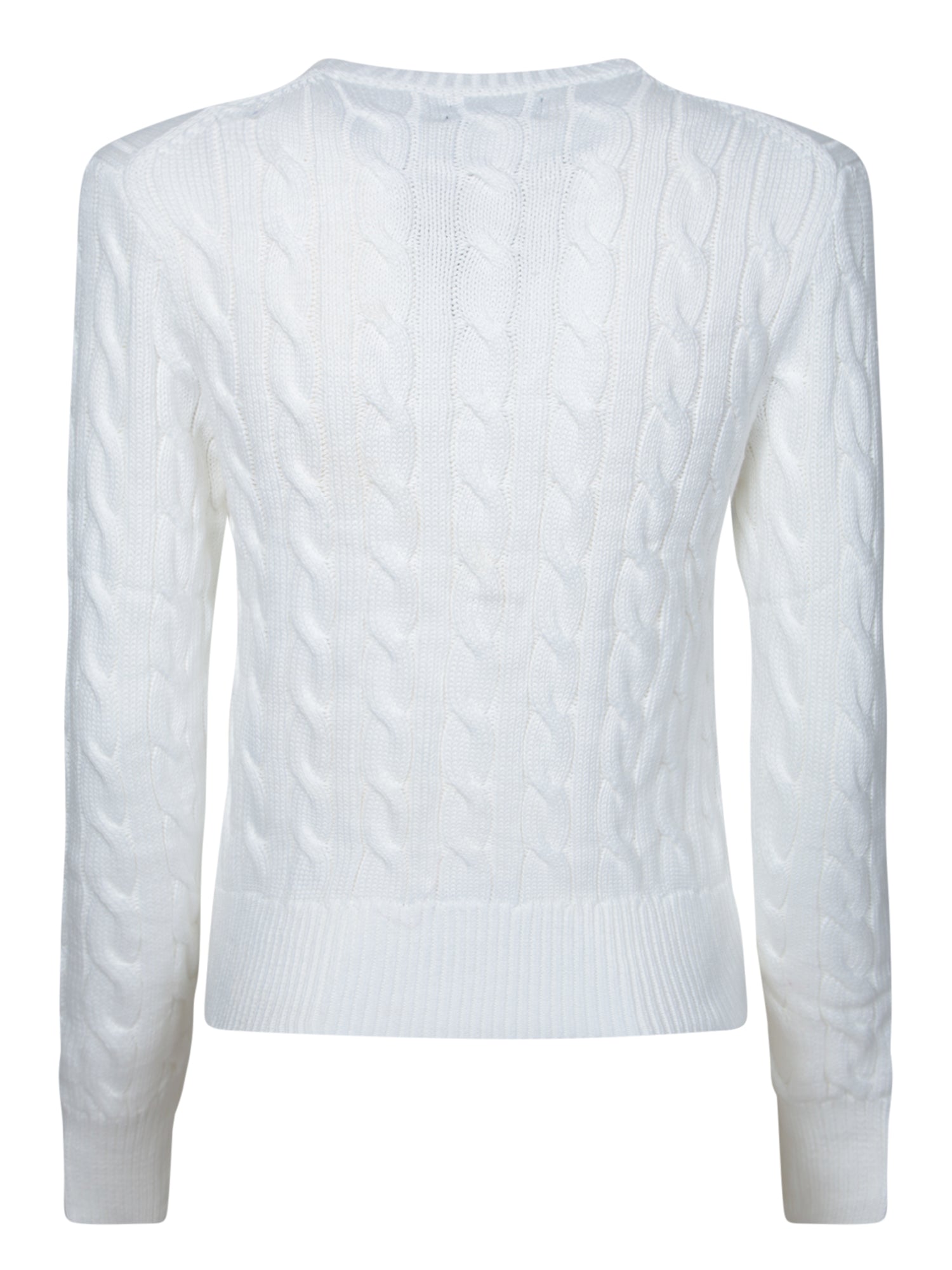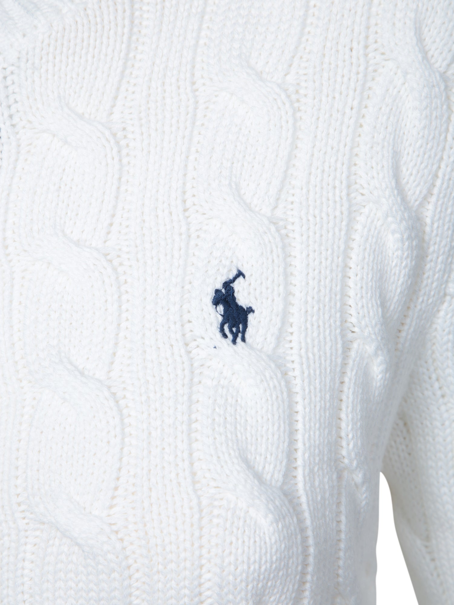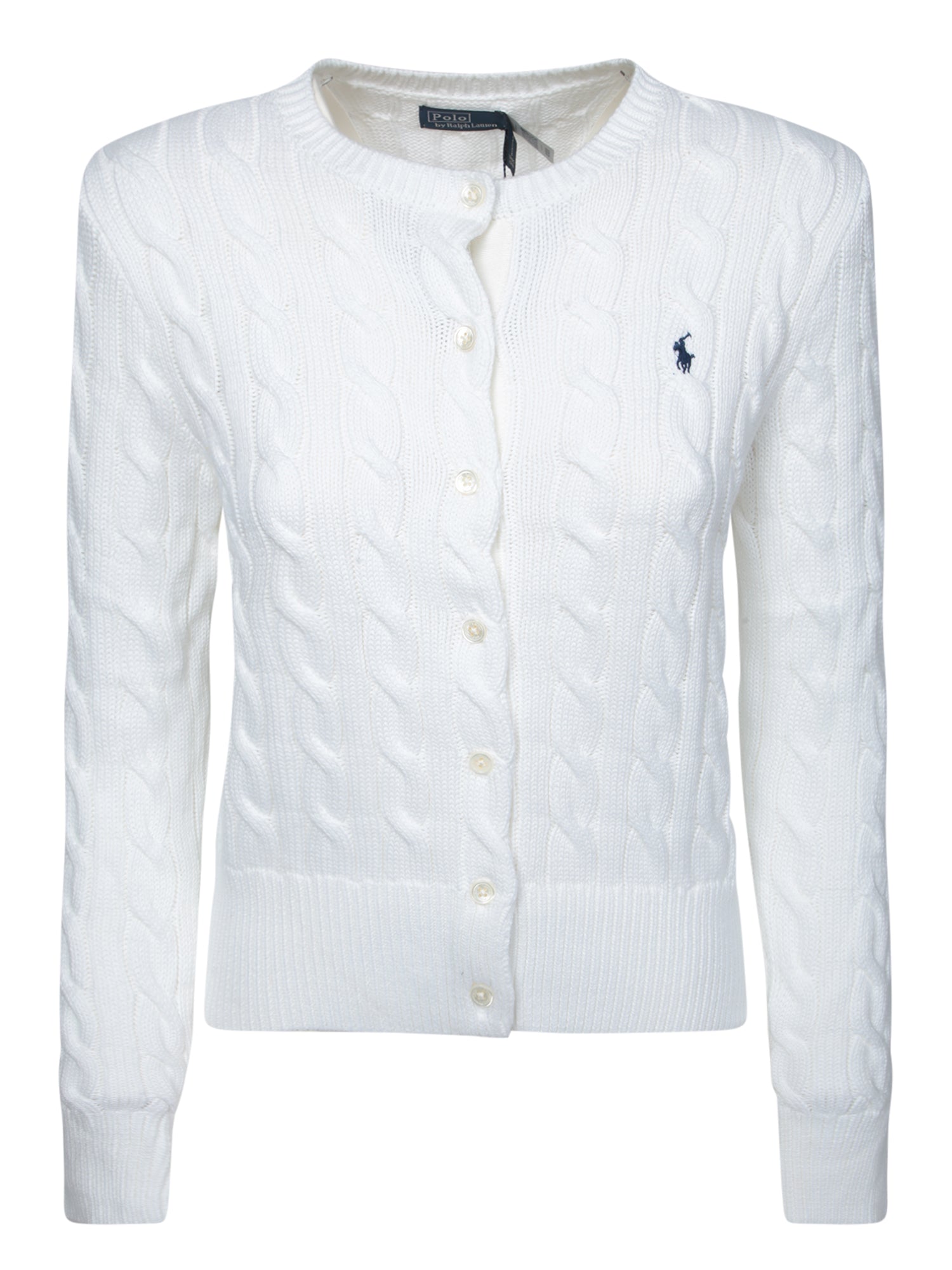 This Polo Ralph Lauren white cable knit cardigan offers a classic and versatile look. Perfect for a preppy style, the sophisticated design is complemented by an elegant button closure and a subtle chest logo.
