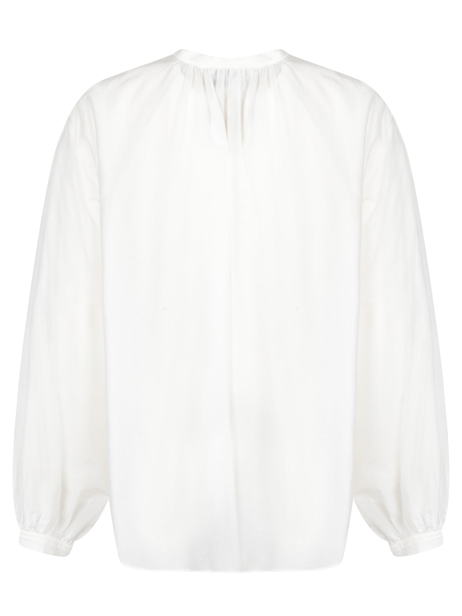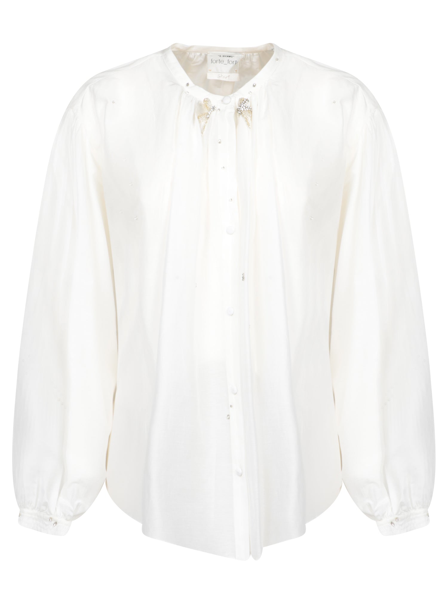 Long sleeves with buttoned cuffs. Round neck with rhinestone embroidered details.