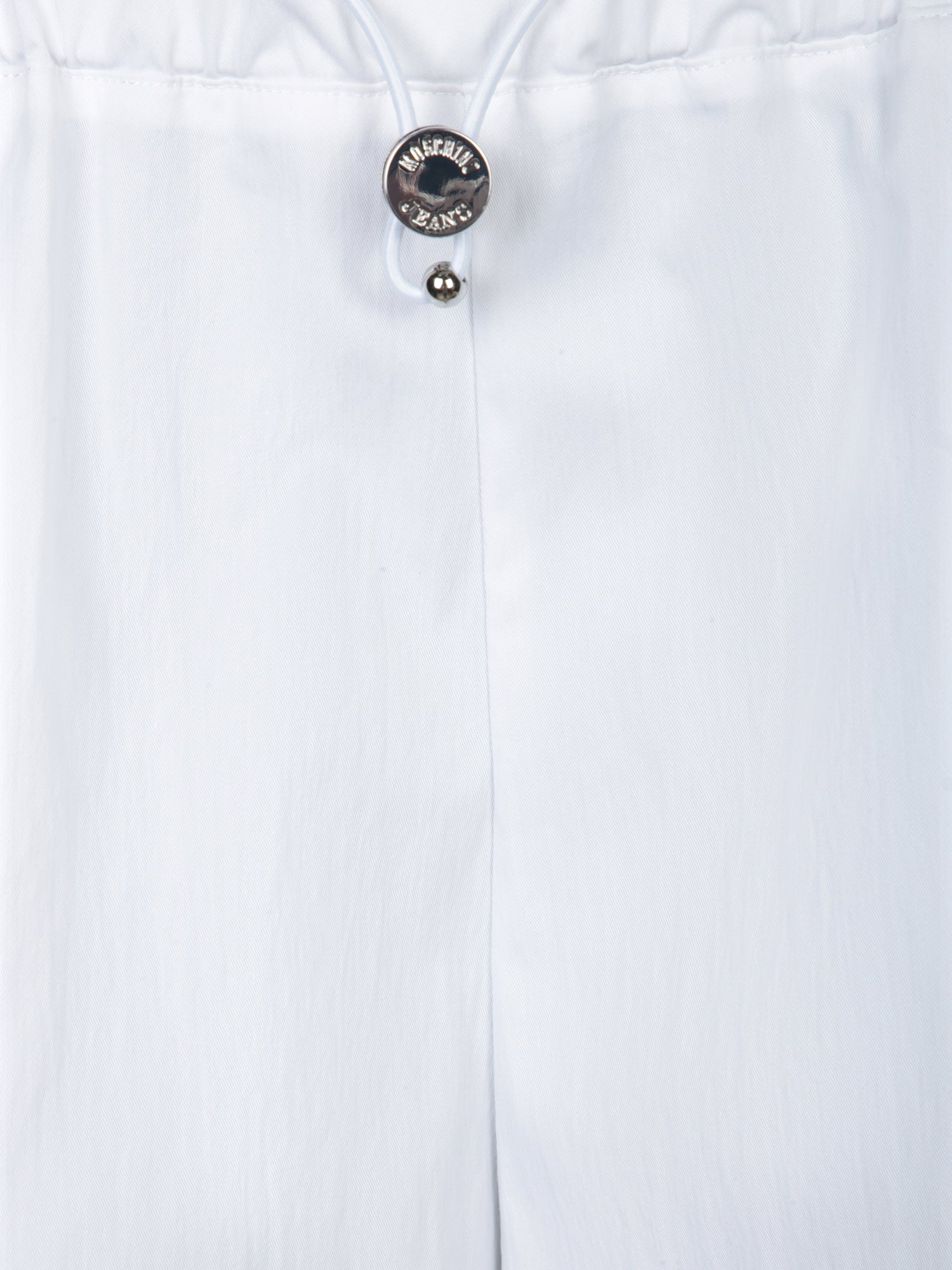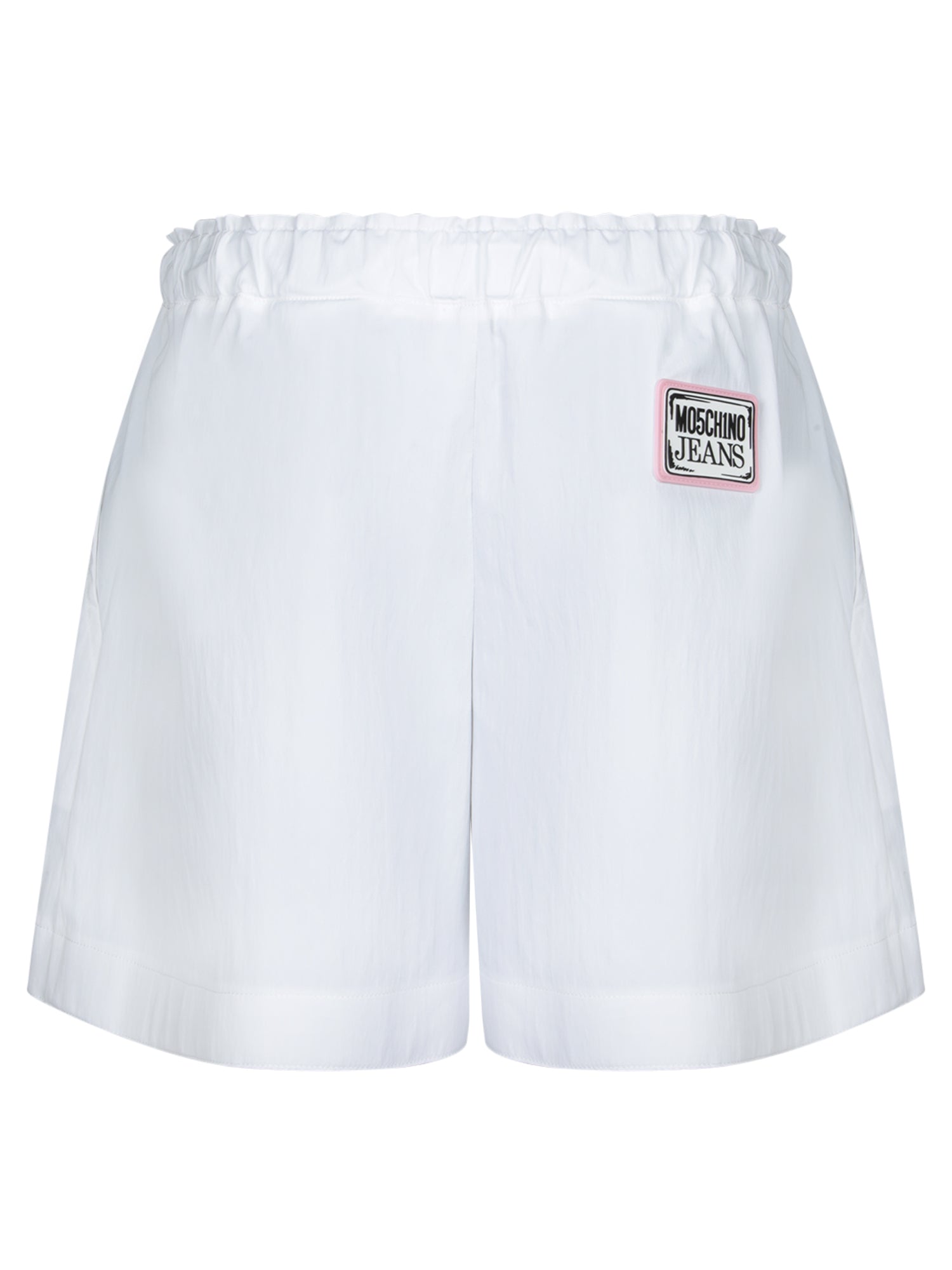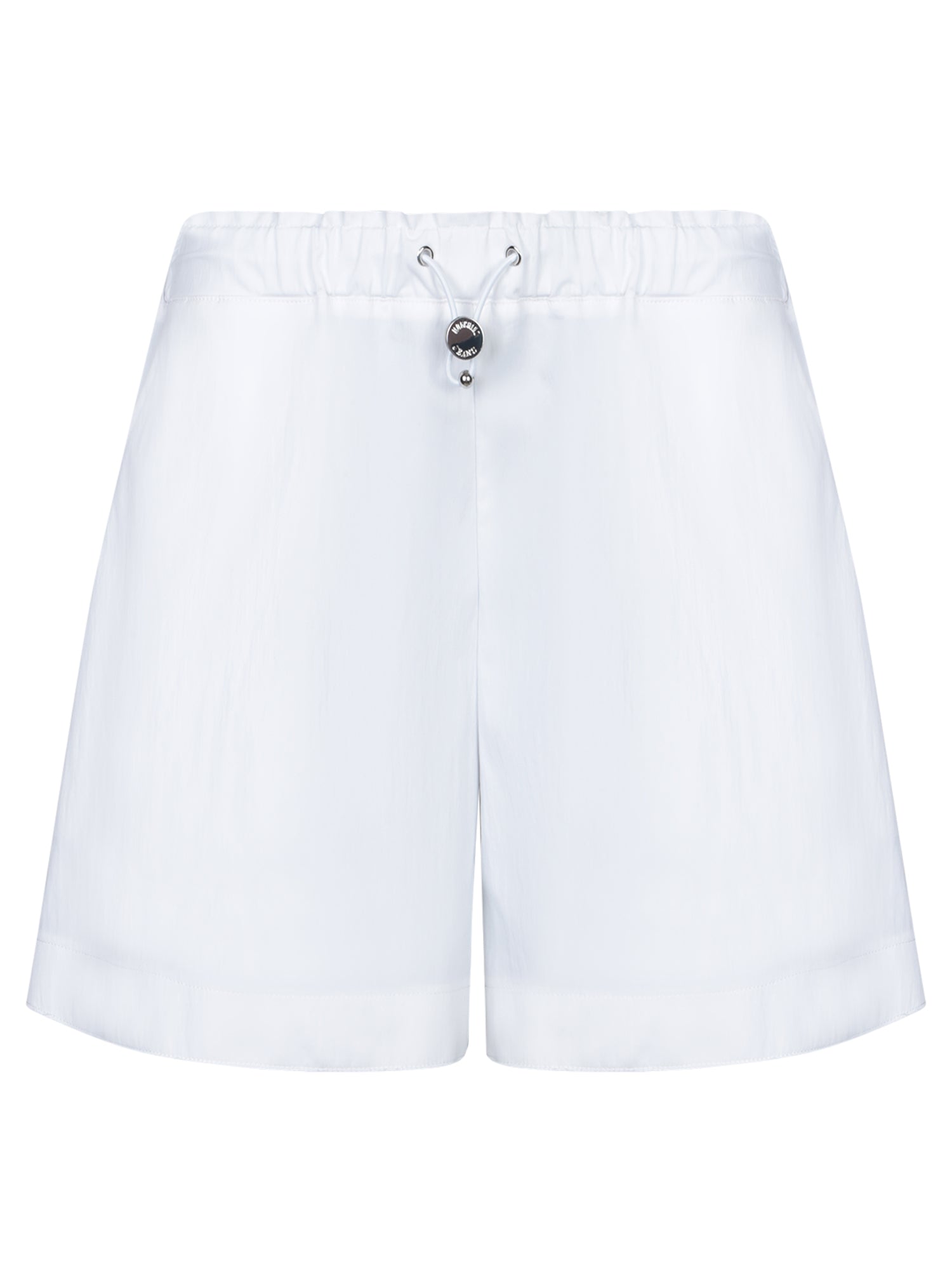 White shorts. Elastic waistband with drawstring. Metallic logo detail.