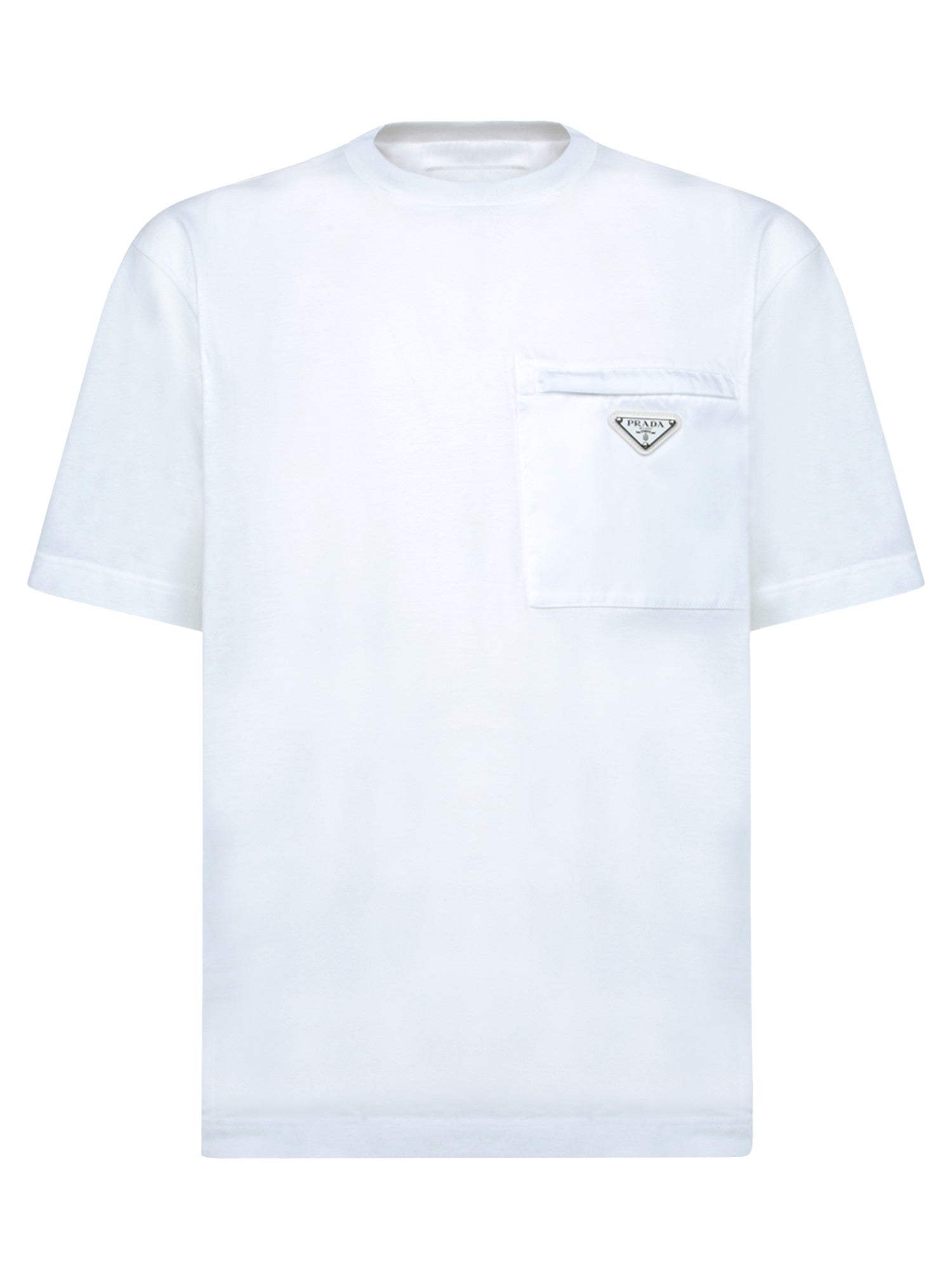 This Prada T-shirt embodies minimalist design with a luxurious twist. The chest pocket features a distinctive Prada metal logo, adding an exclusive detail to an otherwise simple piece.