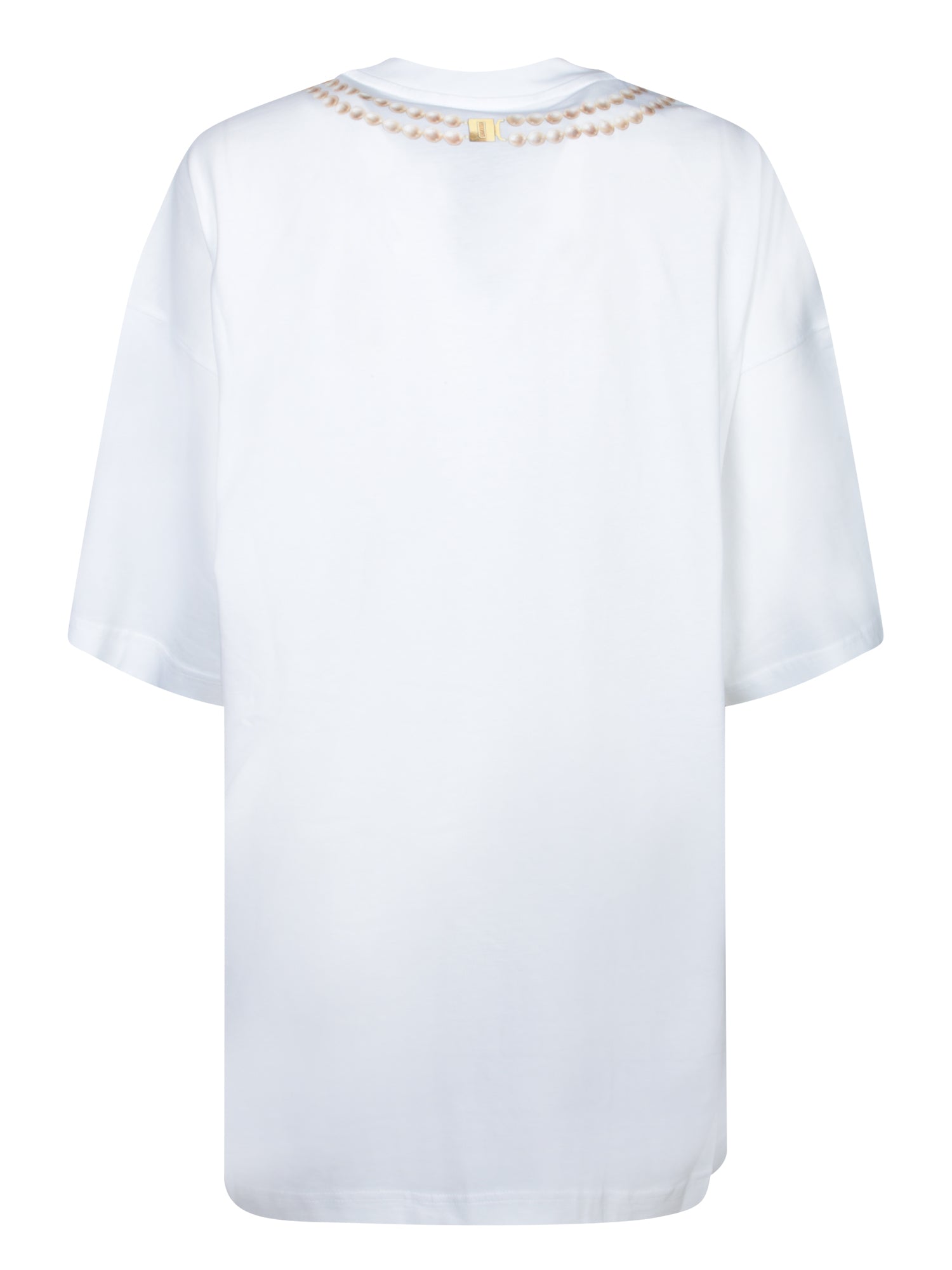 This stylish MOSCHINO t-shirt captures the essence of the Spring Summer 2025 collection with its bold and sophisticated design. The high-quality cotton provides comfort and durability, while the creative print and the illusion of a pearl necklace add a to