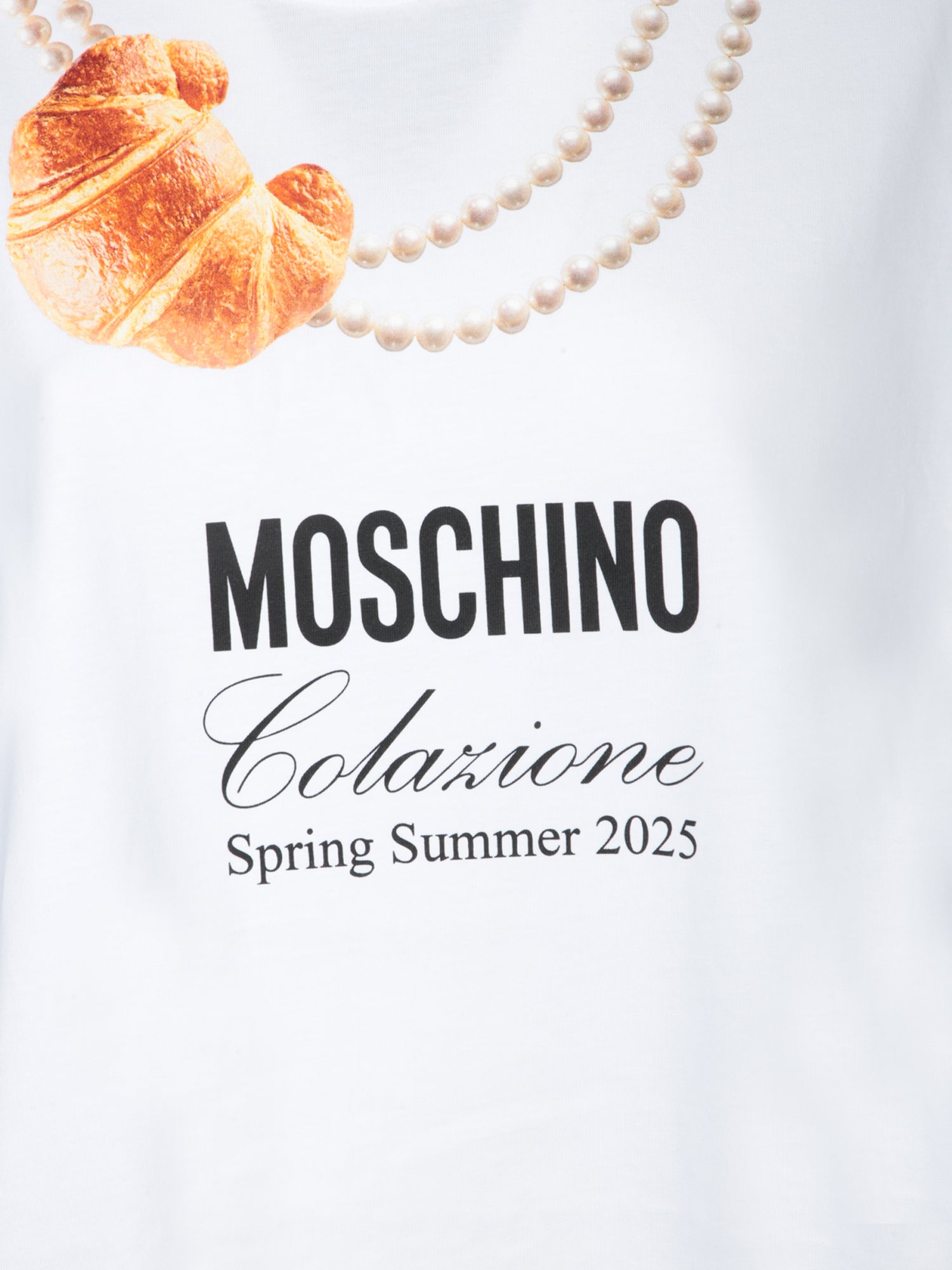Short sleeve, crew neck cotton jersey t-shirt. Features a front graphic print with MOSCHINO logo details and a pearl necklace.