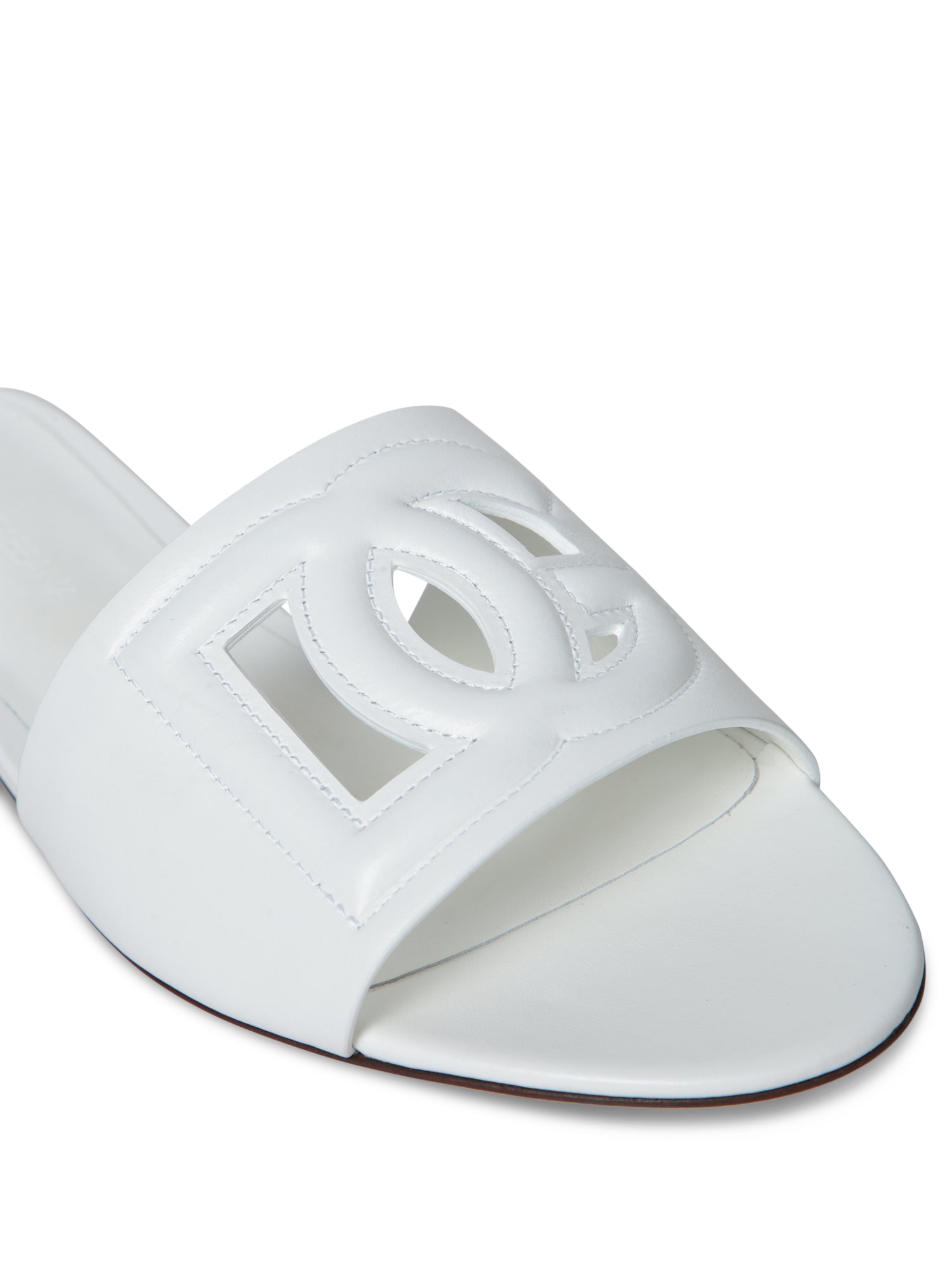 Elegant and minimalist, this Dolce & Gabbana white smooth calfskin sandal provides discreet comfort and luxury, embellished with a distinctive metallic logo on the upper.