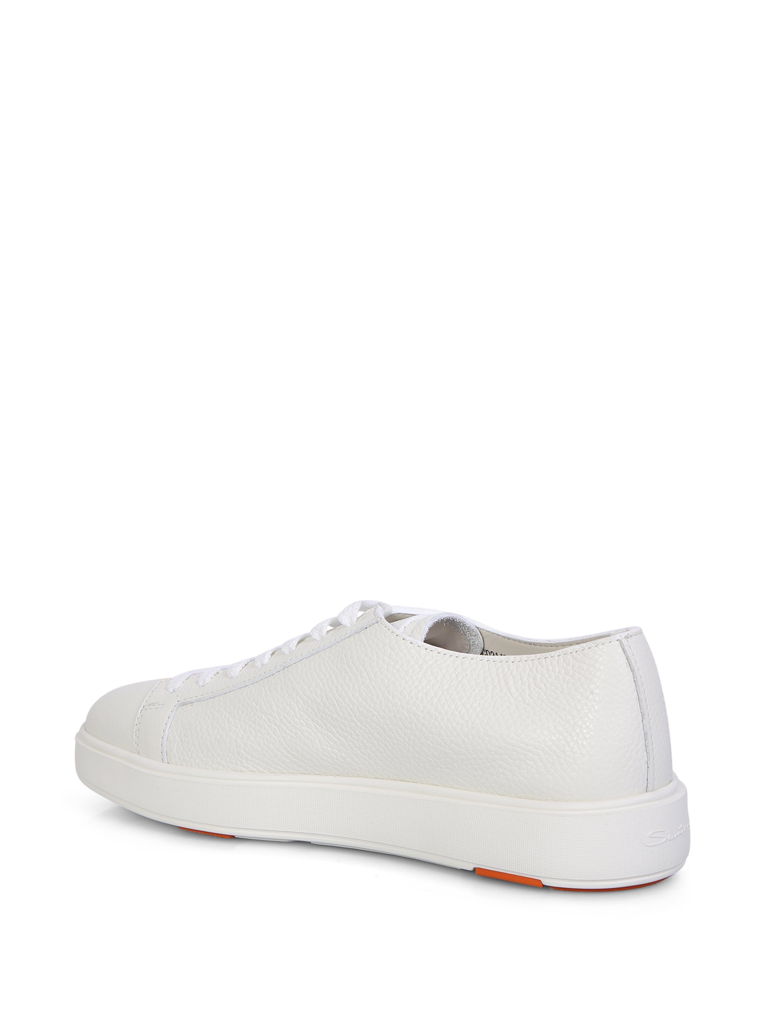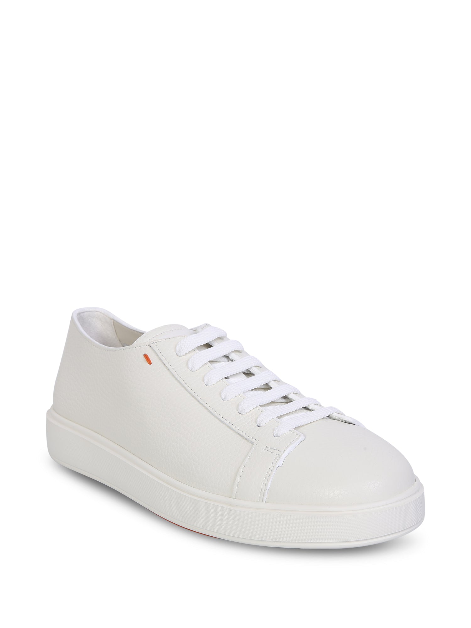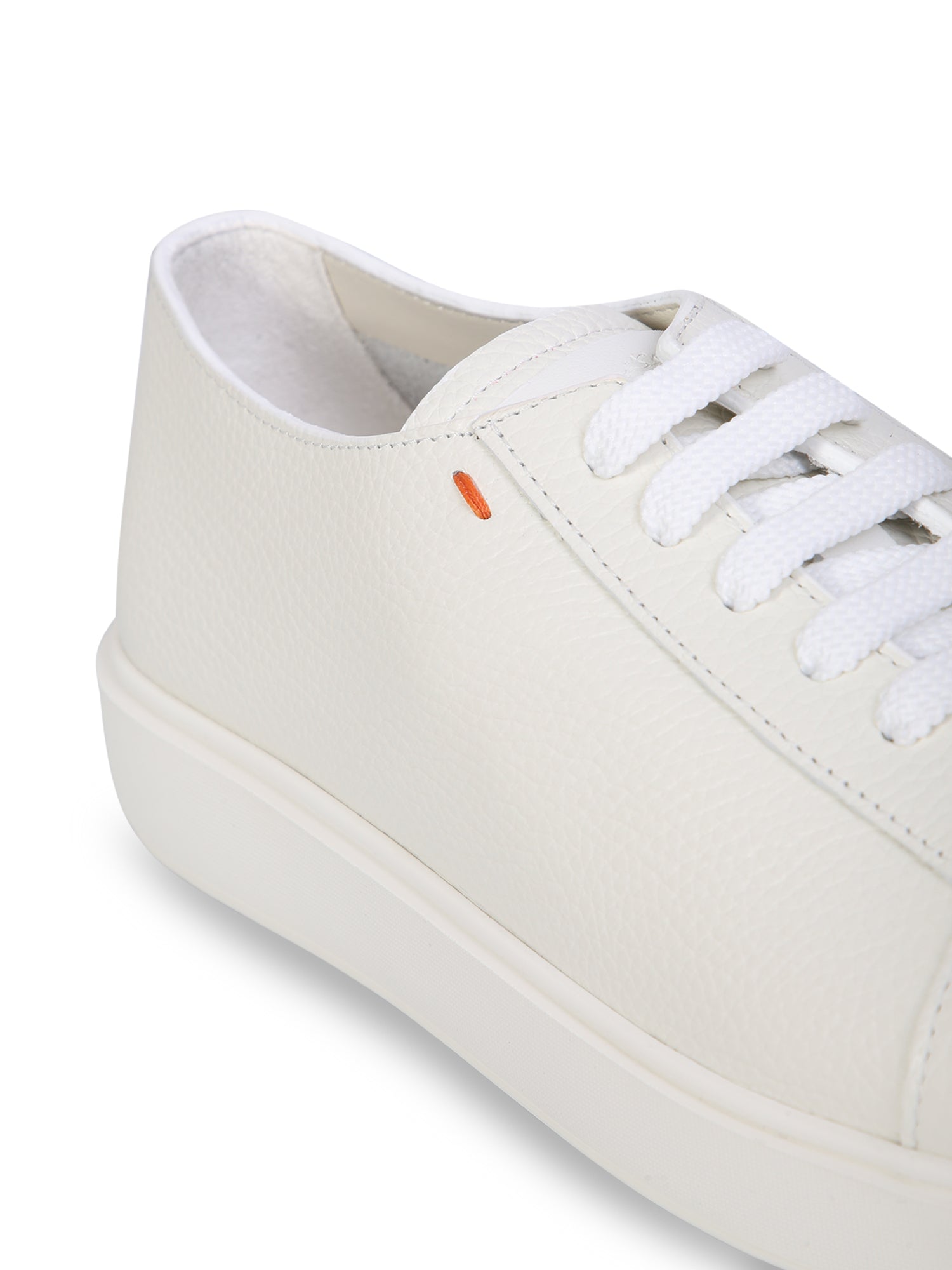 Grain texture. Wide shape and rounded toe. Logo-embossed leather details on tongue. Lace-up closure. Rubber crate sole. Santoni logo embossed on insole. Color: White.