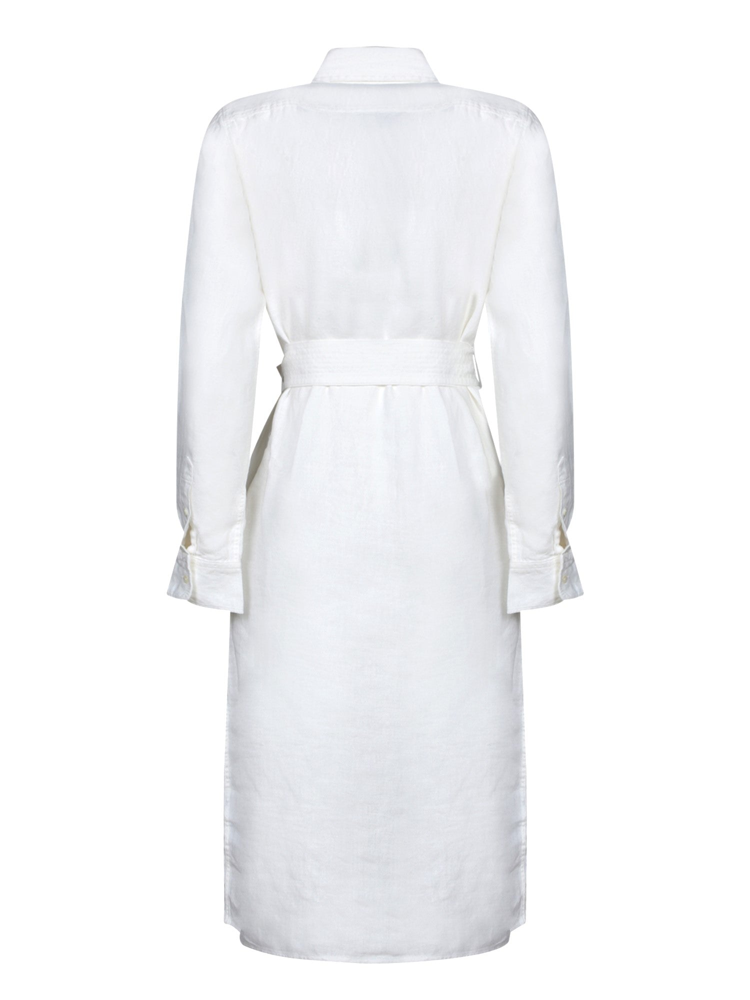 Long-sleeve linen dress. Front button closure. Coordinated fabric belt.